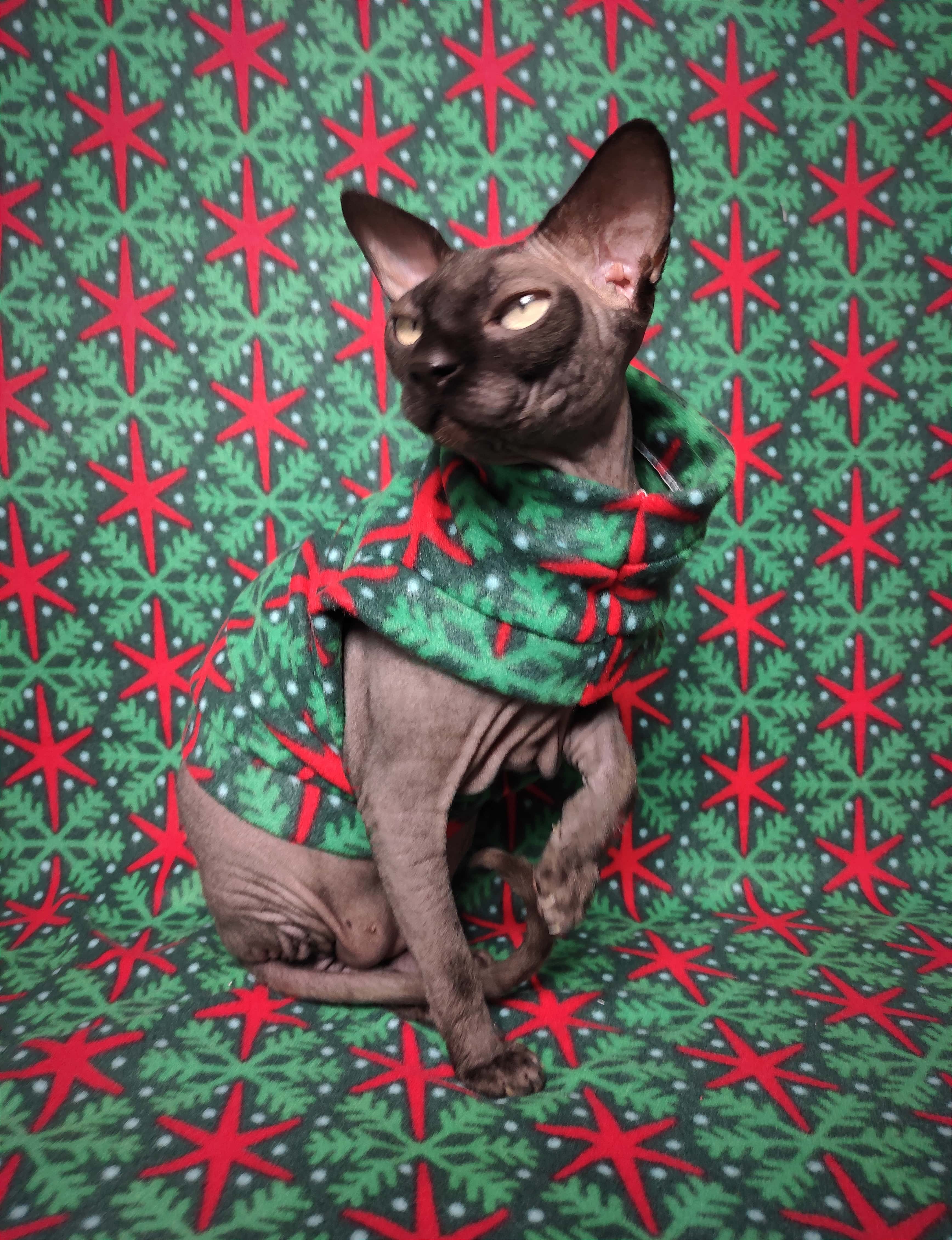 REGULAR size is for most adult hairless cats age 1 to 18. BAMBINO size fits hairless kittens age 6 months to 1 year and smaller adult cats. LIL NIPPER size fits hairless kittens age 8 weeks to 15 week olds for when they are with the breeder or for the trip home. Custom orders are welcome for larger and smaller cats - pricing is the same - $27.50