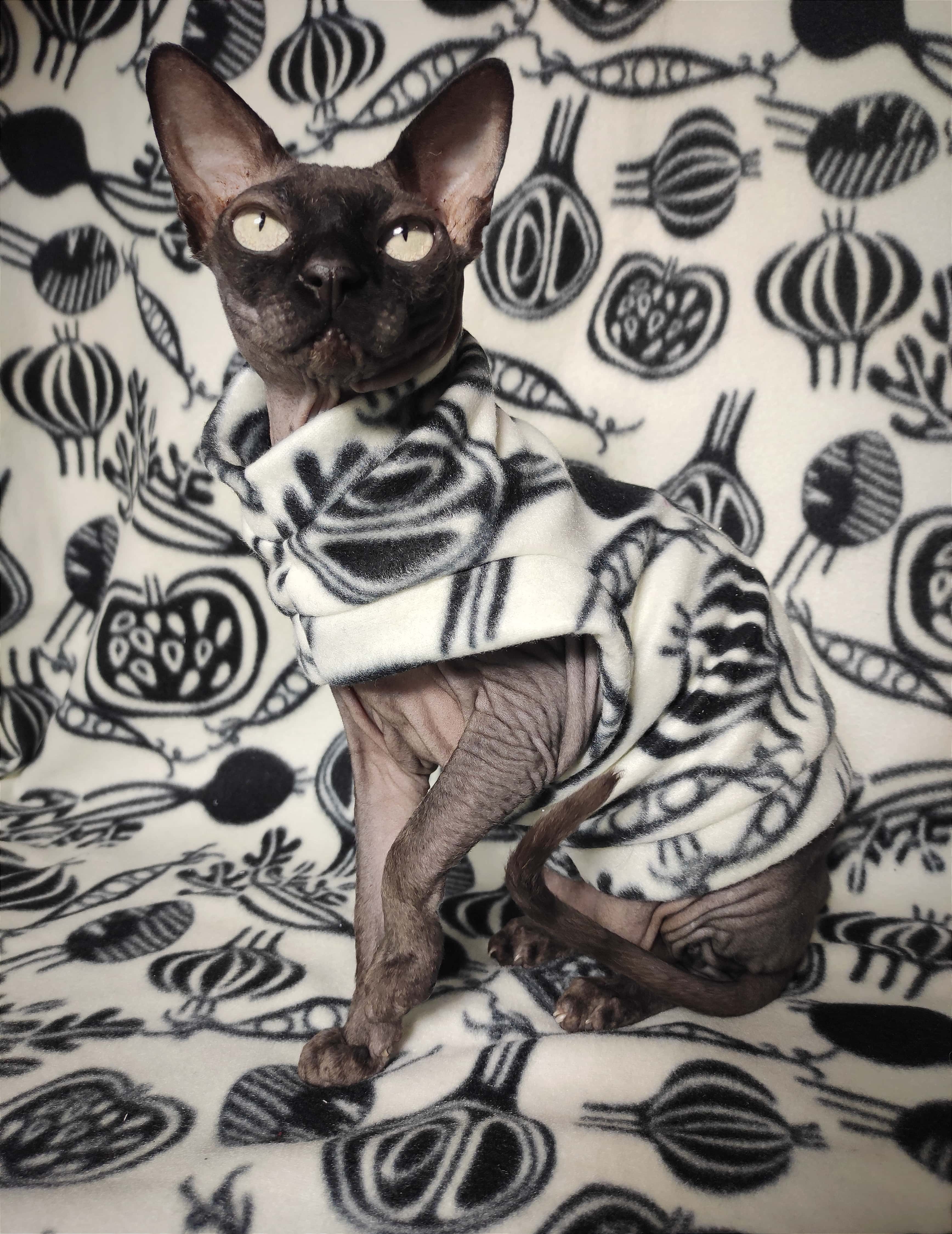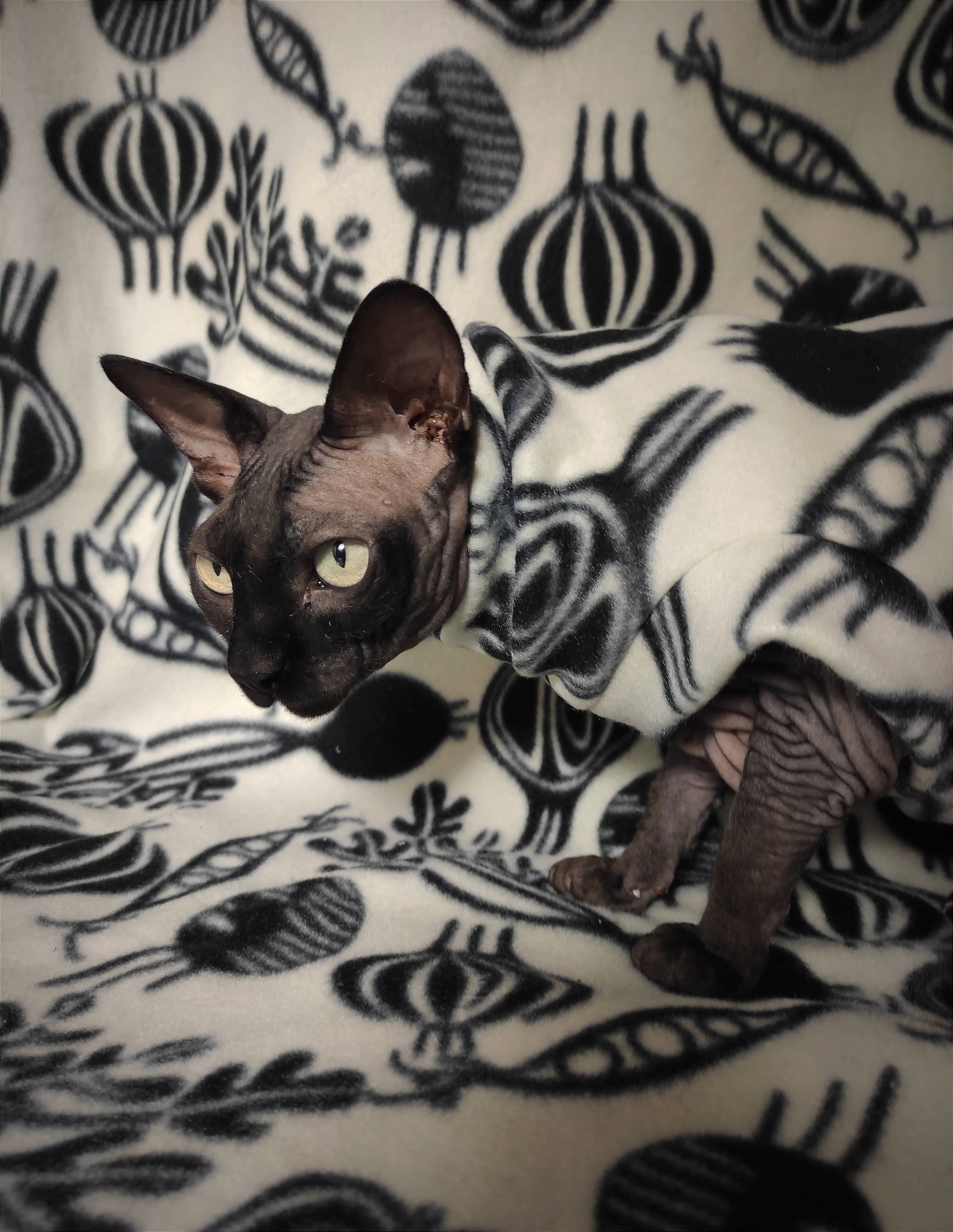REGULAR size is for most adult hairless cats age 1 to 18. BAMBINO size fits hairless kittens age 6 months to 1 year and smaller adult cats. LIL NIPPER size fits hairless kittens age 8 weeks to 15 week olds for when they are with the breeder or for the trip home. Custom orders are welcome for larger and smaller cats - pricing is the same - $27.50