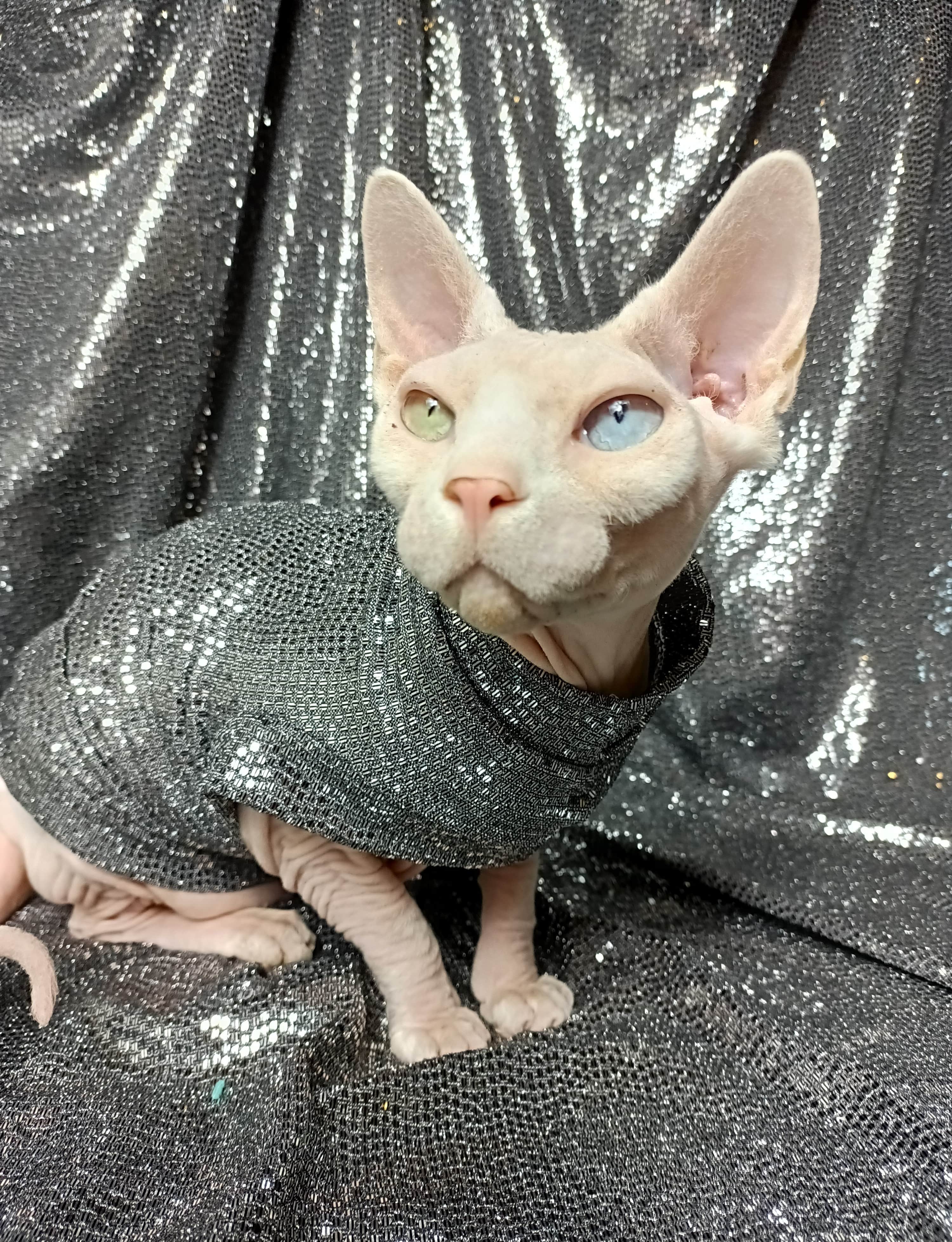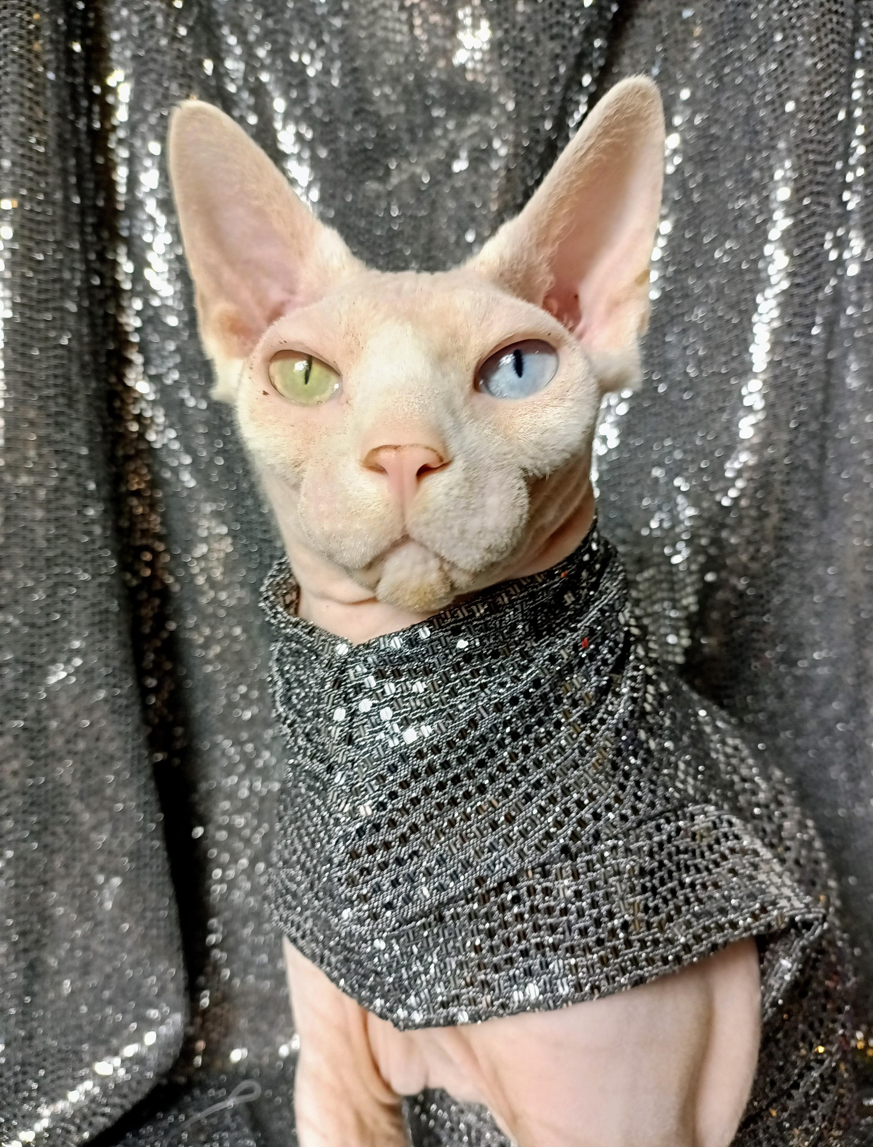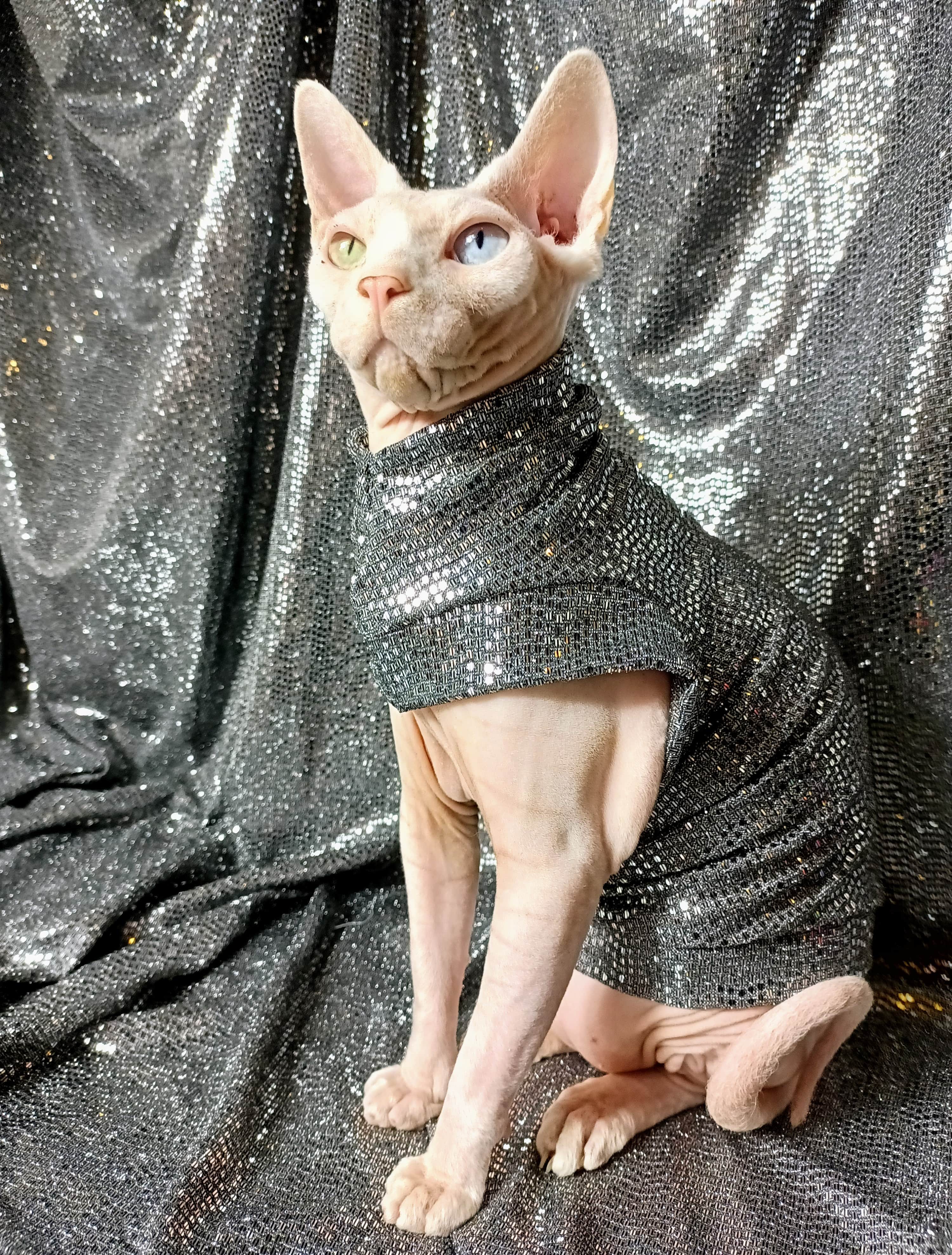 This is a Limited Edition cat shirt / sweater for your hairless Sphynx / Devon Rex / Cornish Rex / Peterbald, and even for some of our stylish furry friends. This is a stretchy mid weight polyester/ spandex purple fabric with printed metallic circles on it. Regular Size limited to only 8. Bambino Size limited to only 8. Ankle Biter Size limited to 2 and Lil Nipper Size limited to 2. No more will be made when they are gone.