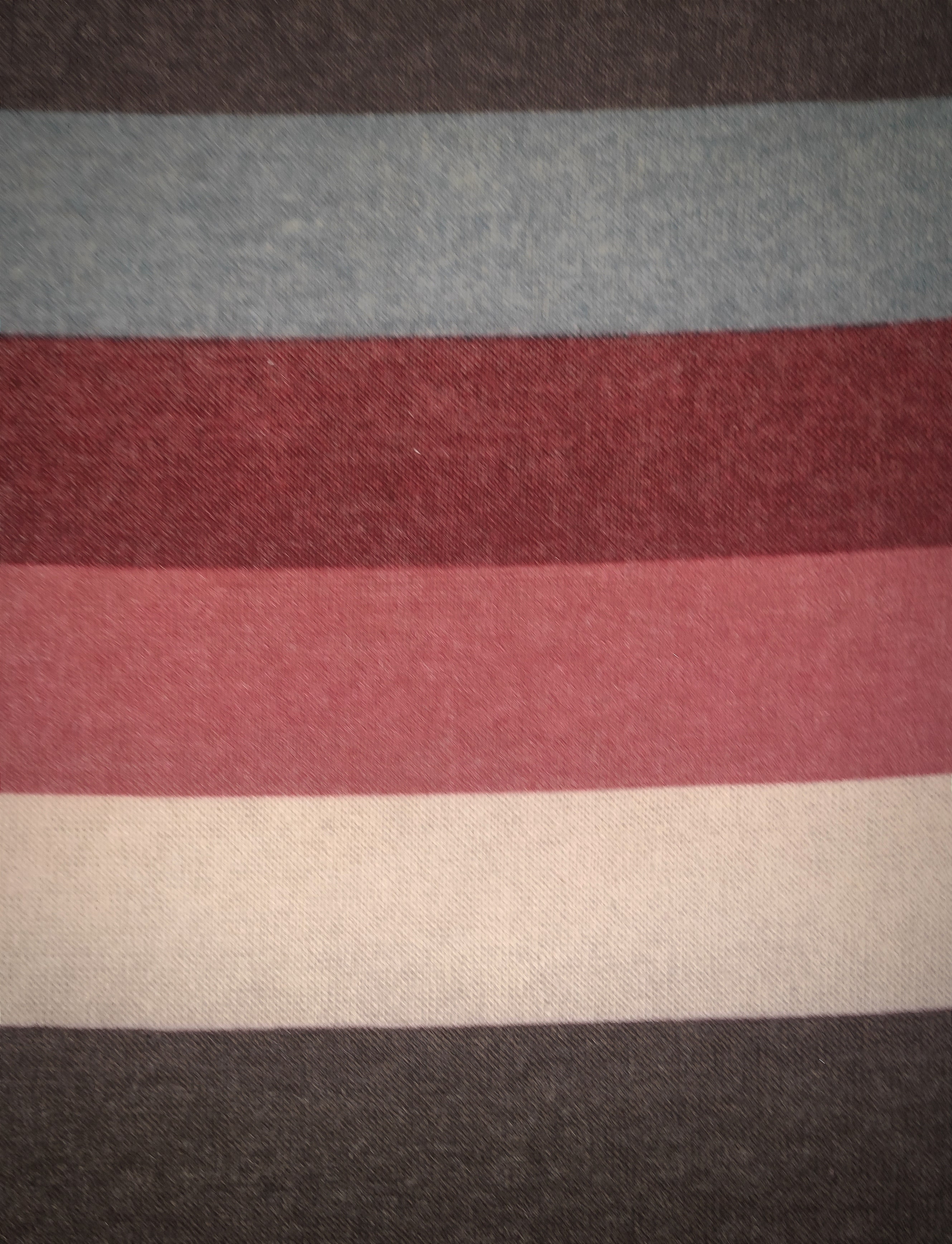 This is a very stretchy lightweight loose knit tan fabric with printed muted colored chunky stripes. Regular Size limited to only 7. Bambino Size limited to only 8. Ankle Biter Size limited to only 2. Lil Nipper size limited to only 2. No more will be made when they are gone.