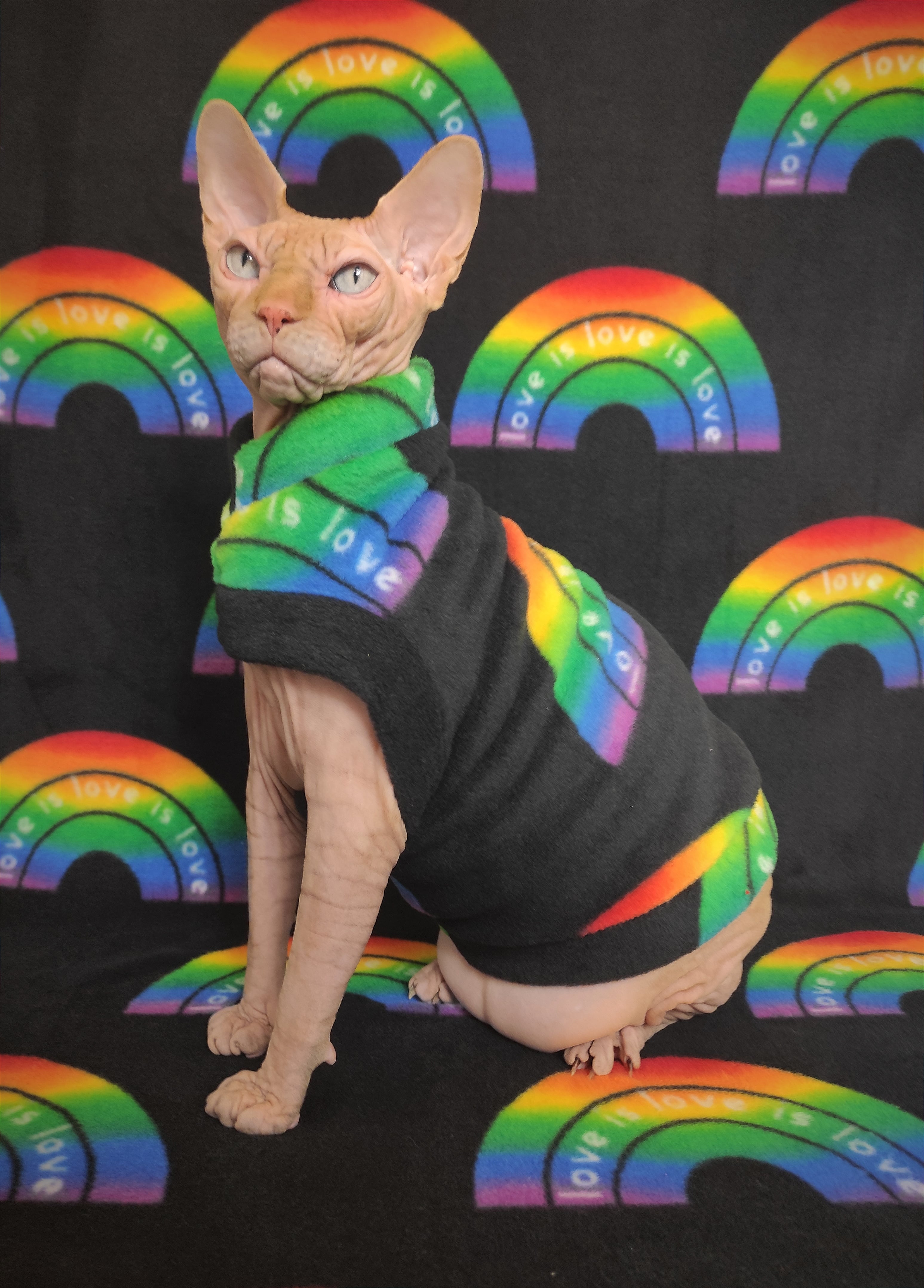 This is a soft luxe medium weight stretchy black fleece with rainbows that say "love is love is love" 😻