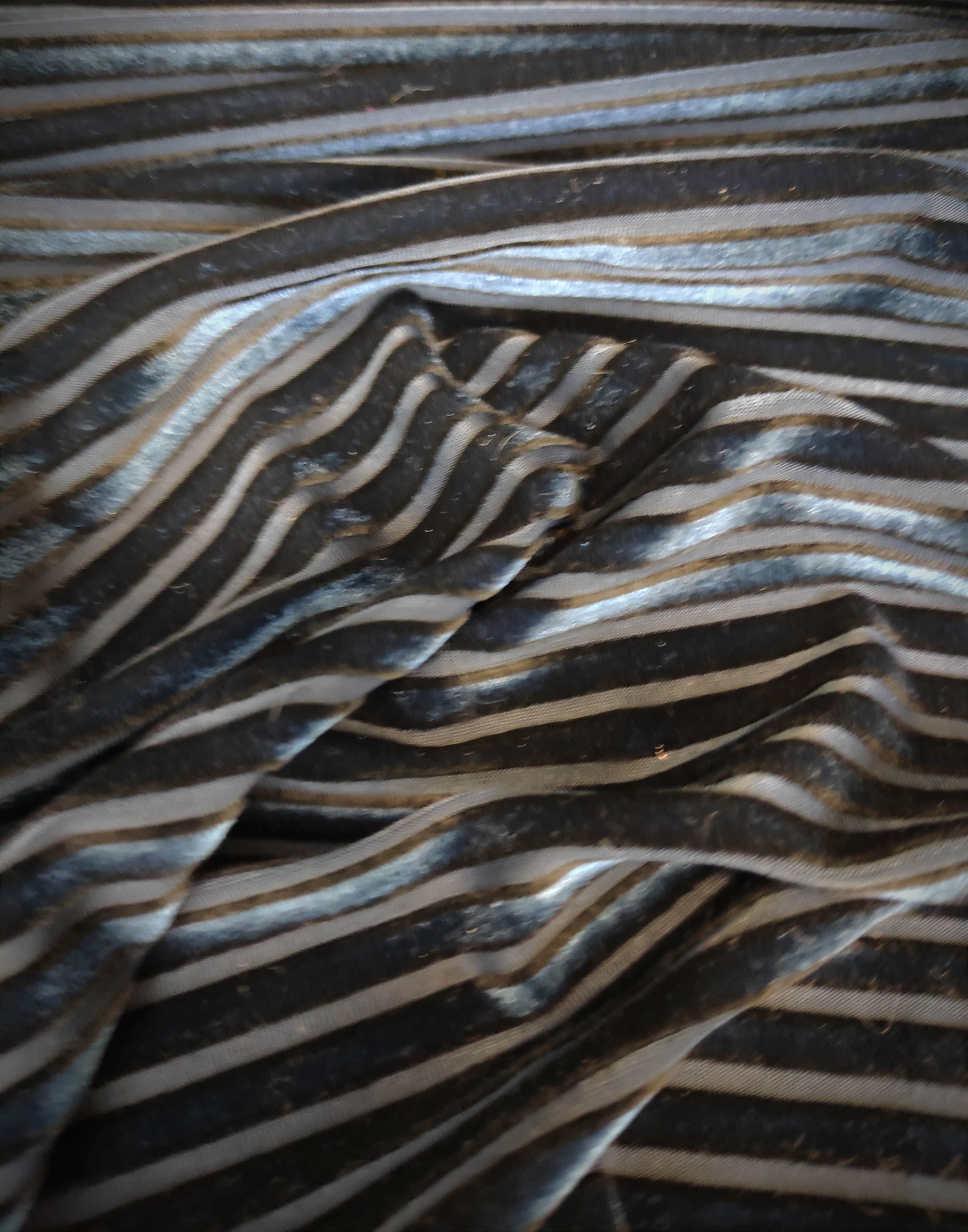 This is a partially see through lightweight horizontal striped velvet in black and navy blue. Regular Size limited to only 8. Bambino Size is limited to only 7, Ankle Biter Size is limited to 2, Lil Nipper Size is limited to 2. No more will be made when they are gone.