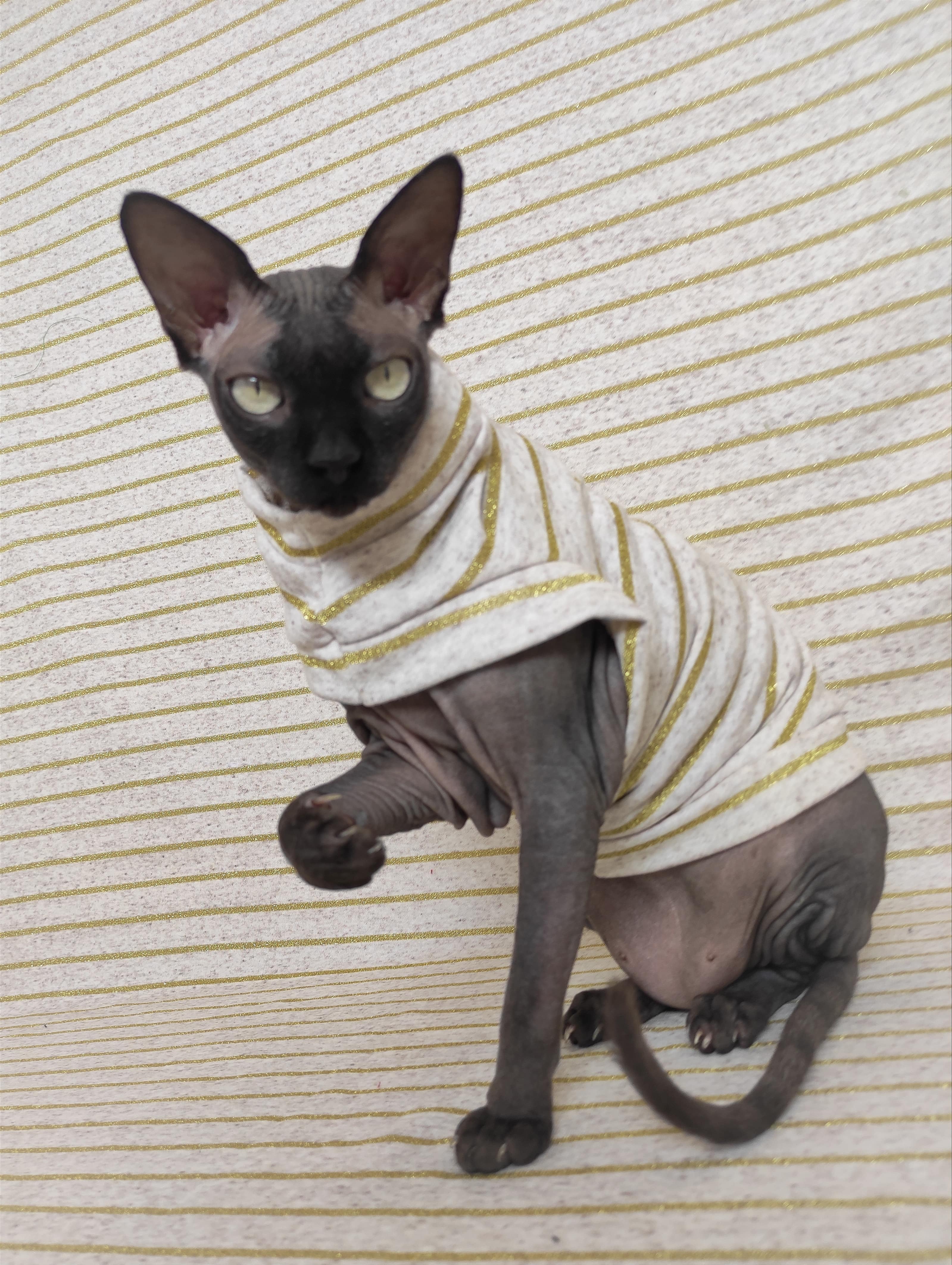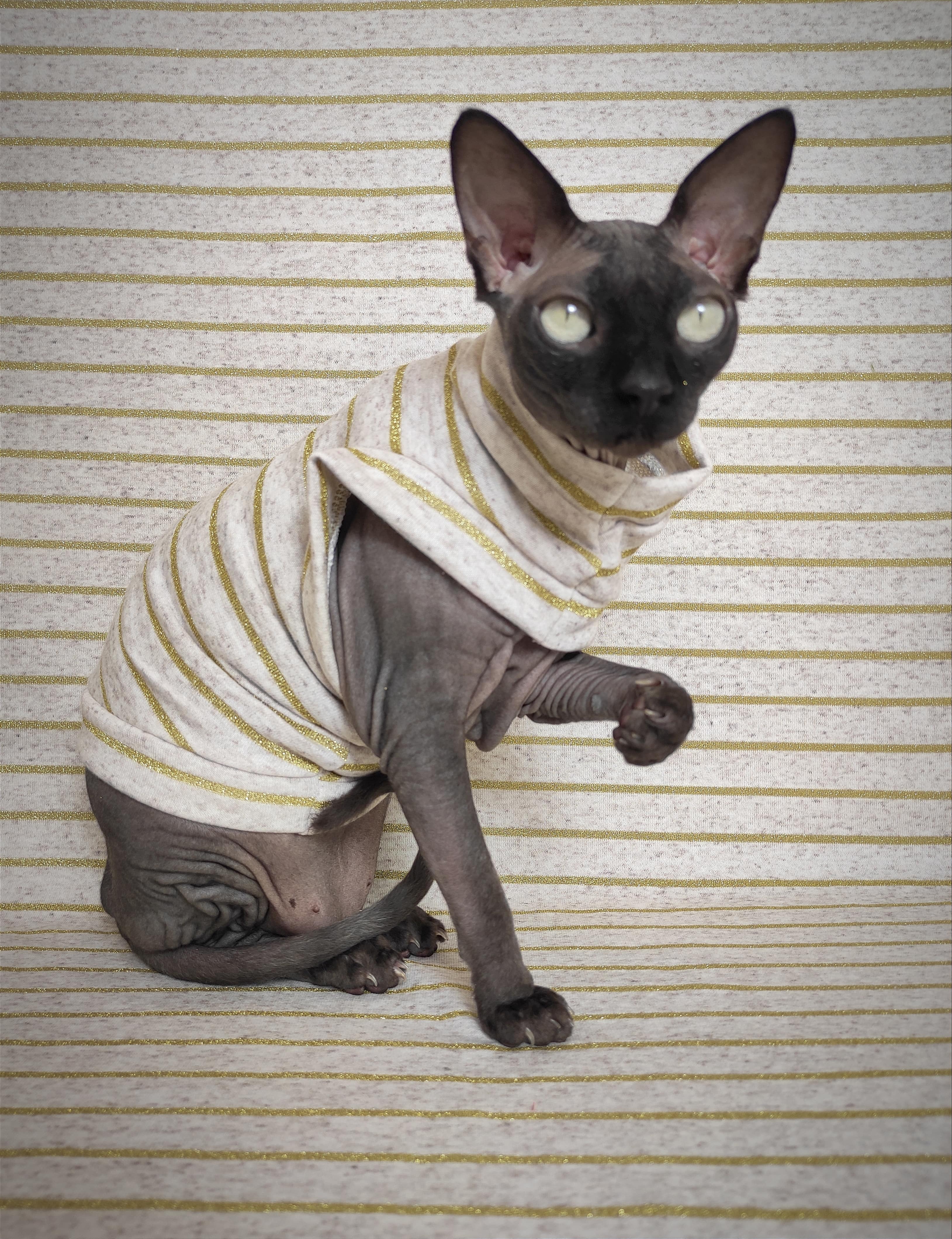 REGULAR size is for most adult hairless cats age 1 to 18. BAMBINO size fits hairless kittens age 6 months to 1 year and smaller adult cats. ANKLE BITER size fits kittens 15 weeks to 6 month olds. LIL NIPPER size fits hairless kittens age 8 weeks to 15 week olds for when they are with the breeder or for the trip home. Custom orders are welcome for larger and smaller cats - pricing is the same - $27.50