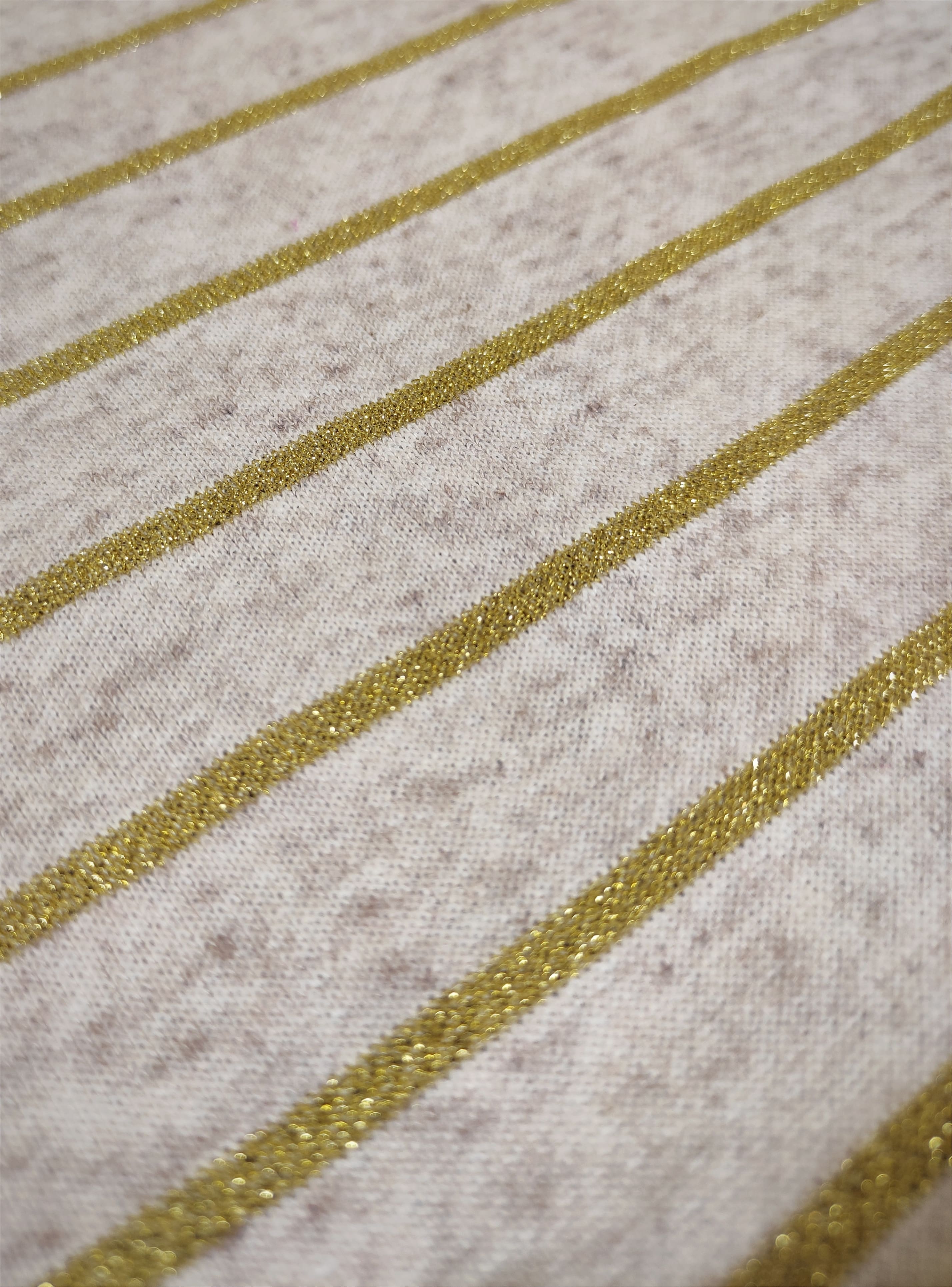 This is a comfy medium weight grey heather sweatshirt fleece fabric with looped interior and gold metallic thread lines. Regular Size limited to only 8, Bambino Size is limited to only 8, Ankle Biter Size is limited to 2, Lil Nipper Size is limited to 2. No more will be made when they are gone.