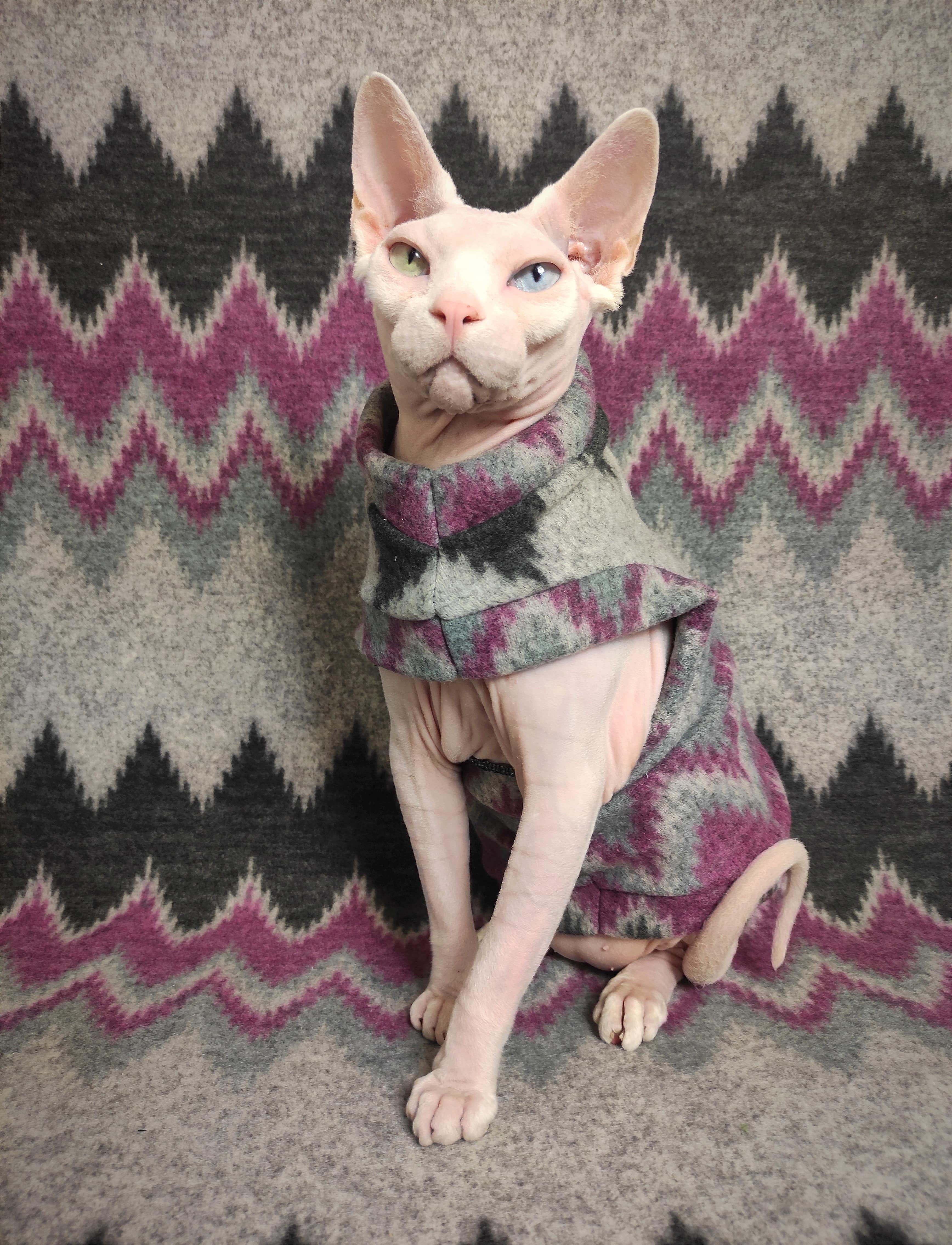 These sweaters fit like no other sweaters. Our original pattern has one hole for both front legs rather than individual holes. The unique design makes it easy to put on and take off, while allowing for improved mobility of your cat. No annoying Velcro anywhere. No awkward walking. All sweaters are machine washable and dryer safe unless specifically mentioned.