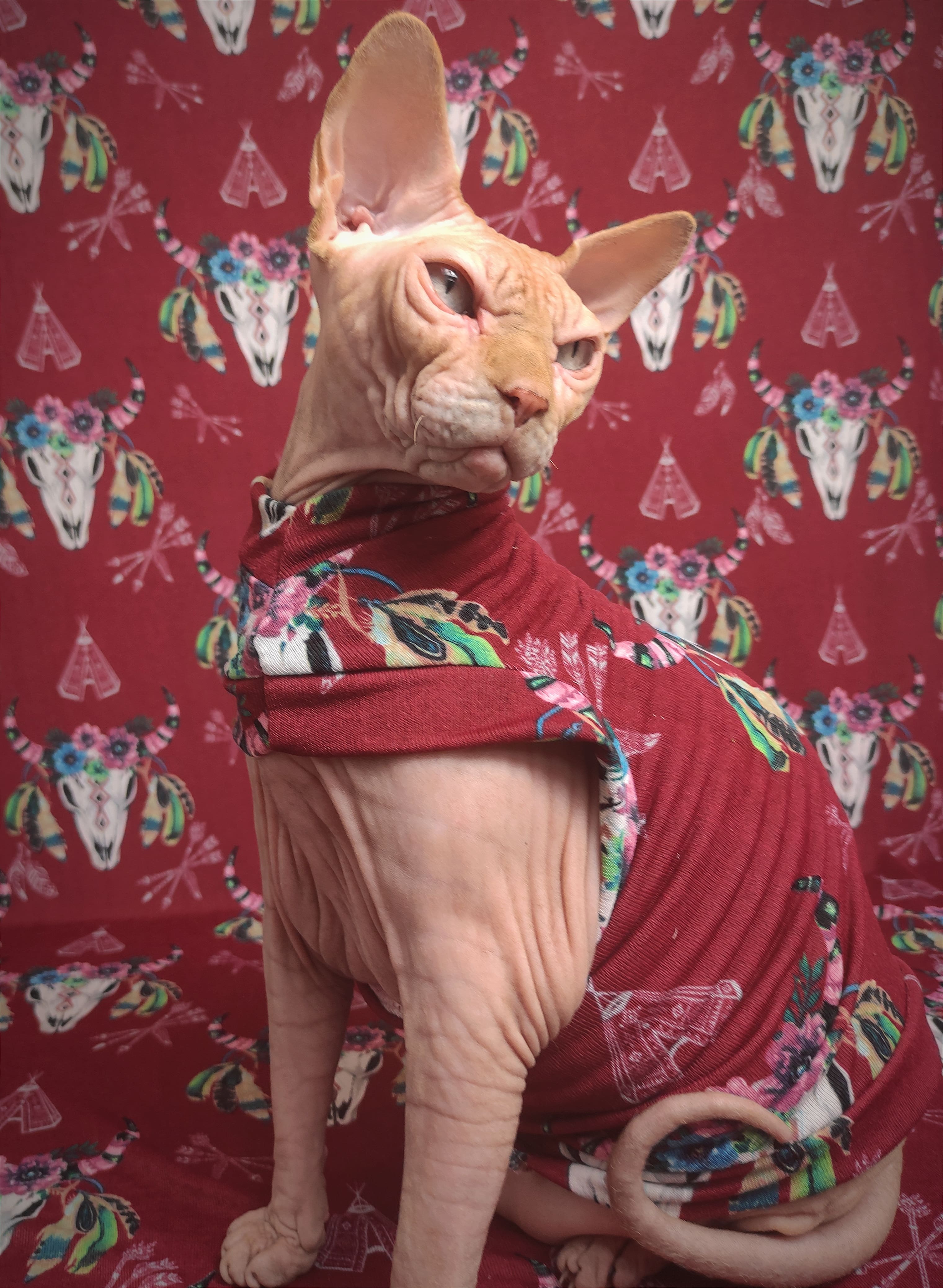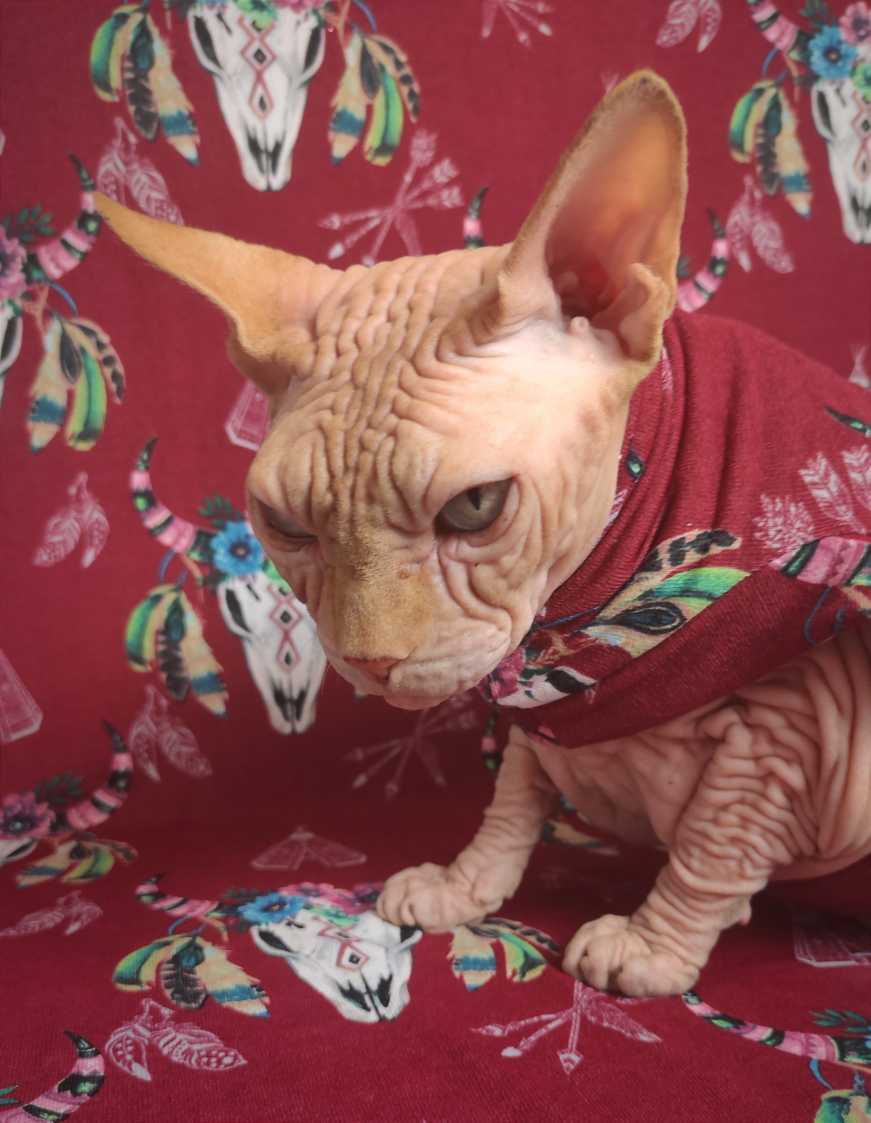 REGULAR size is for most adult hairless cats age 1 to 18. BAMBINO size fits hairless kittens age 6 months to 1 year and smaller adult cats. ANKLE BITER size fits hairless kittens 15 week to 6 month olds. LIL NIPPER size fits hairless kittens age 8 weeks to 15 week olds for when they are with the breeder or for the trip home. Custom orders are welcome for larger and smaller cats - pricing is the same - $27.50