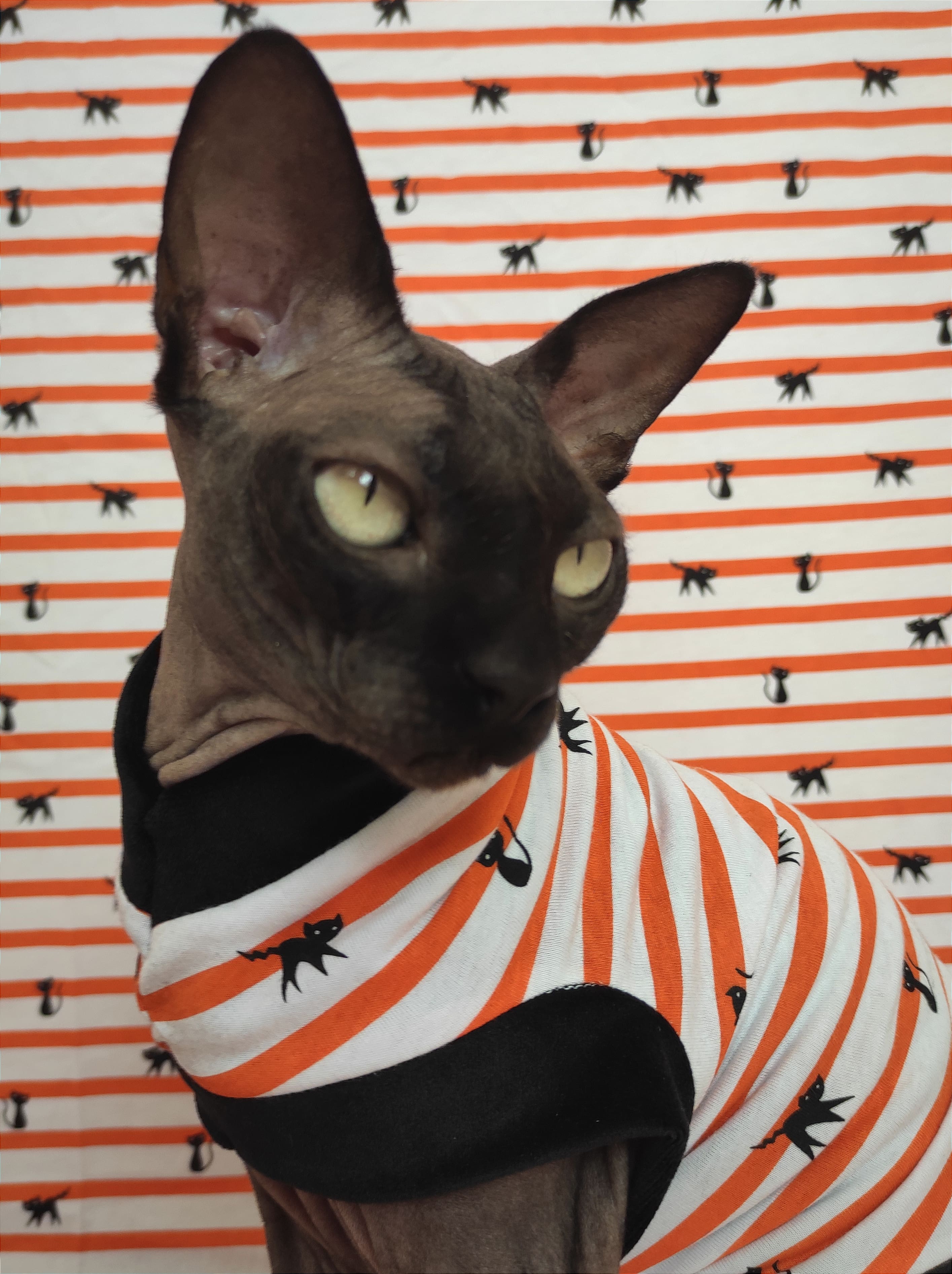 This is an lightweight cotton fabric with some stretch with orang stripes and black cats trimmed with soft black velvet. Regular Size limited to only 9. Bambino Size is limited to only 7, Ankle Biter Size is limited to 2, Lil Nipper Size is limited to 2. No more will be made when they are gone.
