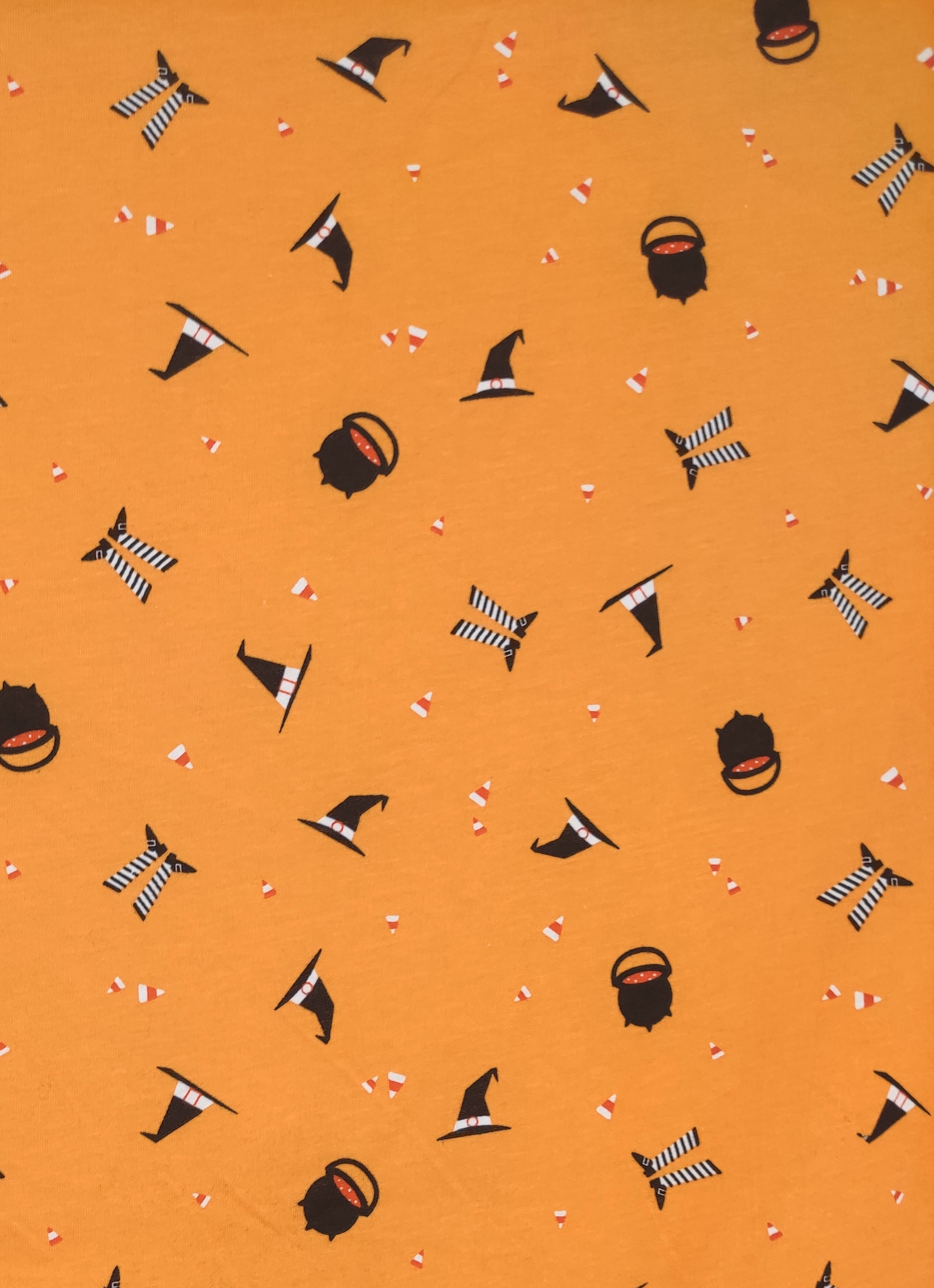 This is an lightweight cotton fabric with some stretch with witch hats, witch legs, candy corn,