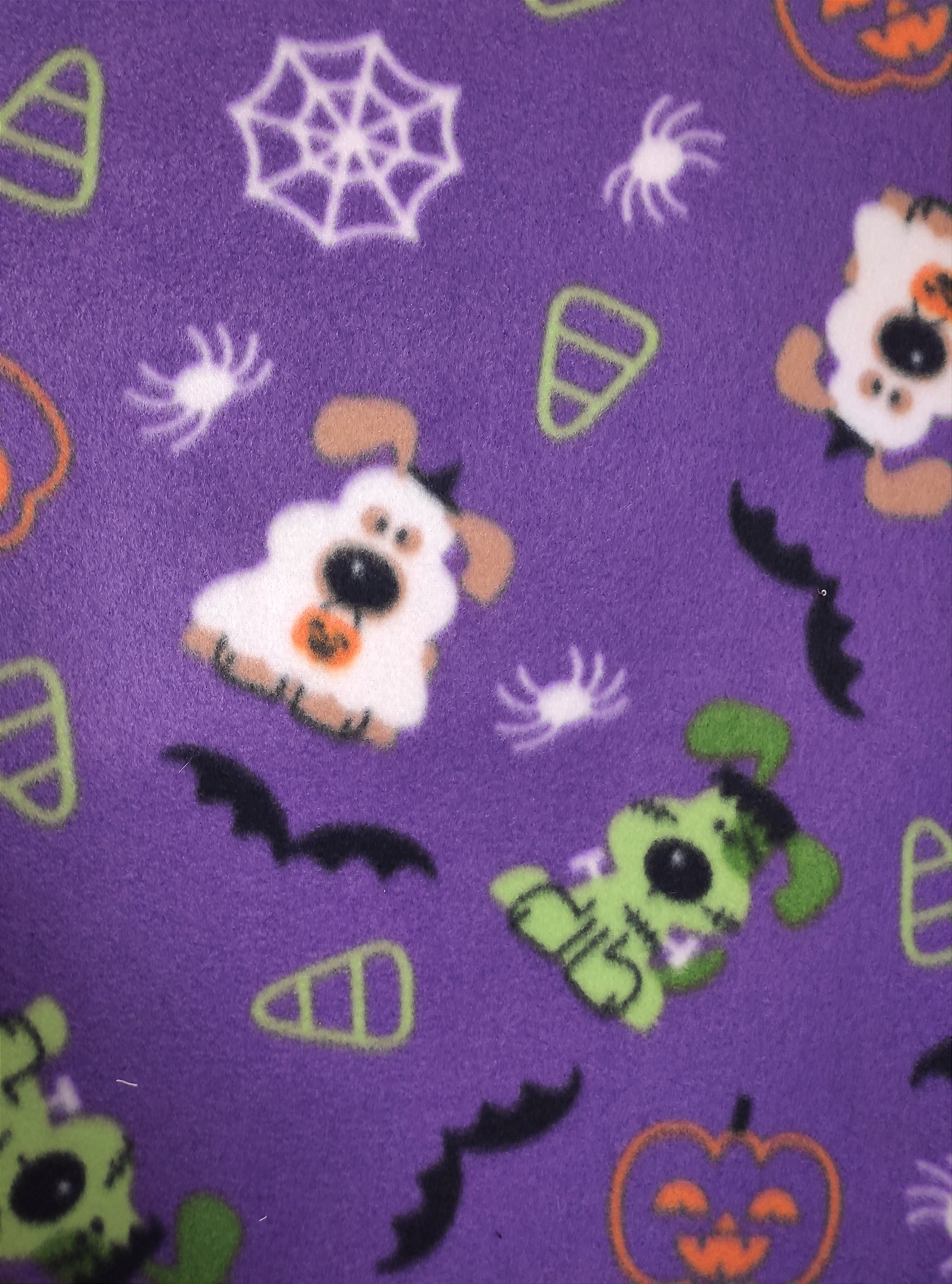 This is a soft medium weight stretchy fleece with dogs dressed up as ghosts and Frankenstein and pumpkins and Halloween items with black fleece trim.