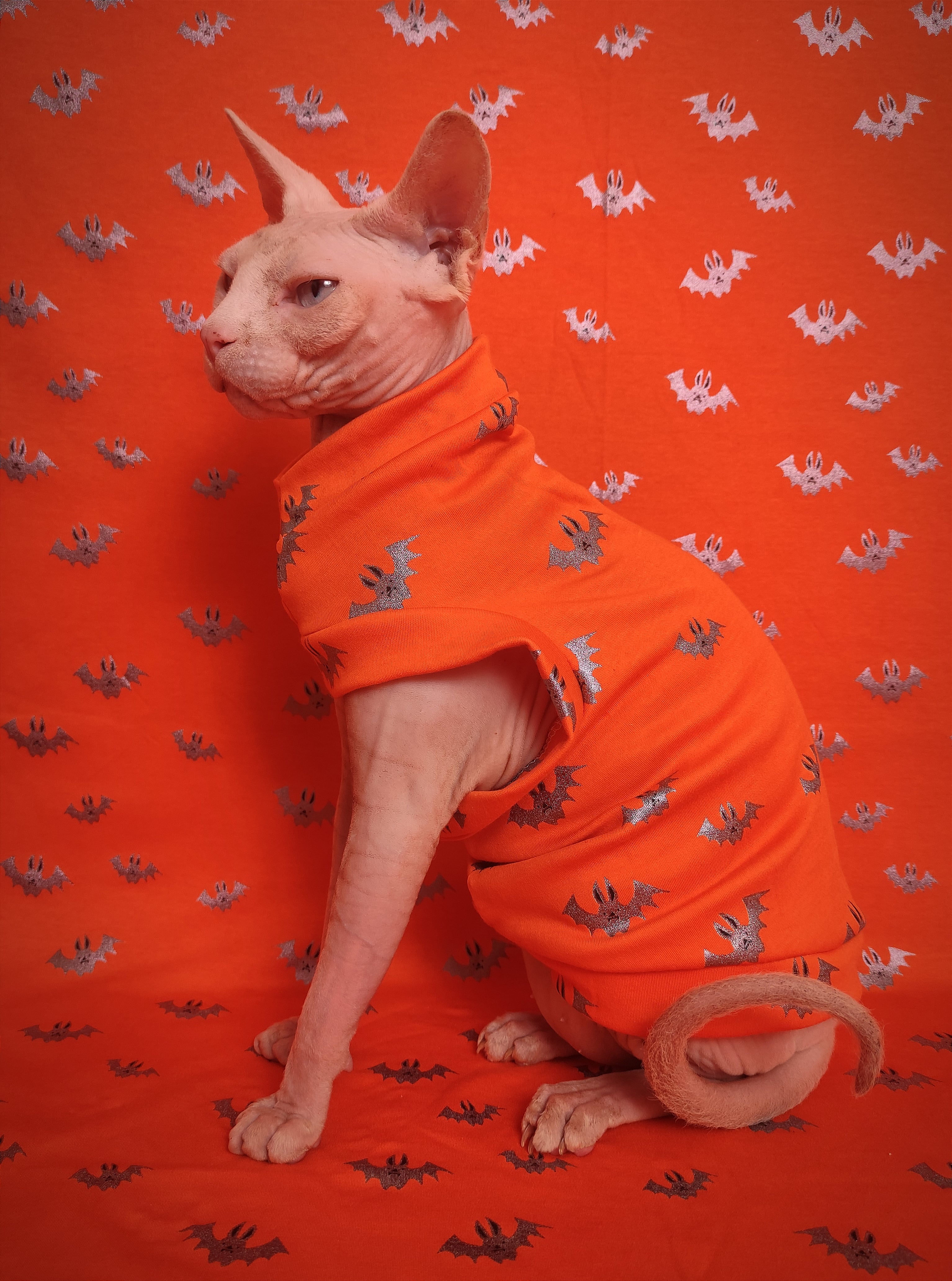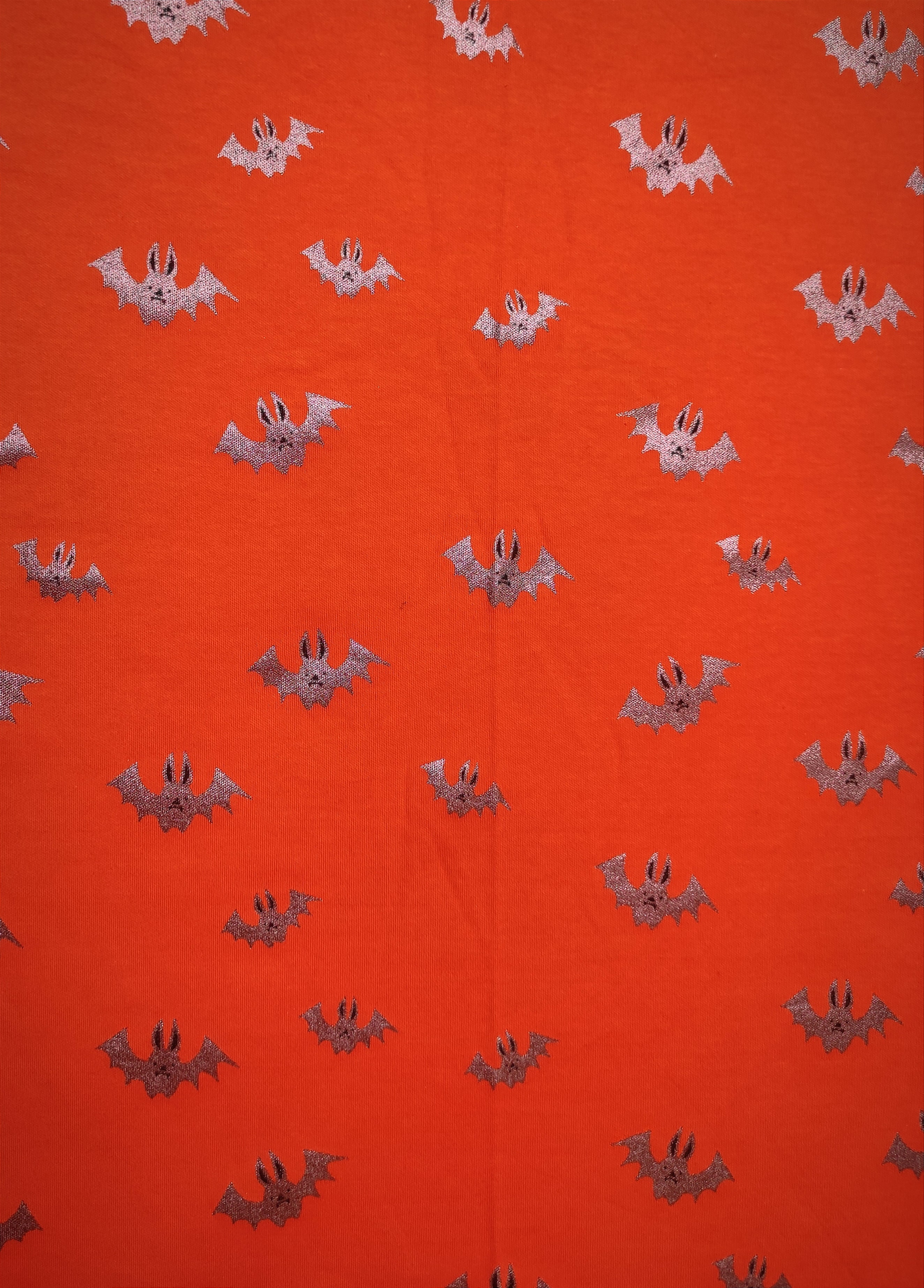 This is a lightweight cotton spandex blend fabric with printed metallic Bats on vibrant orange background.