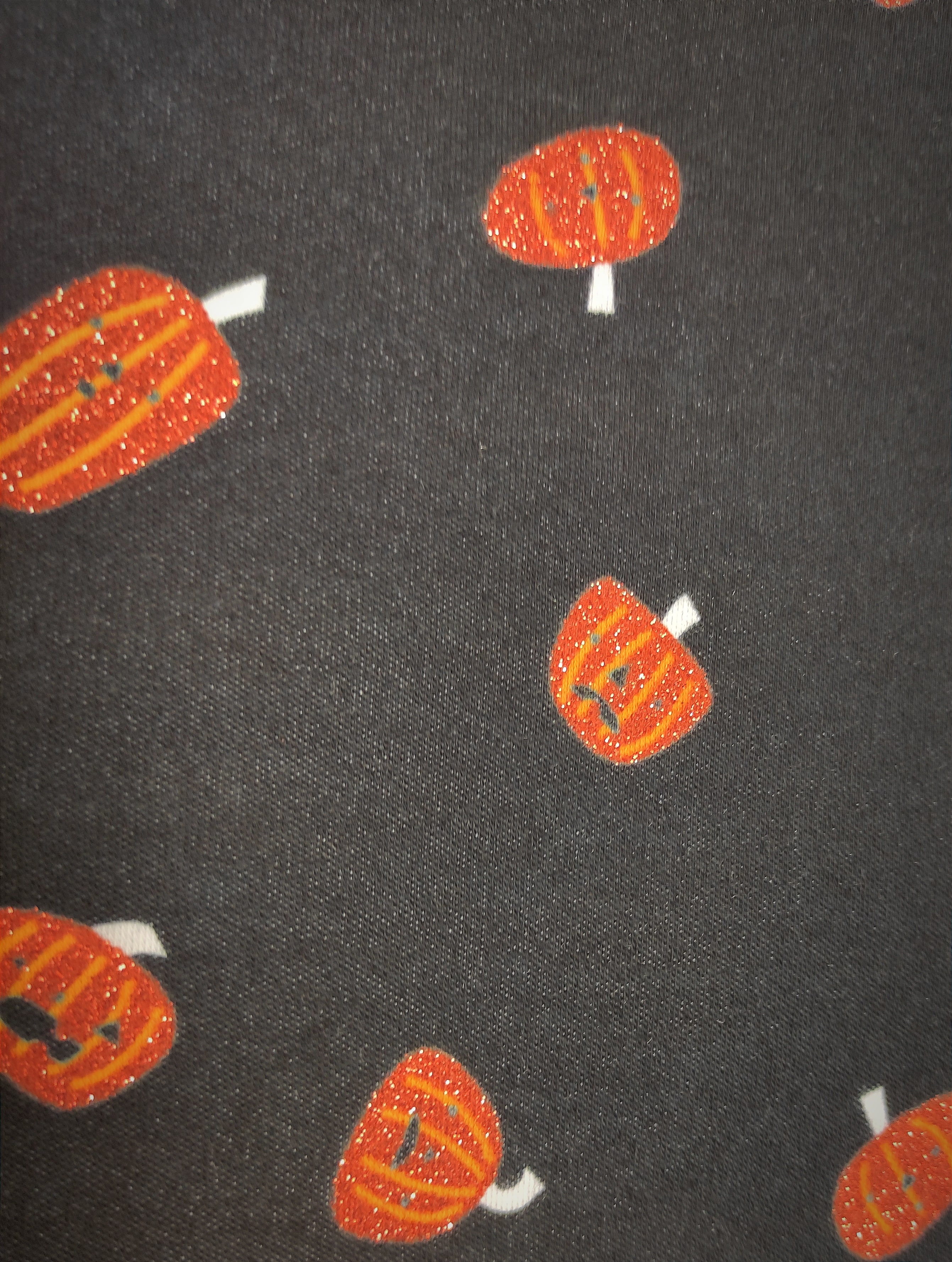 This is a stretchy lightweight cotton spandex fabric with glitter Jack-o'-lanterns trimmed with soft black velvet. Regular Size limited to only 9. Bambino Size is limited to only 7, Ankle Biter Size is limited to 2, Lil Nipper Size is limited to 2. No more will be made when they are gone.