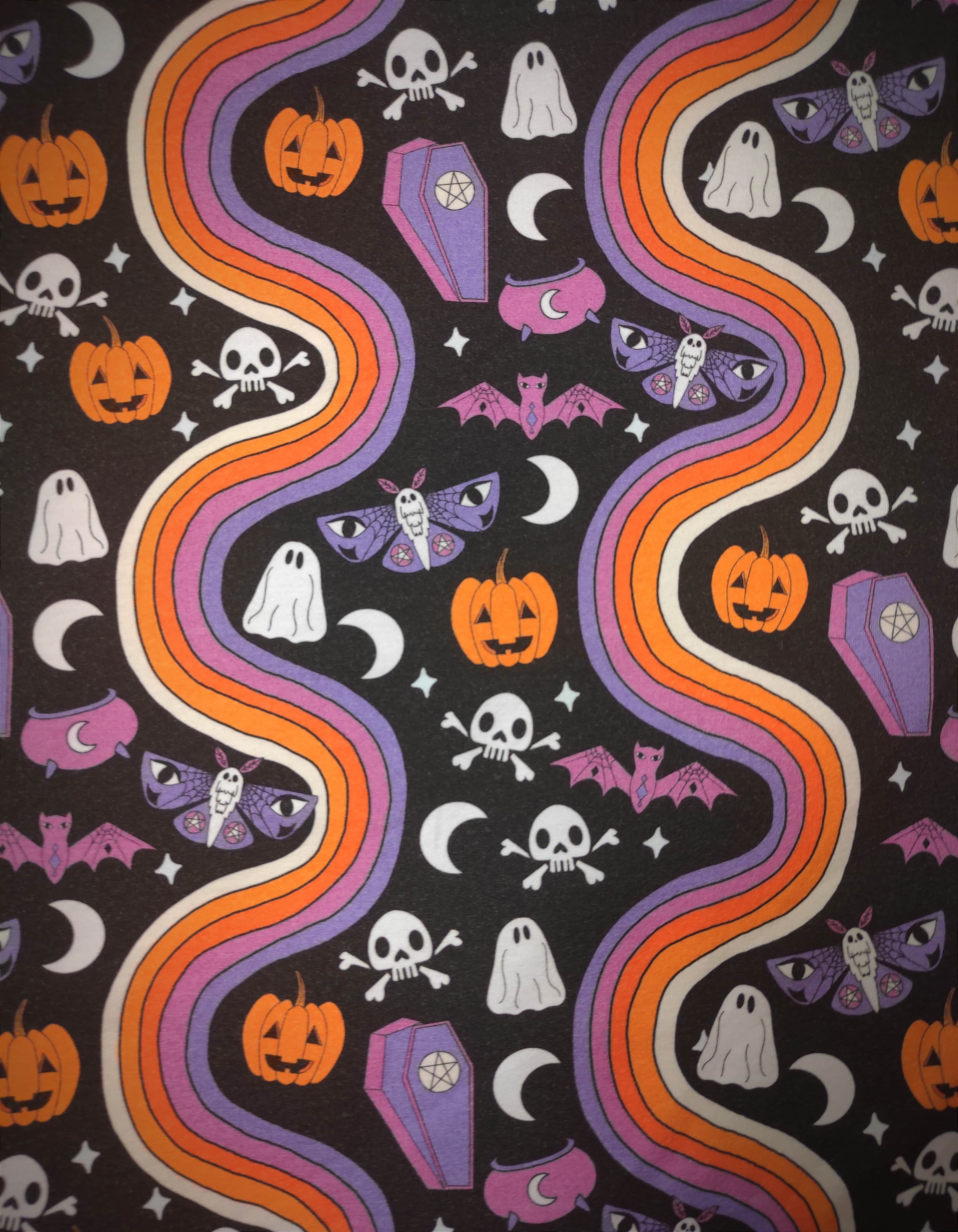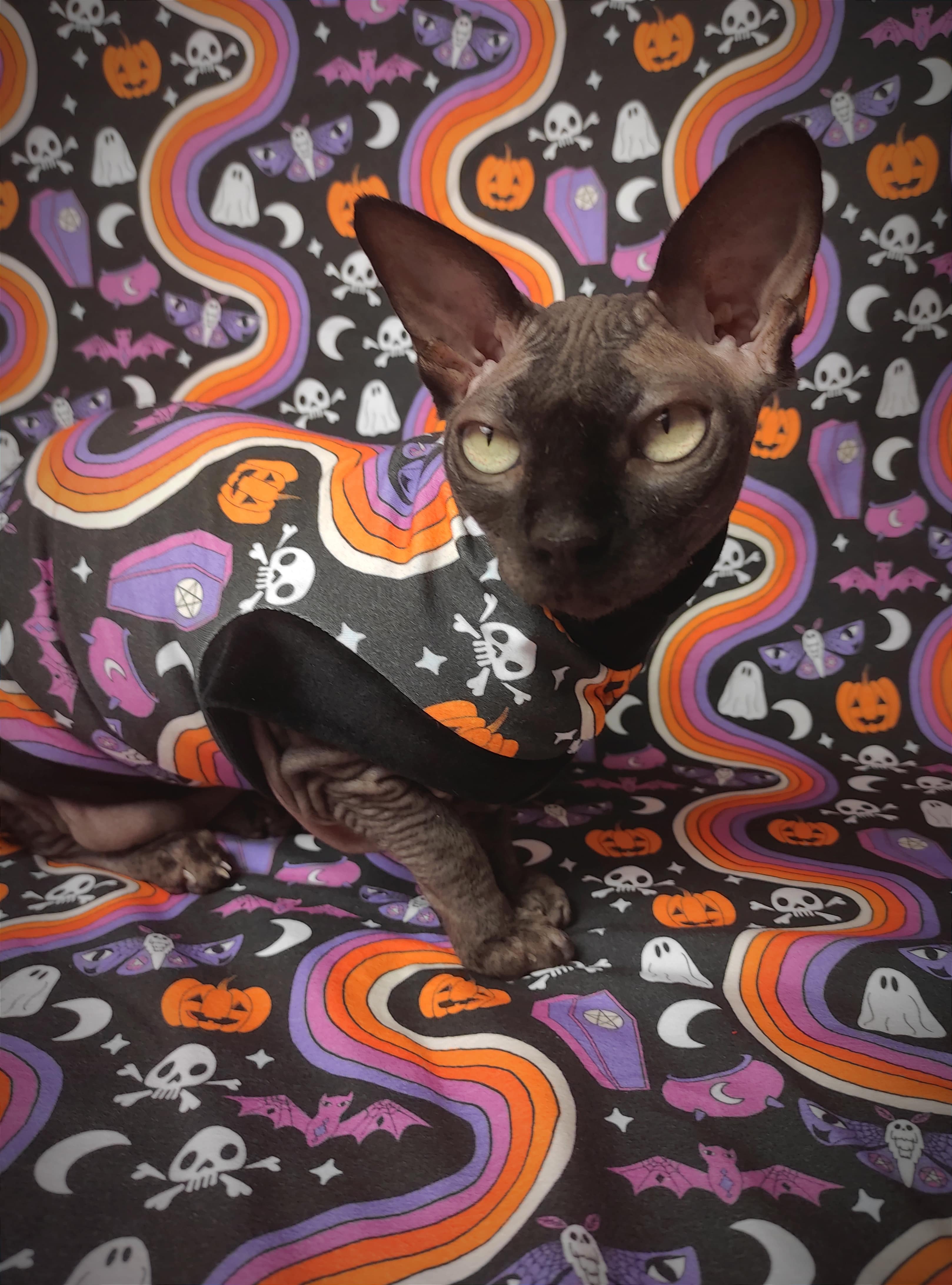 This is a stretchy lightweight cotton spandex fabric with vertical Halloween rainbows and bugs and skulls and coffins, trimmed with soft black velvet. Regular Size limited to only 9. Bambino Size is limited to only 7, Ankle Biter Size is limited to 2, Lil Nipper Size is limited to 2. No more will be made when they are gone.