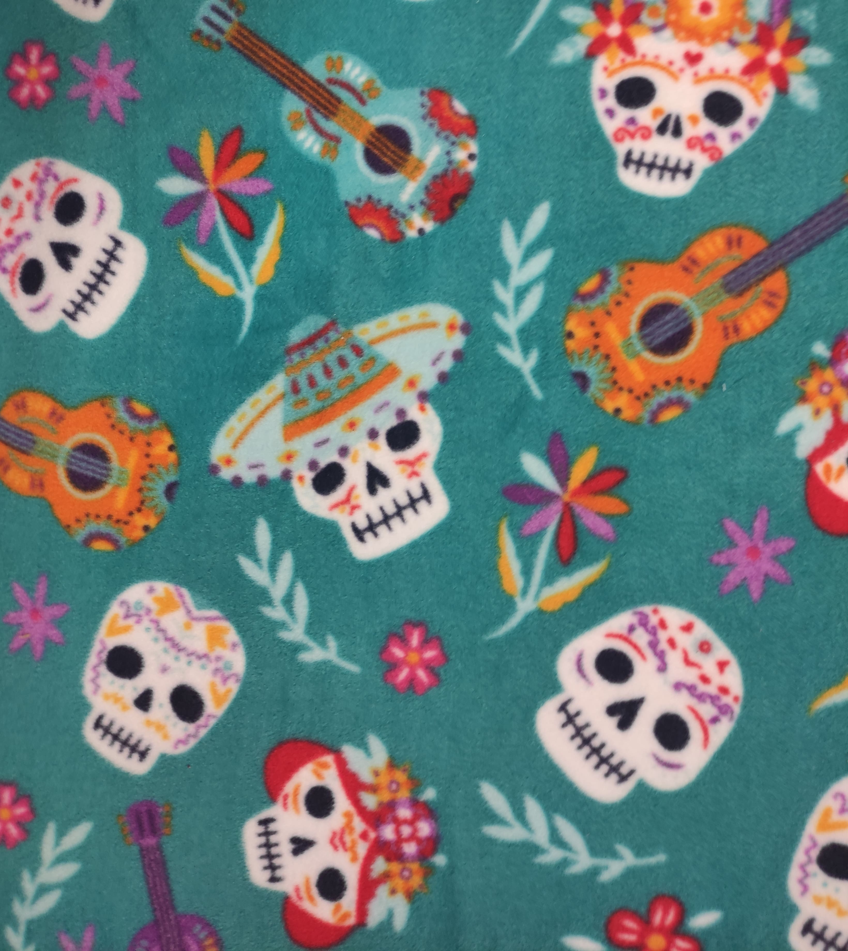 This is a soft medium weight stretchy luxe fleece with spiderwebbed skulls, tarantulas, roses, moths and dead branches.