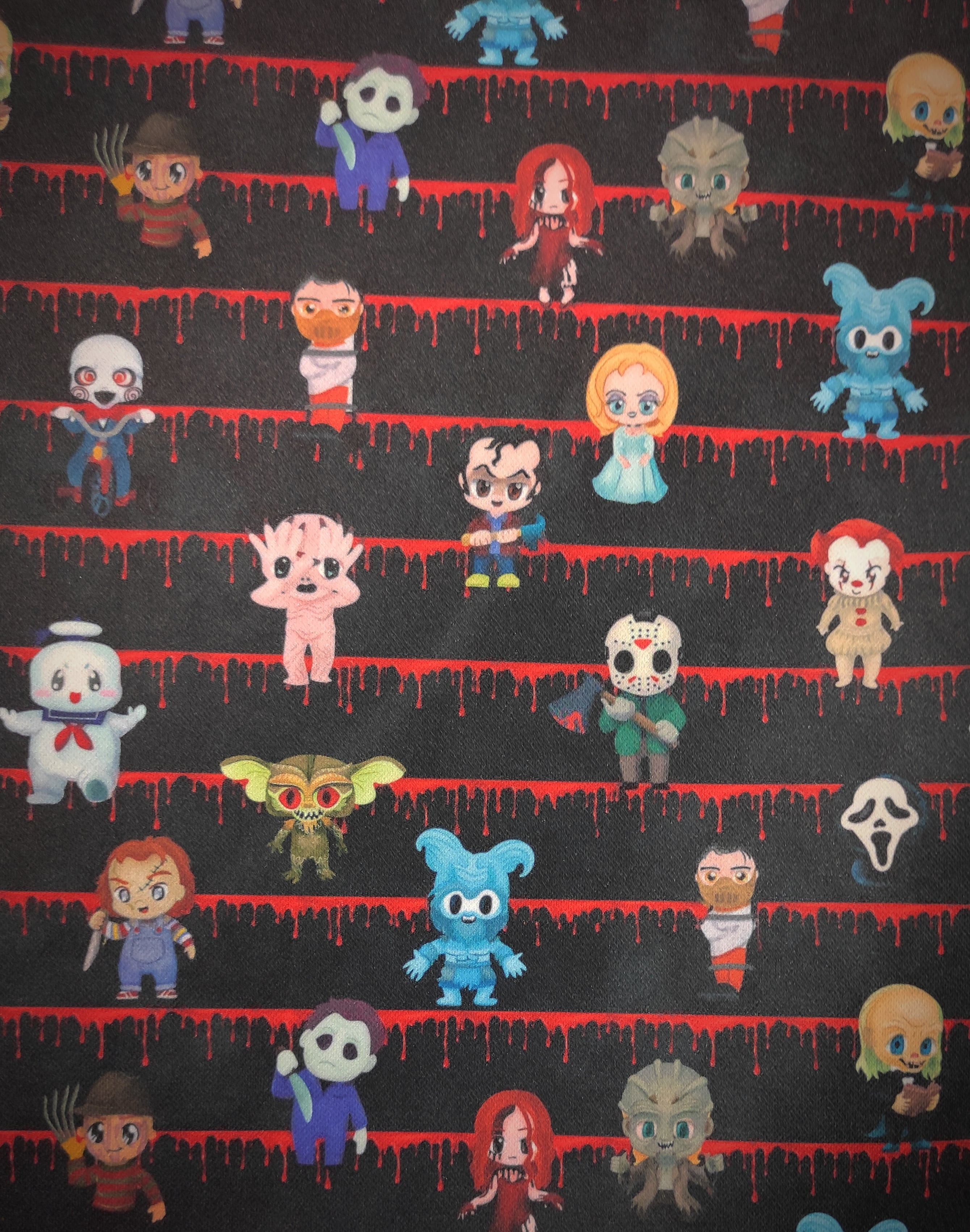 This is an exclusive lightweight stretchy poly blend fabric with printed movie villains (Ghostbusters, IT, Gremlins and more) with soft black velvet trim. Regular Size limited to only 9. Bambino Size is limited to only 7, Ankle Biter Size is limited to 2, Lil Nipper Size is limited to 2. No more will be made when they are gone.