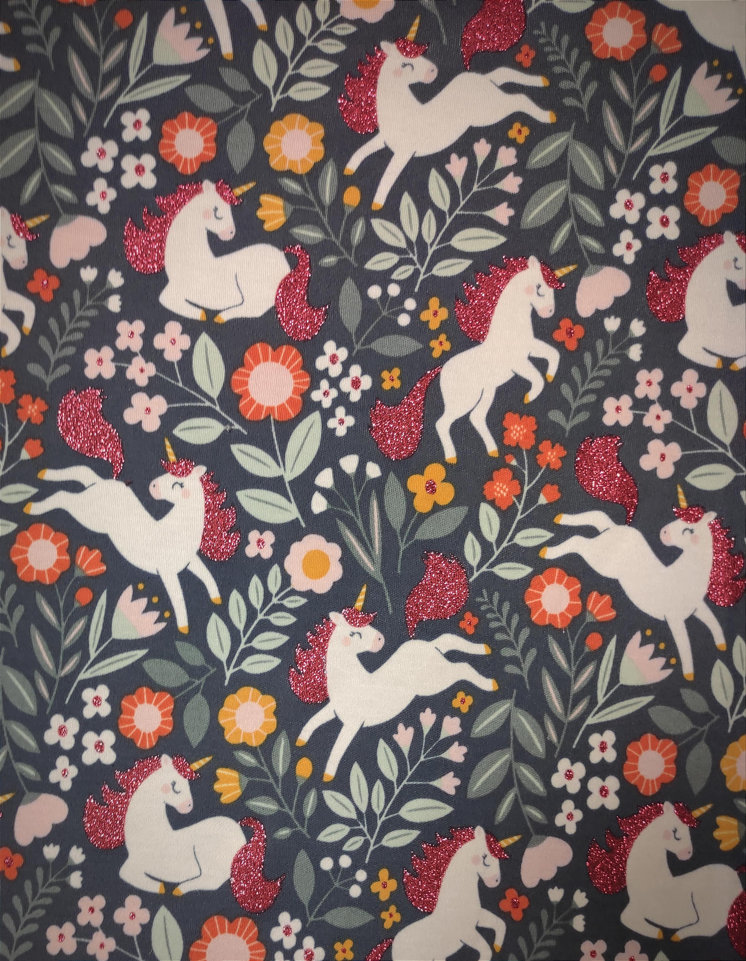 This is an amazing stretchy lightweight cotton spandex fabric printed with glittered unicorns and flowers on dark blue greeen background, finished with striped red velvet trim 😻 Regular Size limited to only 8, Bambino Size is limited to only 7, Ankle Biter Size is limited to 2. Lil Nipper Size is limited to 2. No more will be made when they are gone.