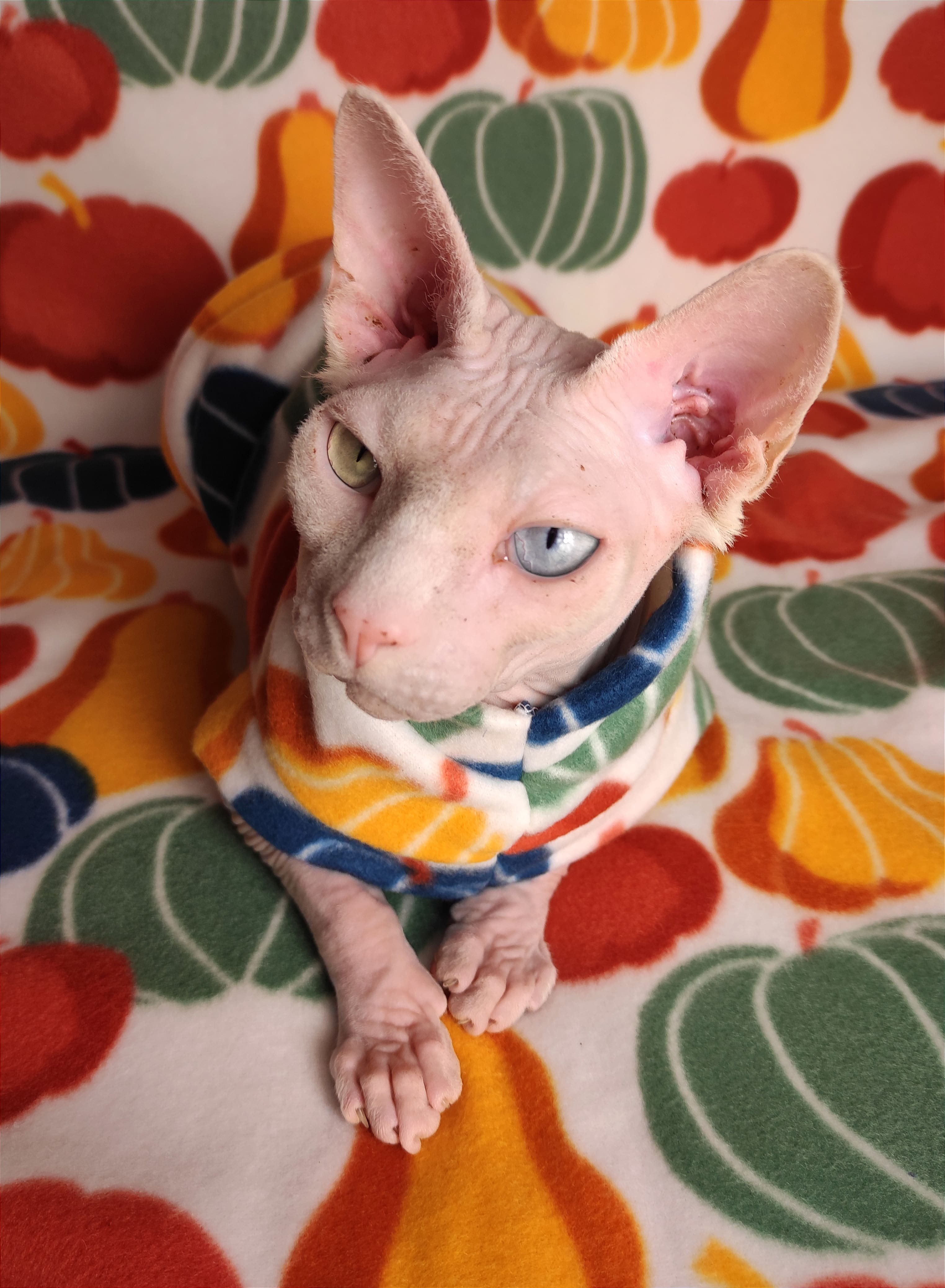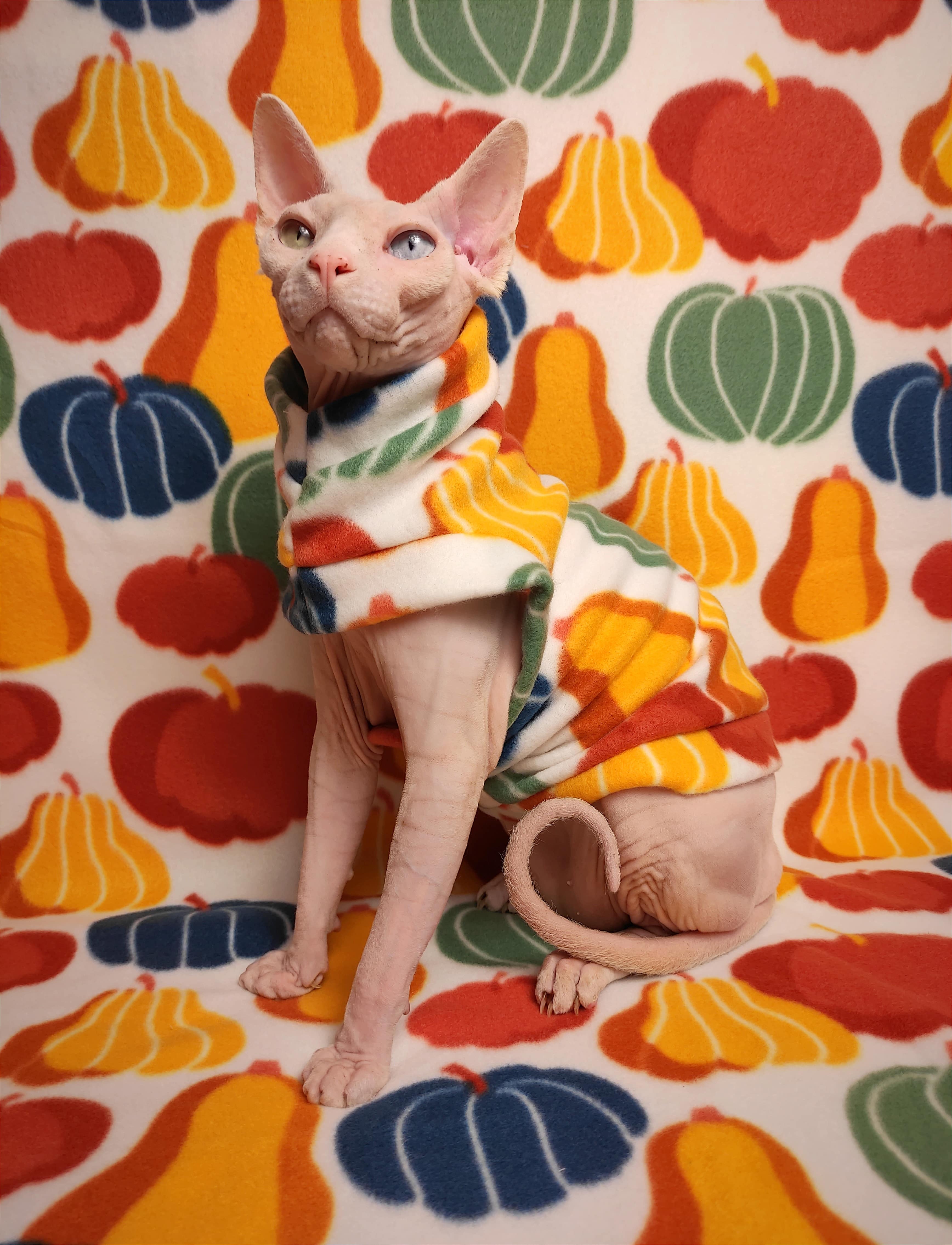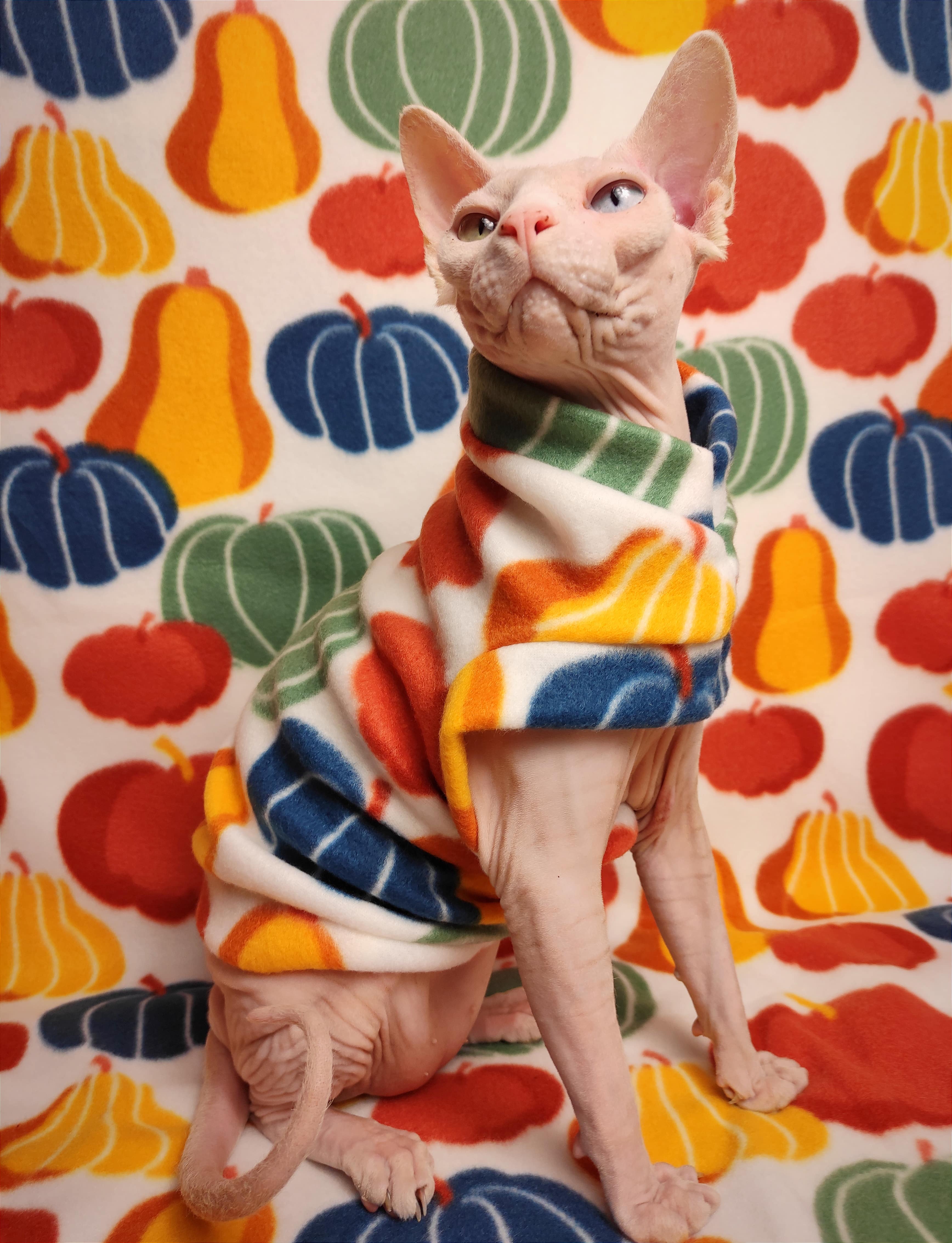 REGULAR size is for most adult hairless cats age 1 to 18. BAMBINO size fits hairless kittens age 6 months to 1 year and smaller adult cats. LIL NIPPER size fits hairless kittens age 8 weeks to 15 week olds for when they are with the breeder or for the trip home. Custom orders are welcome for larger and smaller cats - pricing is the same - $27.50