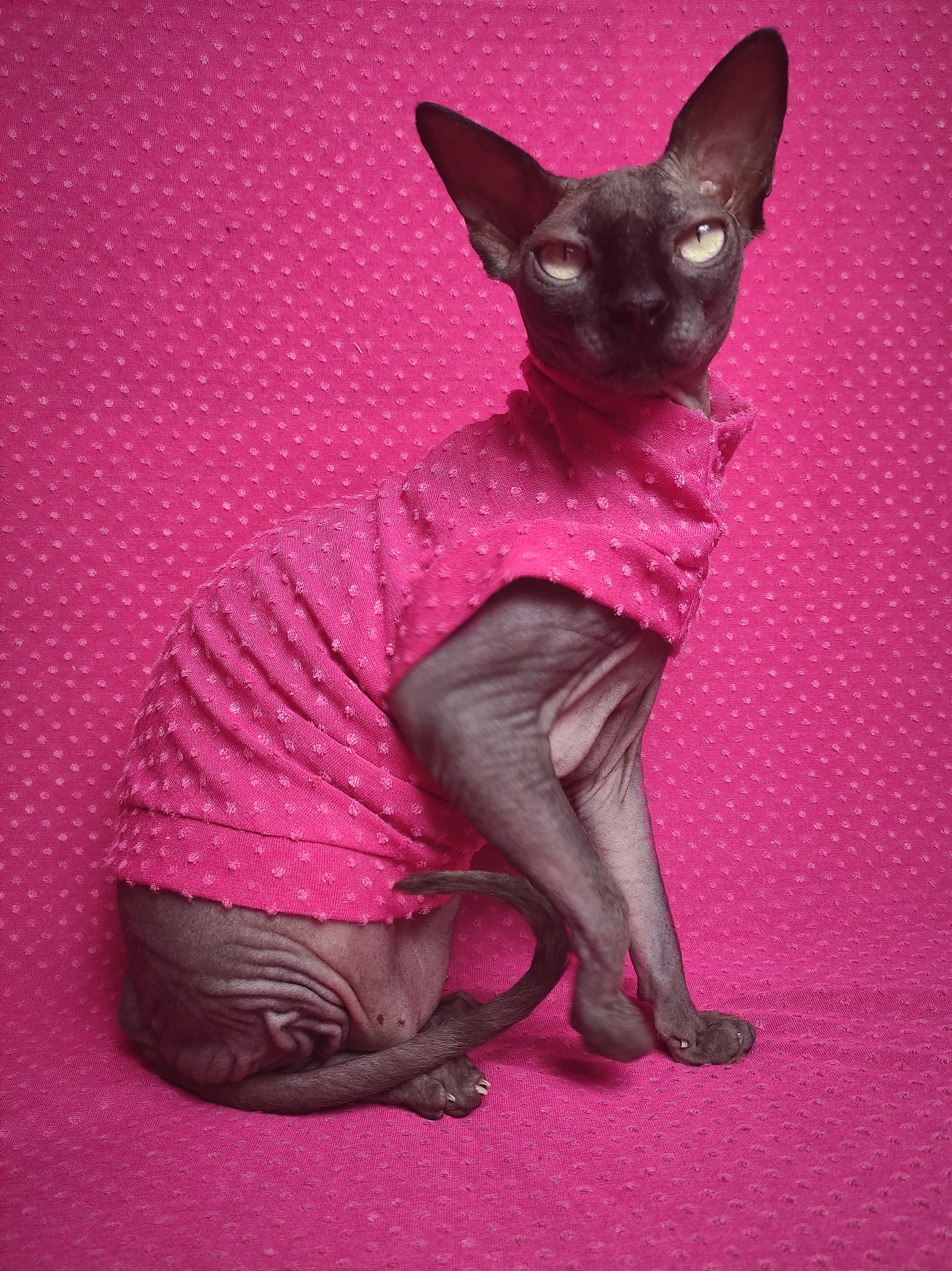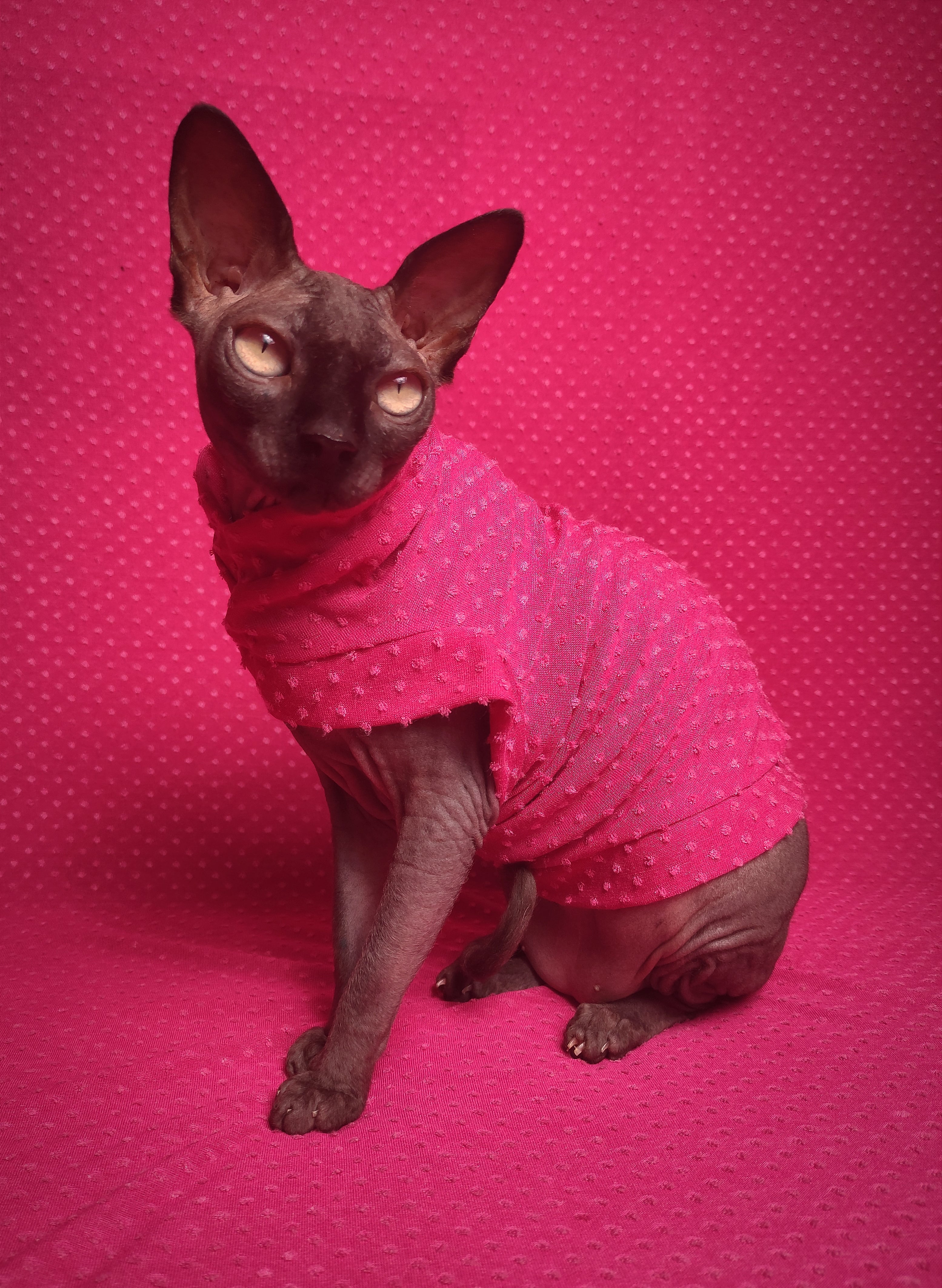 REGULAR size is for most adult hairless cats age 1 to 18. BAMBINO size fits hairless kittens age 6 months to 1 year and smaller adult cats. ANKLE BITER size fits kittens 15 weeks to 6 month olds. LIL NIPPER size fits hairless kittens age 8 weeks to 15 week olds for when they are with the breeder or for the trip home. Custom orders are welcome for larger and smaller cats - pricing is the same - $27.50