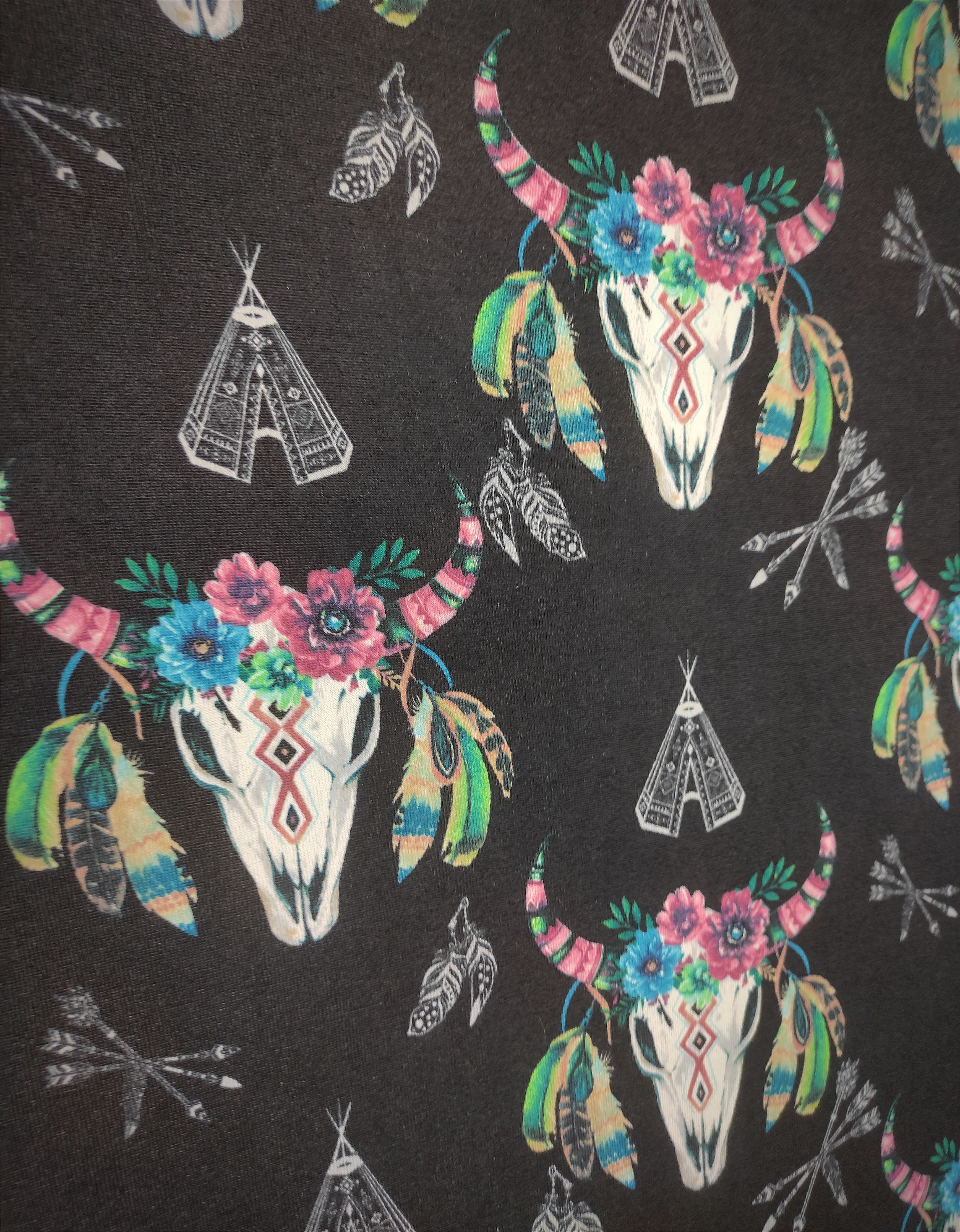 This is a very stretchy lightweight knit fabric with printed southwestern motif. Regular Size limited to only 7. Bambino Size limited to only 8. Ankle Biter Size limited to only 2. Lil Nipper size limited to only 2. No more will be made when they are gone.
