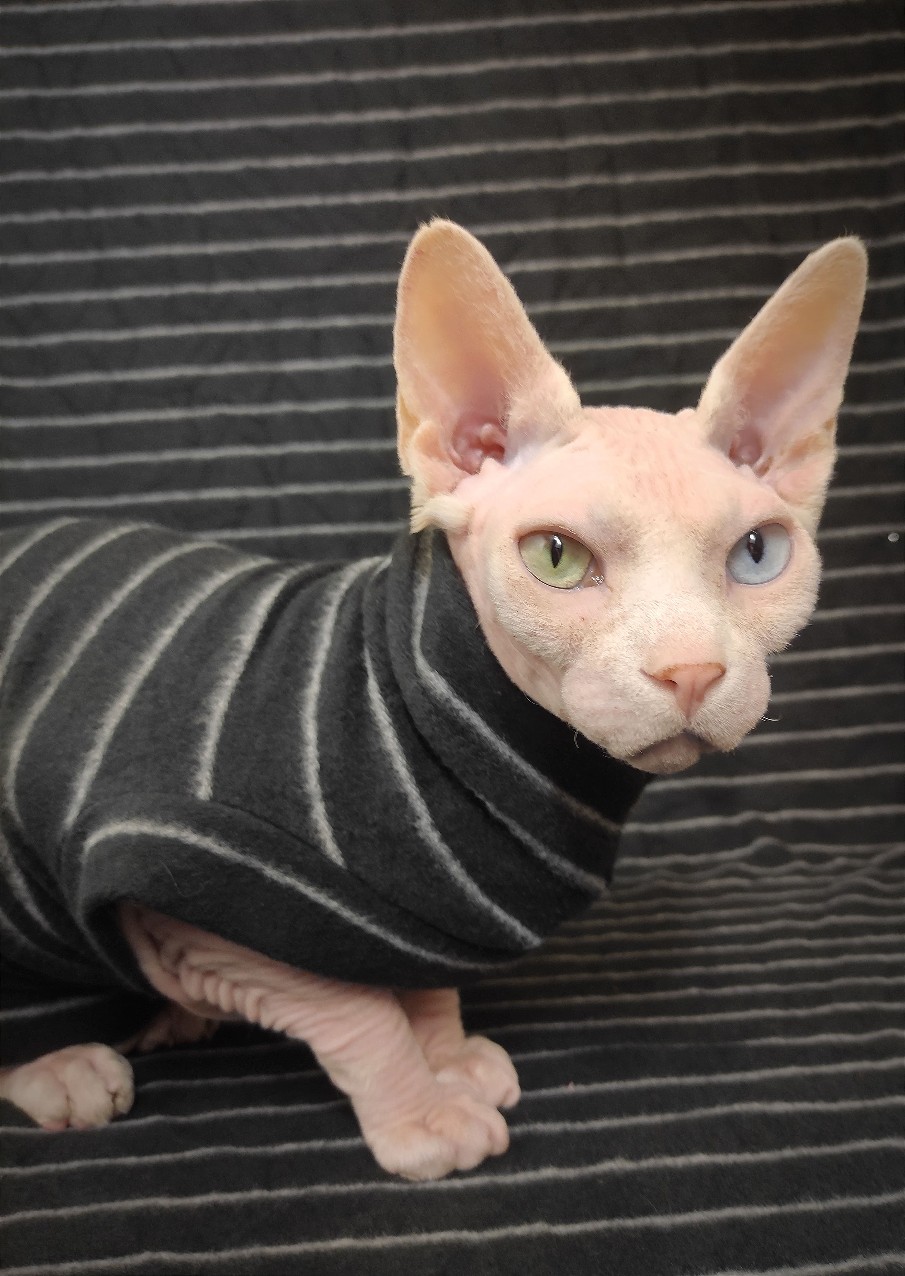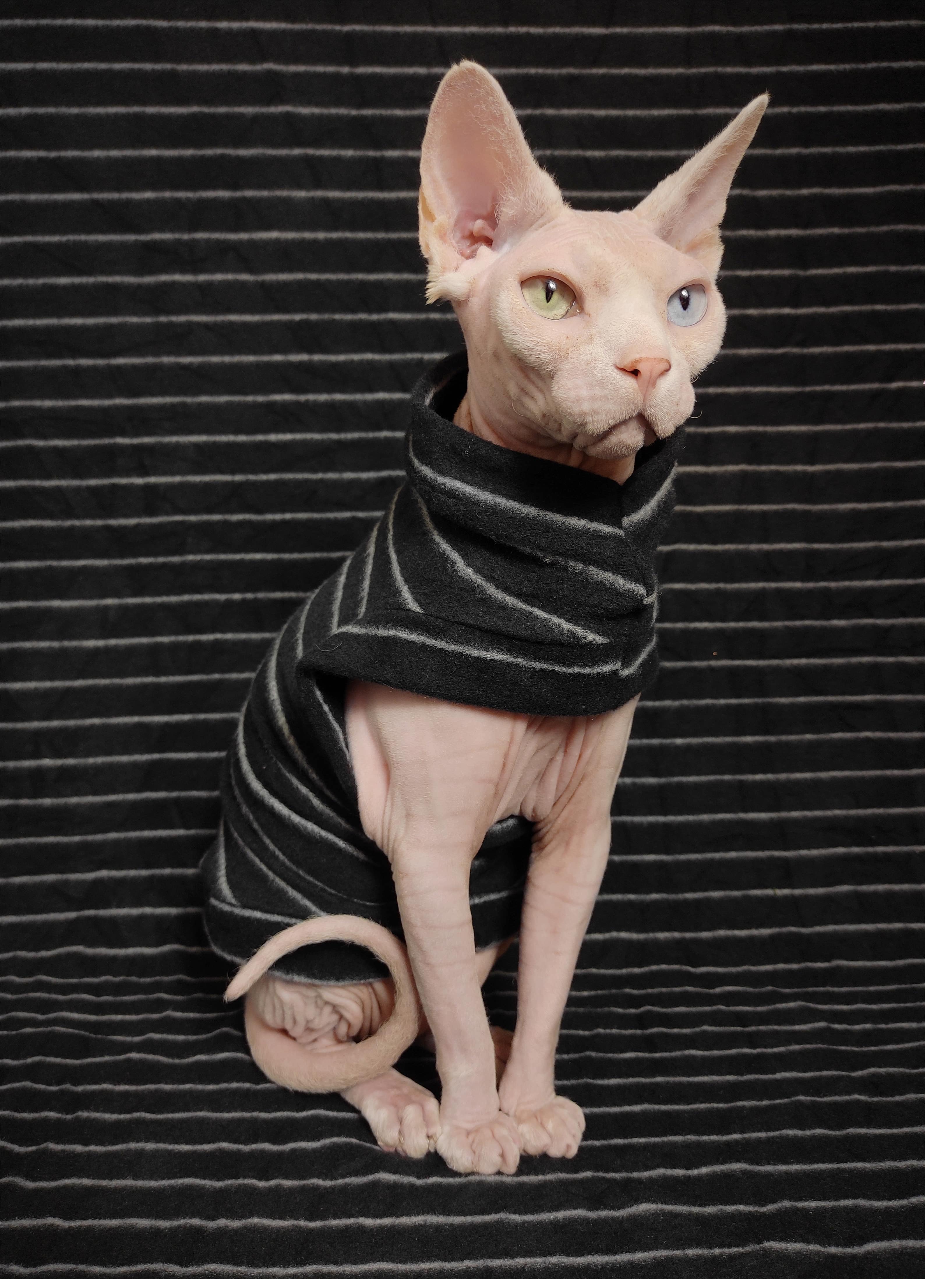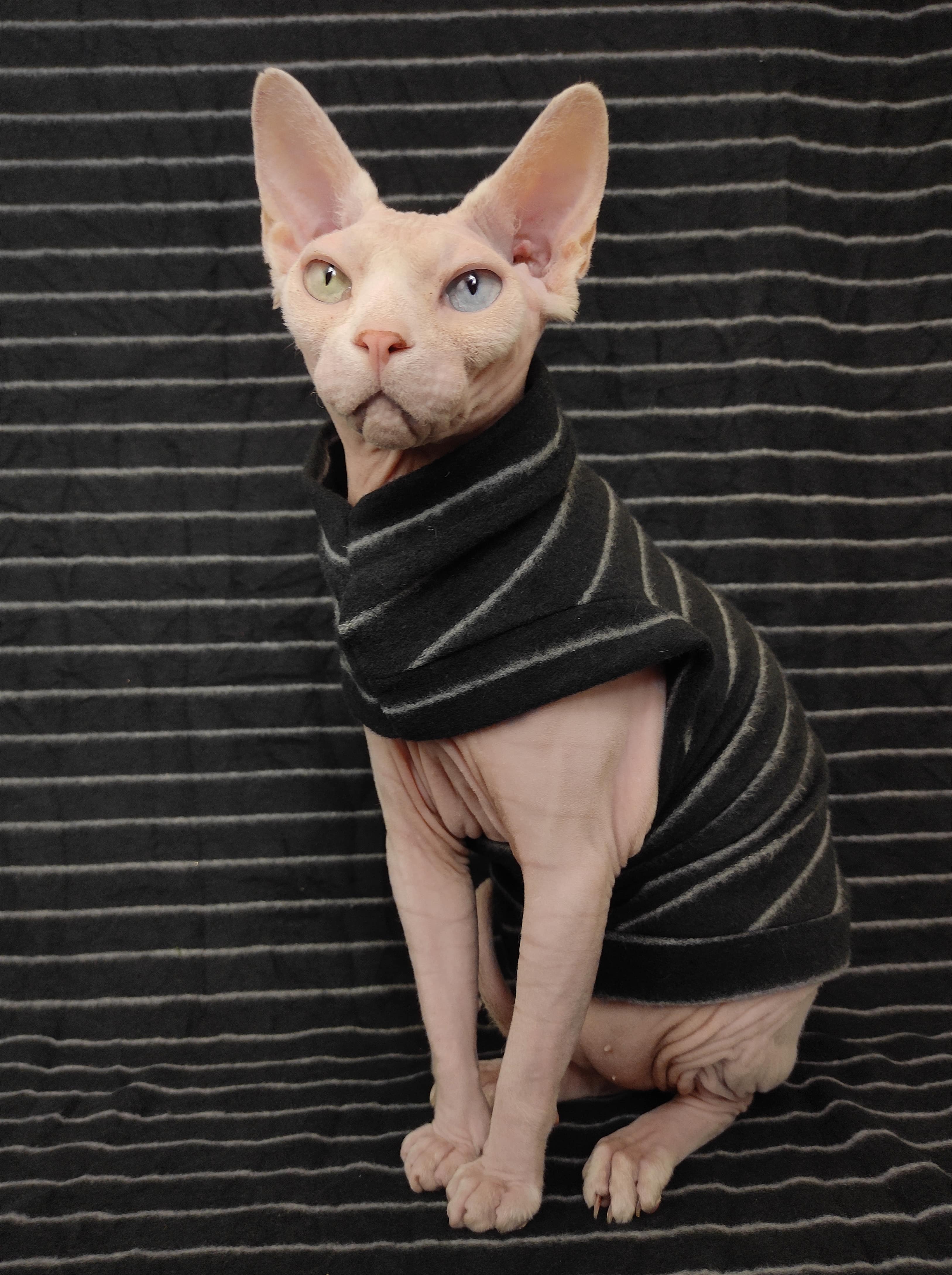 REGULAR size is for most adult hairless cats age 1 to 18. BAMBINO size fits hairless kittens age 6 months to 1 year and smaller adult cats. ANKLE BITER size fits kittens 15 weeks to 6 month olds. LIL NIPPER size fits hairless kittens age 8 weeks to 15 week olds for when they are with the breeder or for the trip home. Custom orders are welcome for larger and smaller cats - pricing is the same - $27.50