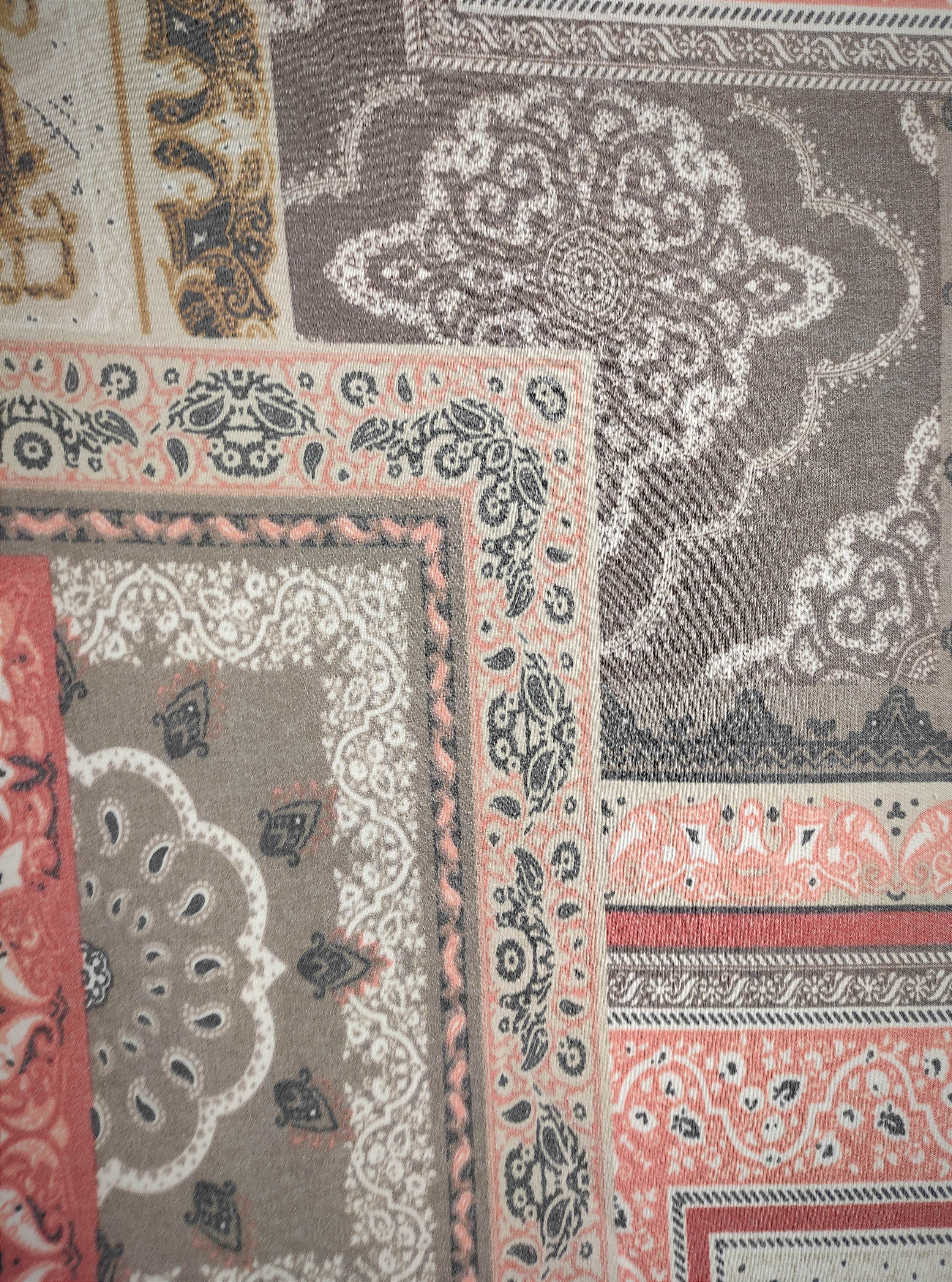 This is a lightweight stretchy fabric with looped interior, with printed bandana/ paisley pattern in Fall colors. Regular Size limited to only 8, Bambino Size is limited to only 10, Ankle Biter Size is limited to 2, Lil Nipper Size is limited to 2. No more will be made when they are gone.