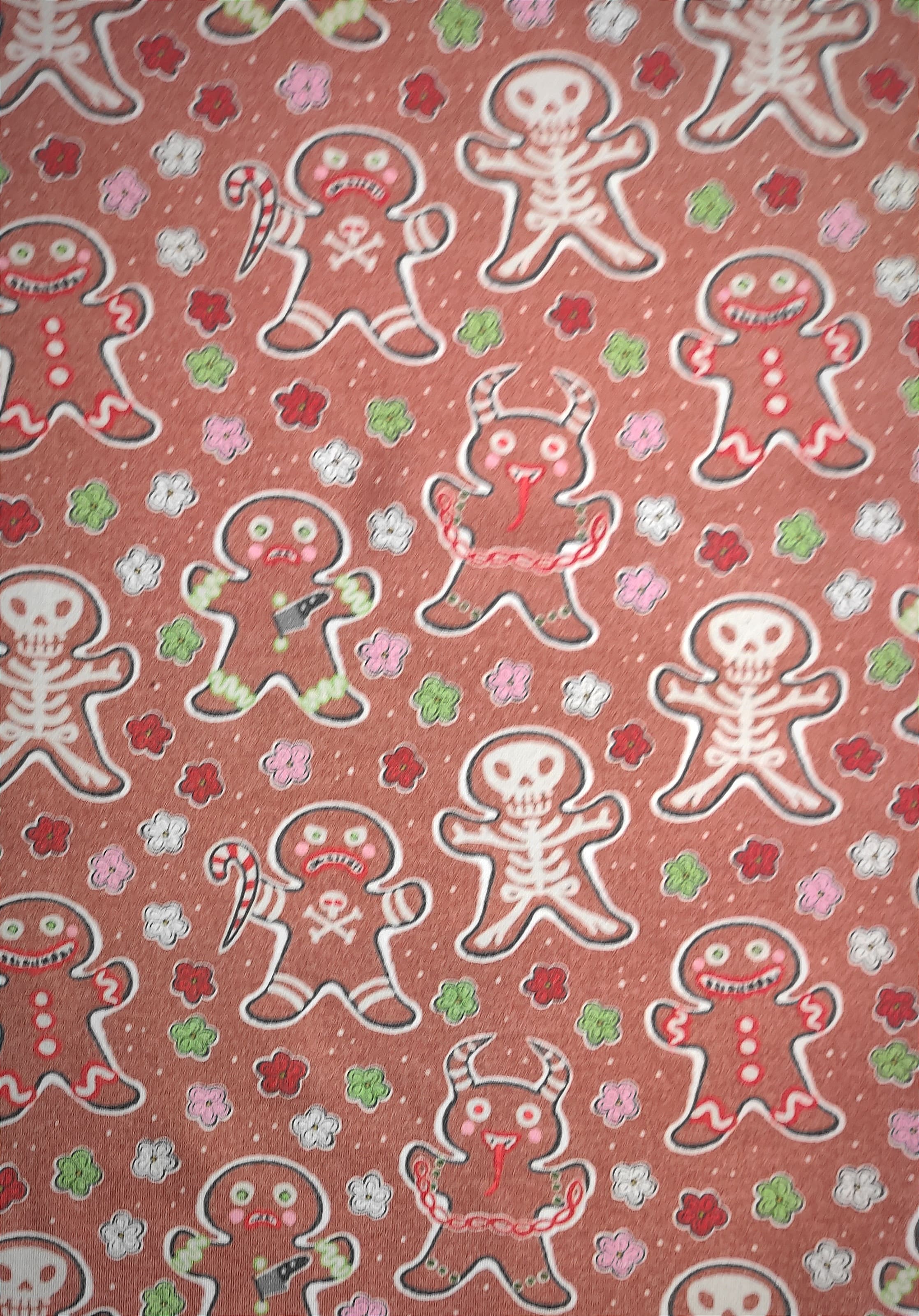 This is an amazing stretchy lightweight cotton spandex fabric with printed with special gingerbread men, finished with black velvet trim 😻 Regular Size limited to only 8, Bambino Size is limited to only 7, Ankle Biter Size is limited to 2. Lil Nipper Size is limited to 2. No more will be made when they are gone.