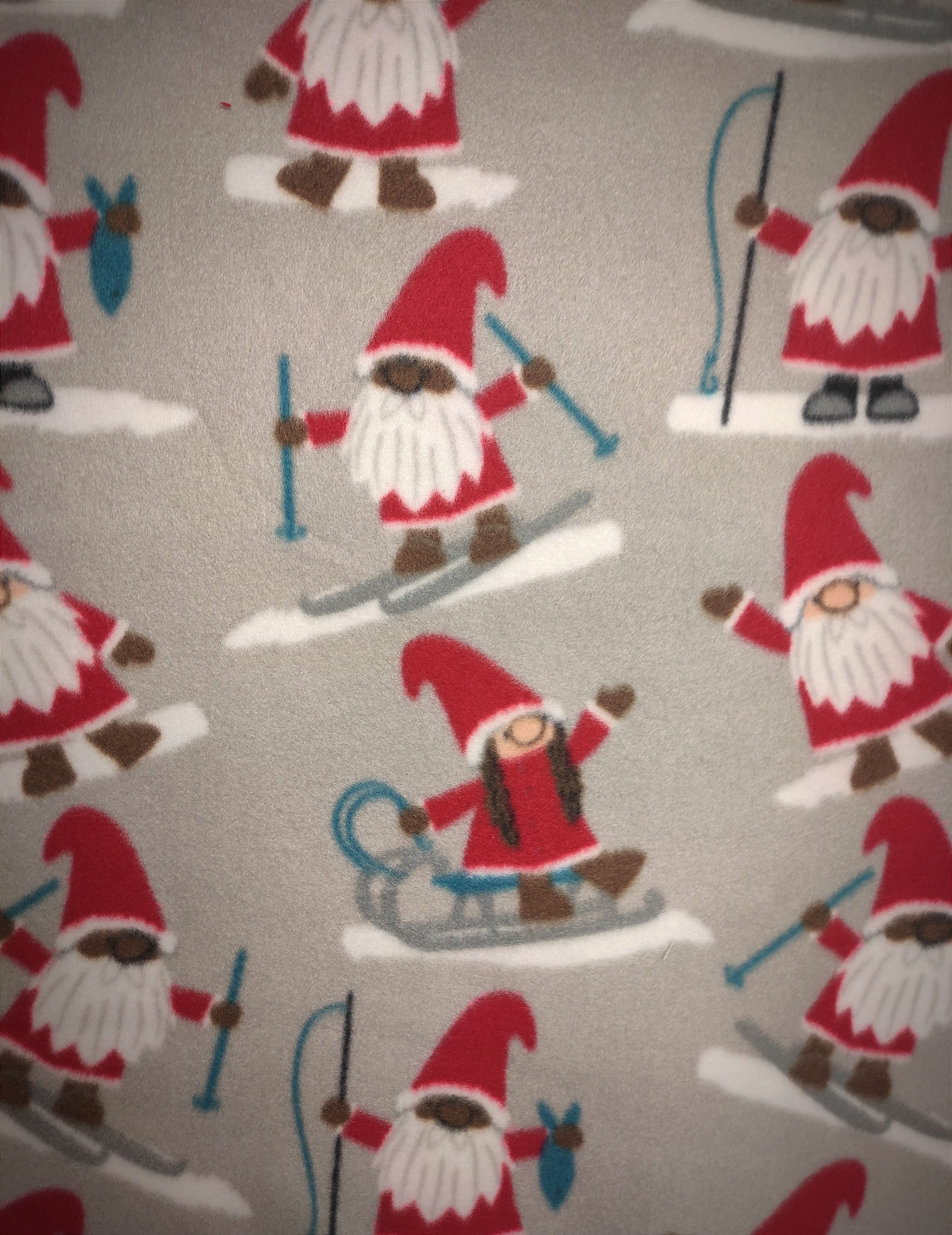 This is a soft medium weight stretchy fleece with cute multi-ethnic xmas gnomes on grey background.