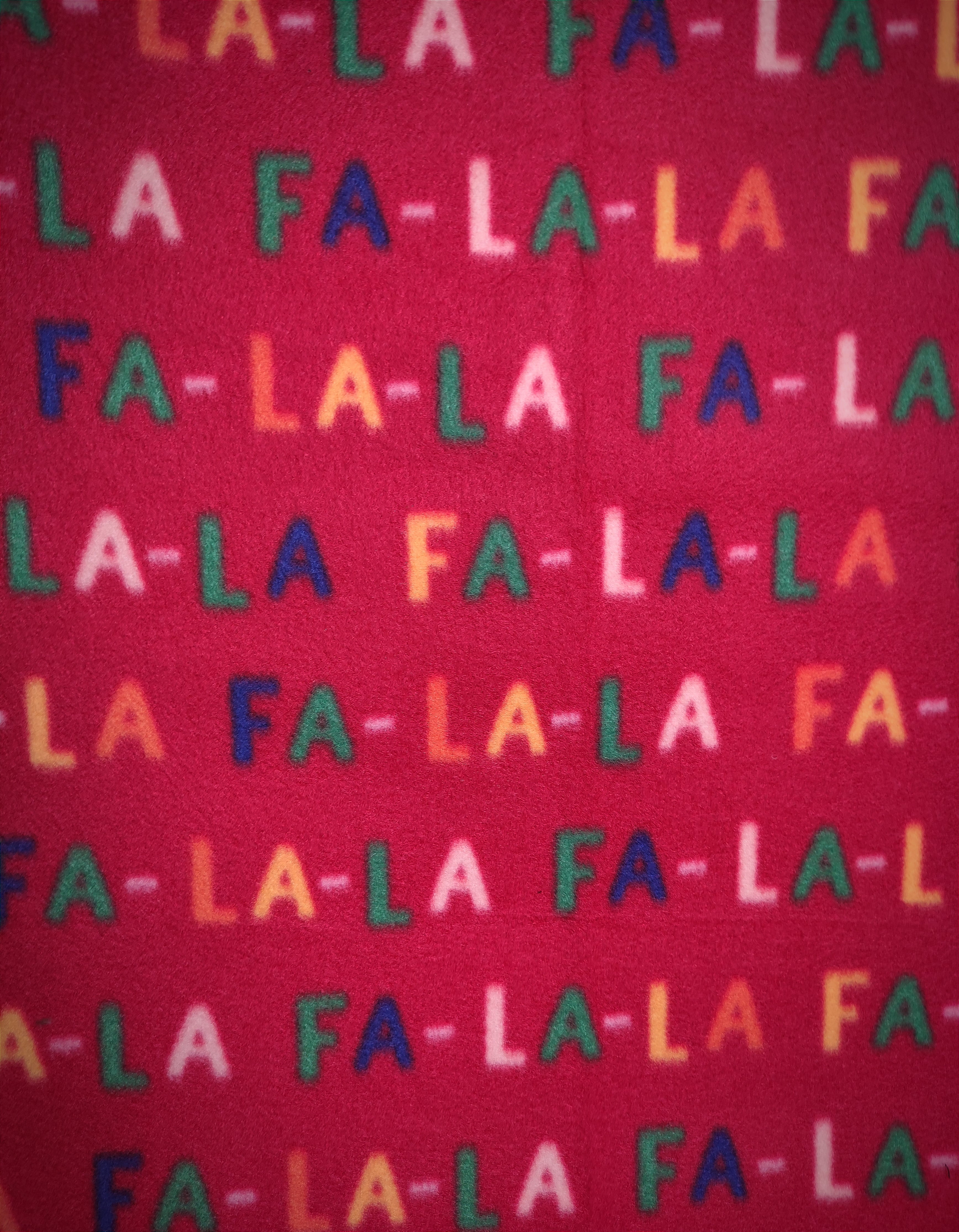 This is a soft medium weight stretchy fleece with multi-colored text FA LA LA on bright red background.