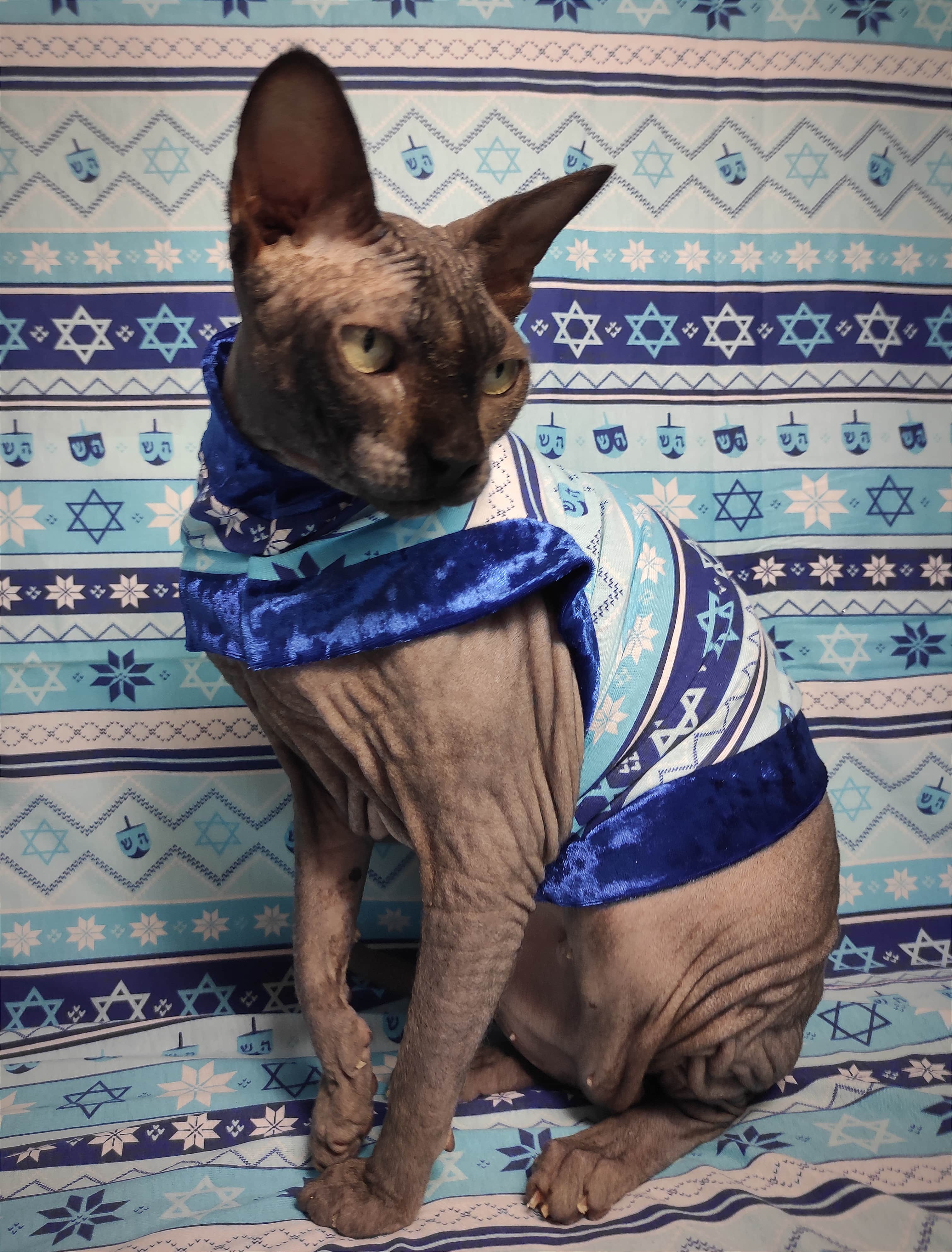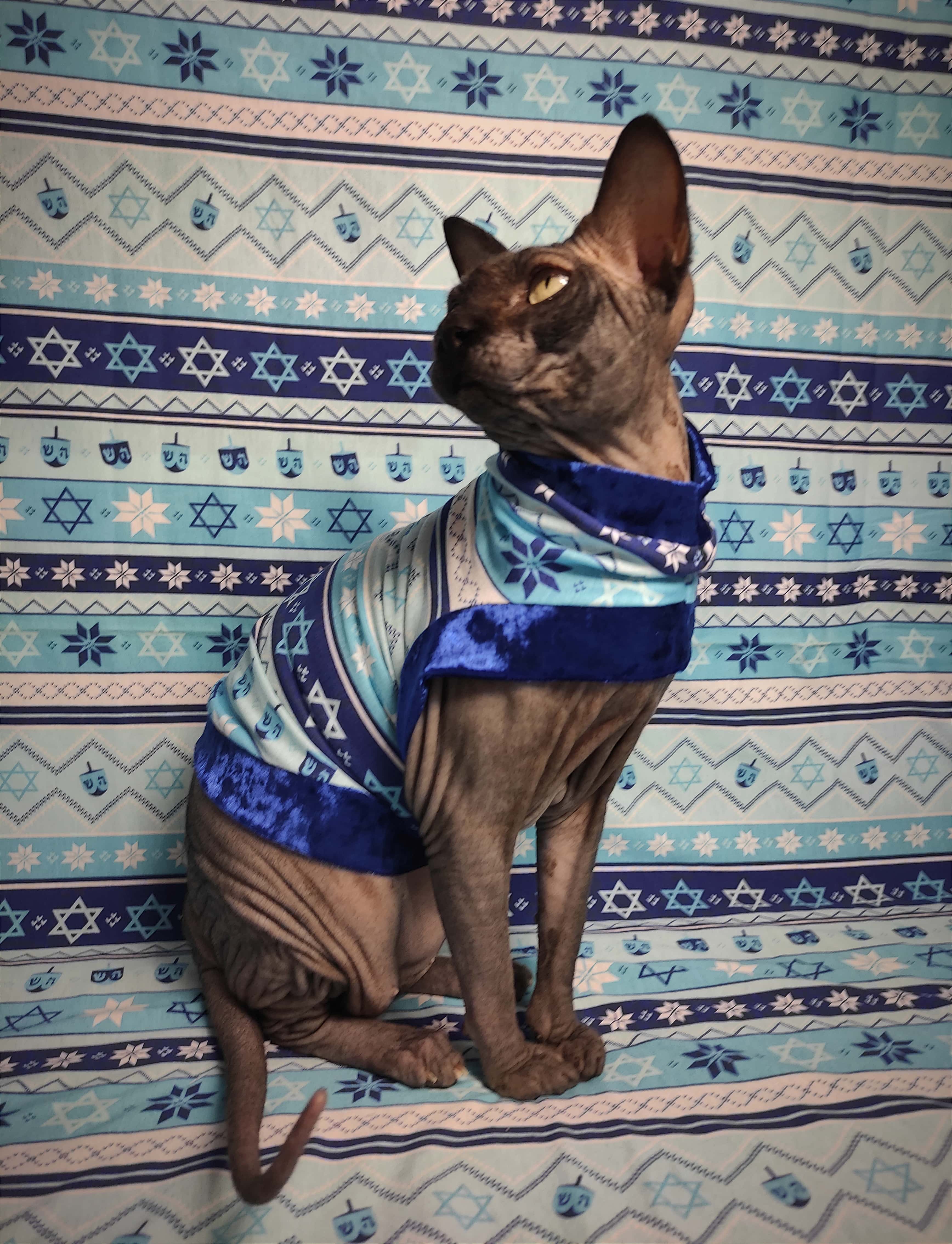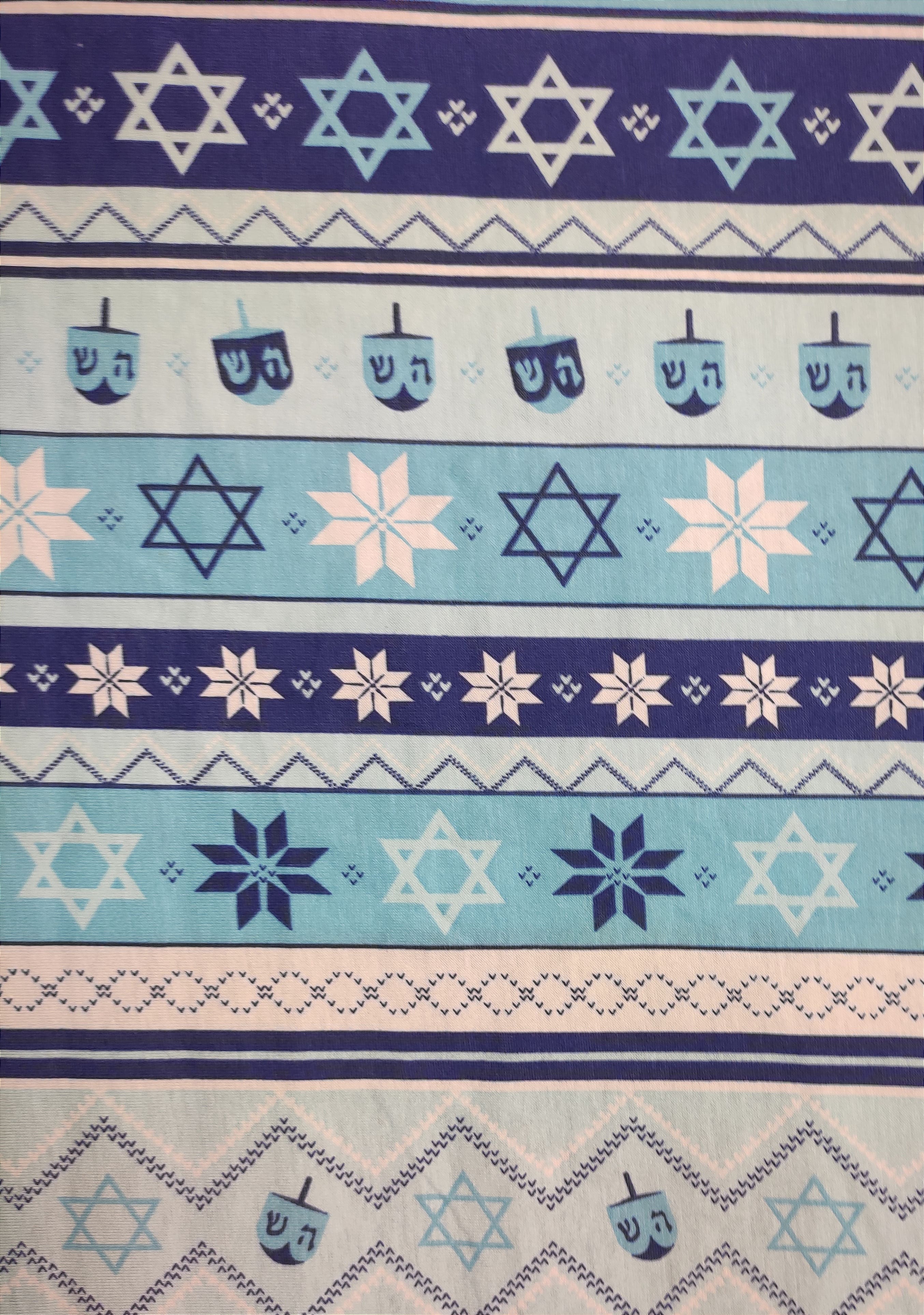 This is a lightweight cotton fabric with printed with Hanukkah fair aisle, finished with blue velvet trim 😻 Regular Size limited to only 8, Bambino Size is limited to only 7, Ankle Biter Size is limited to 2. Lil Nipper Size is limited to 2. No more will be made when they are gone.