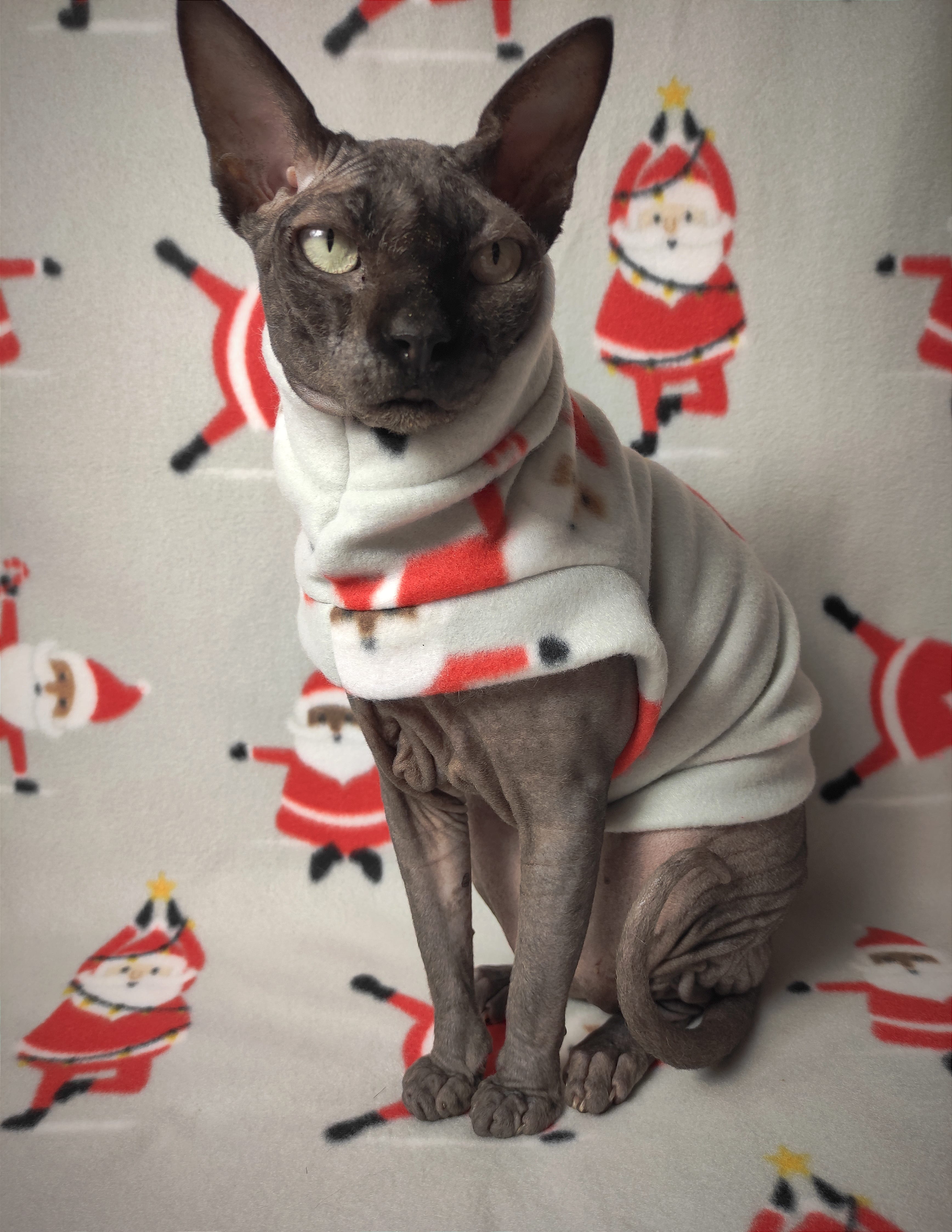 REGULAR size is for most adult hairless cats age 1 to 18. BAMBINO size fits hairless kittens age 6 months to 1 year and smaller adult cats. LIL NIPPER size fits hairless kittens age 8 weeks to 15 week olds for when they are with the breeder or for the trip home. Custom orders are welcome for larger and smaller cats - pricing is the same - $27.50
