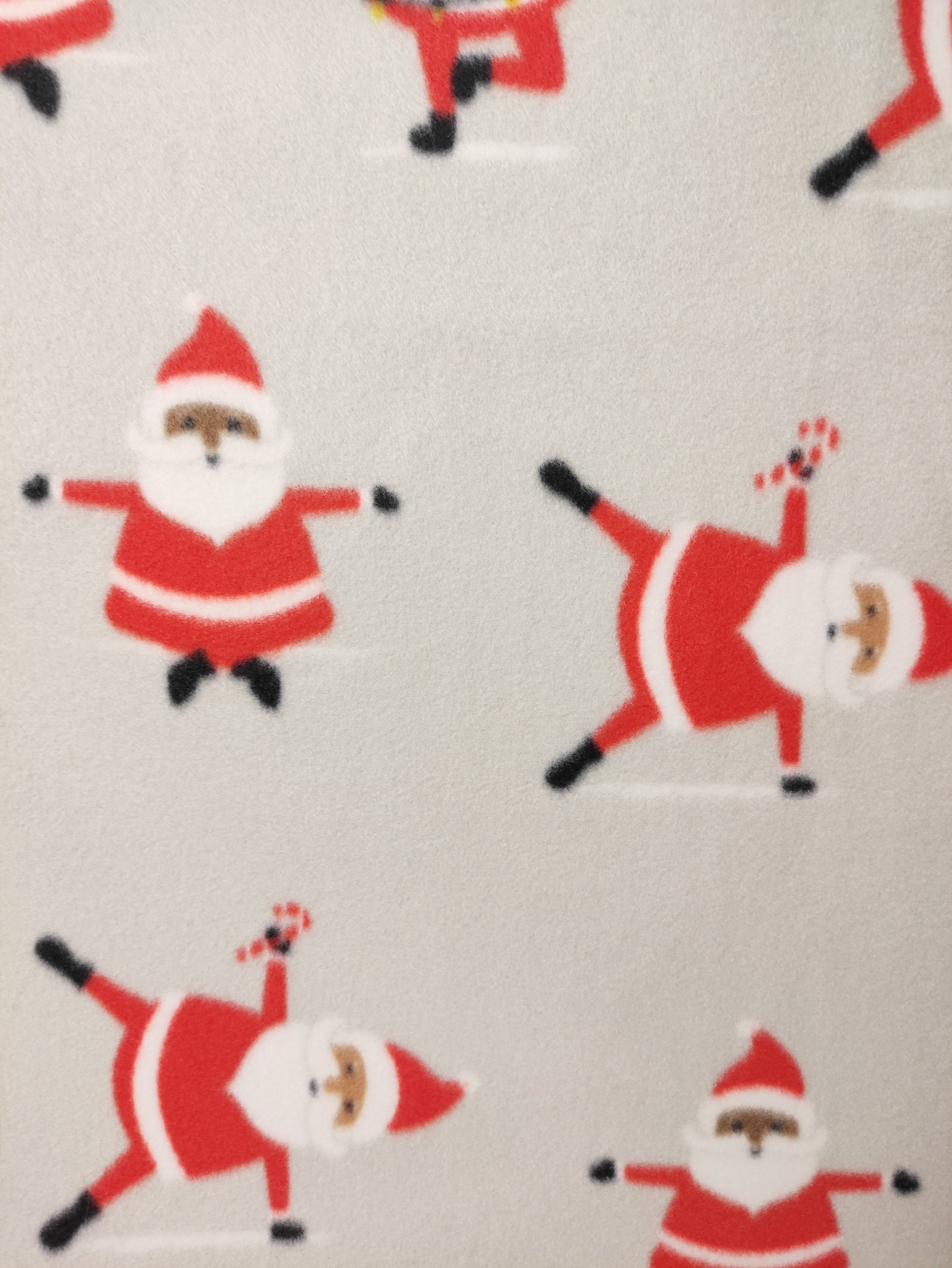 This is a soft medium weight stretchy fleece with International Santas in yoga poses on light grey background.