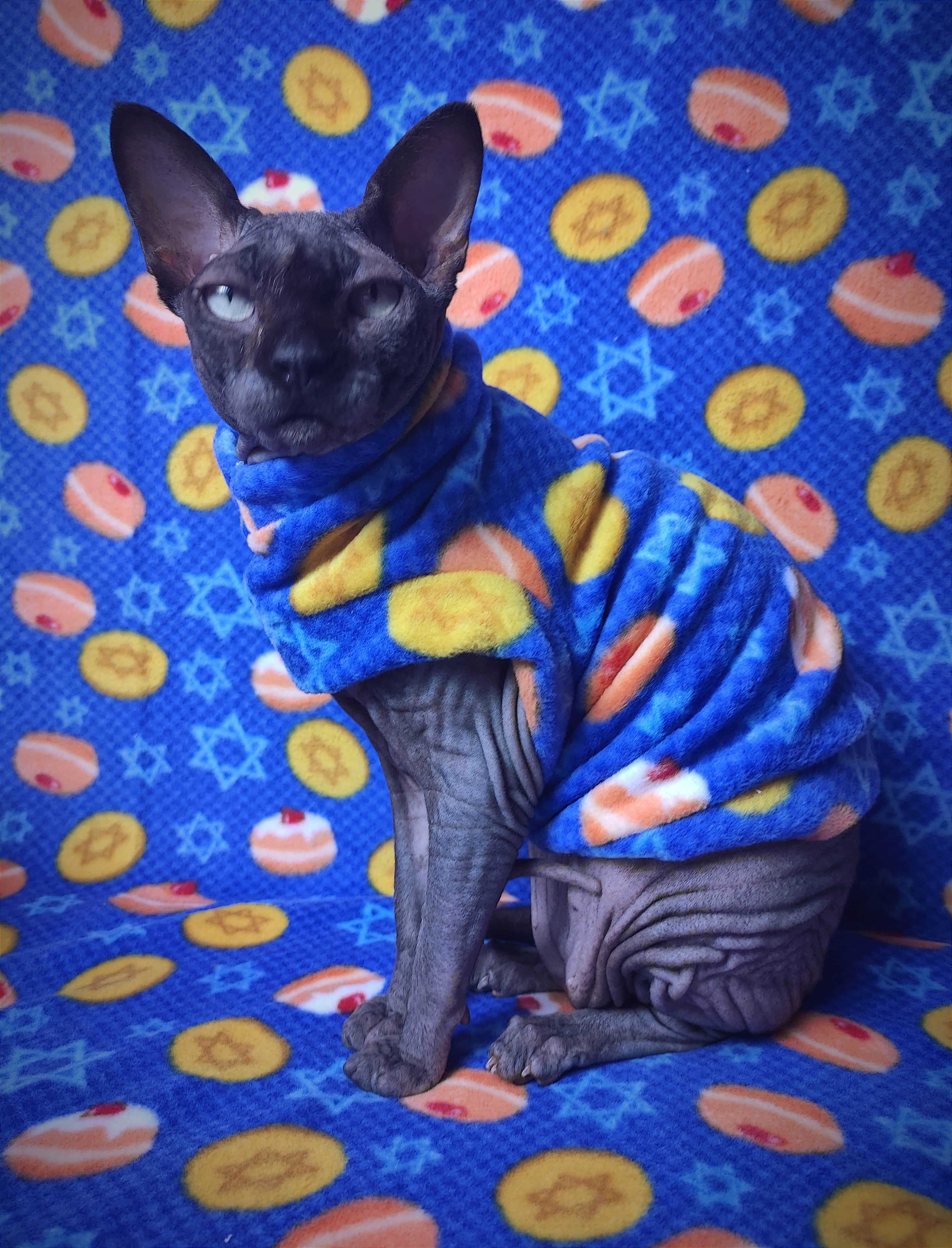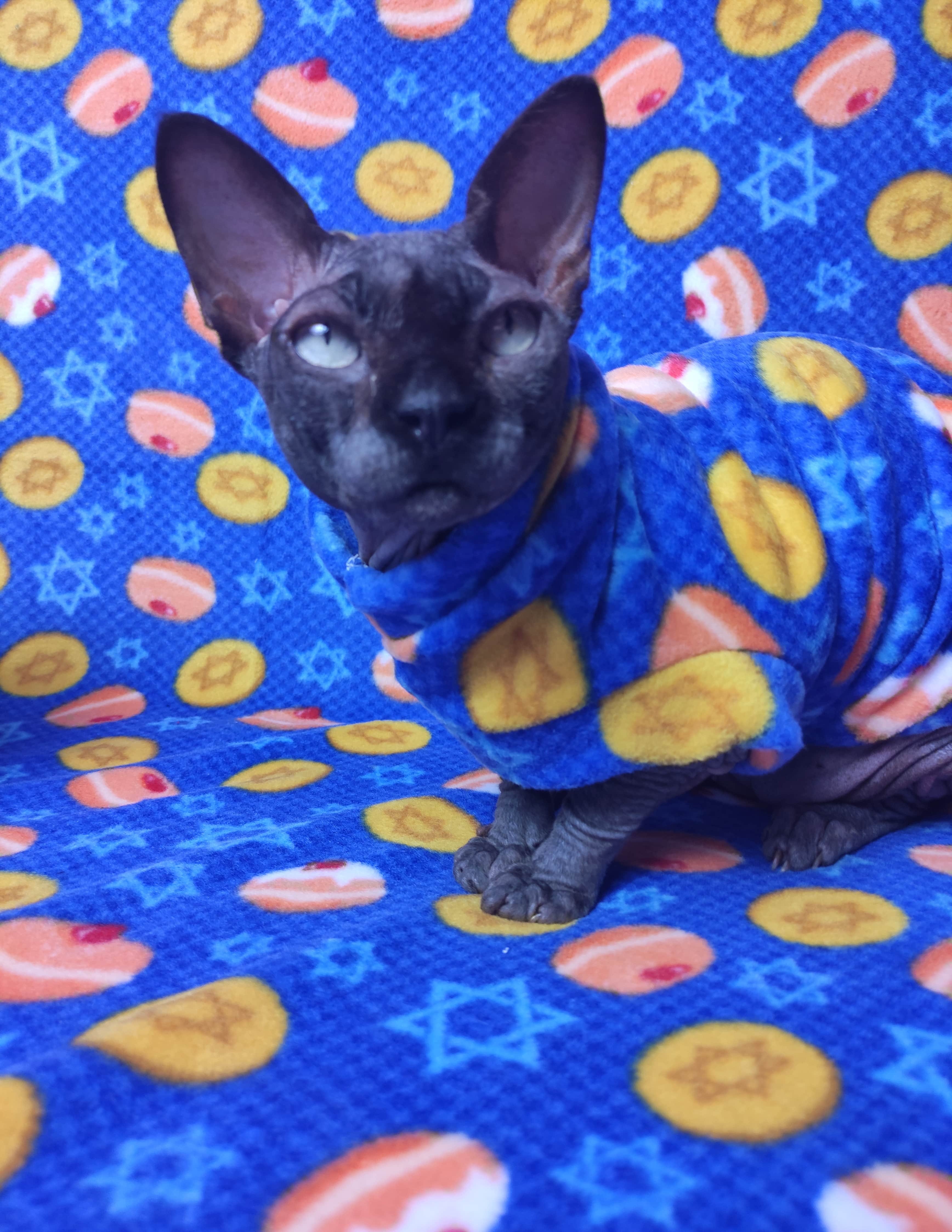 REGULAR size is for most adult hairless cats age 1 to 18. BAMBINO size fits hairless kittens age 6 months to 1 year and smaller adult cats. LIL NIPPER size fits hairless kittens age 8 weeks to 15 week olds for when they are with the breeder or for the trip home. Custom orders are welcome for larger and smaller cats - pricing is the same - $27.50
