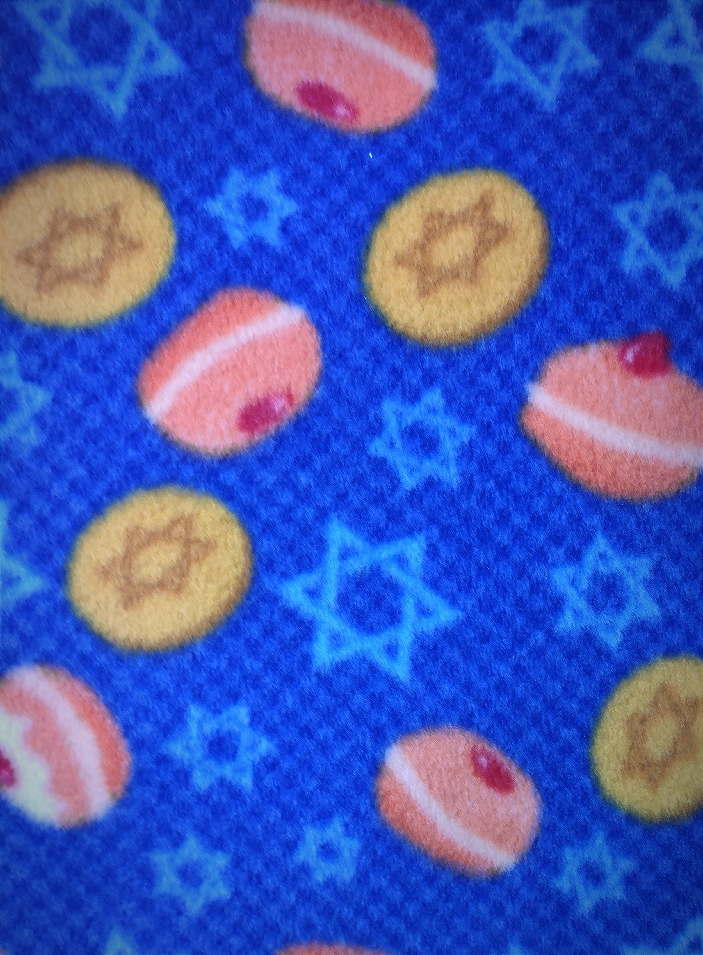 This is a very soft medium weight stretchy luxe fleece with Hanukkah Treats on blue and black graphic background.