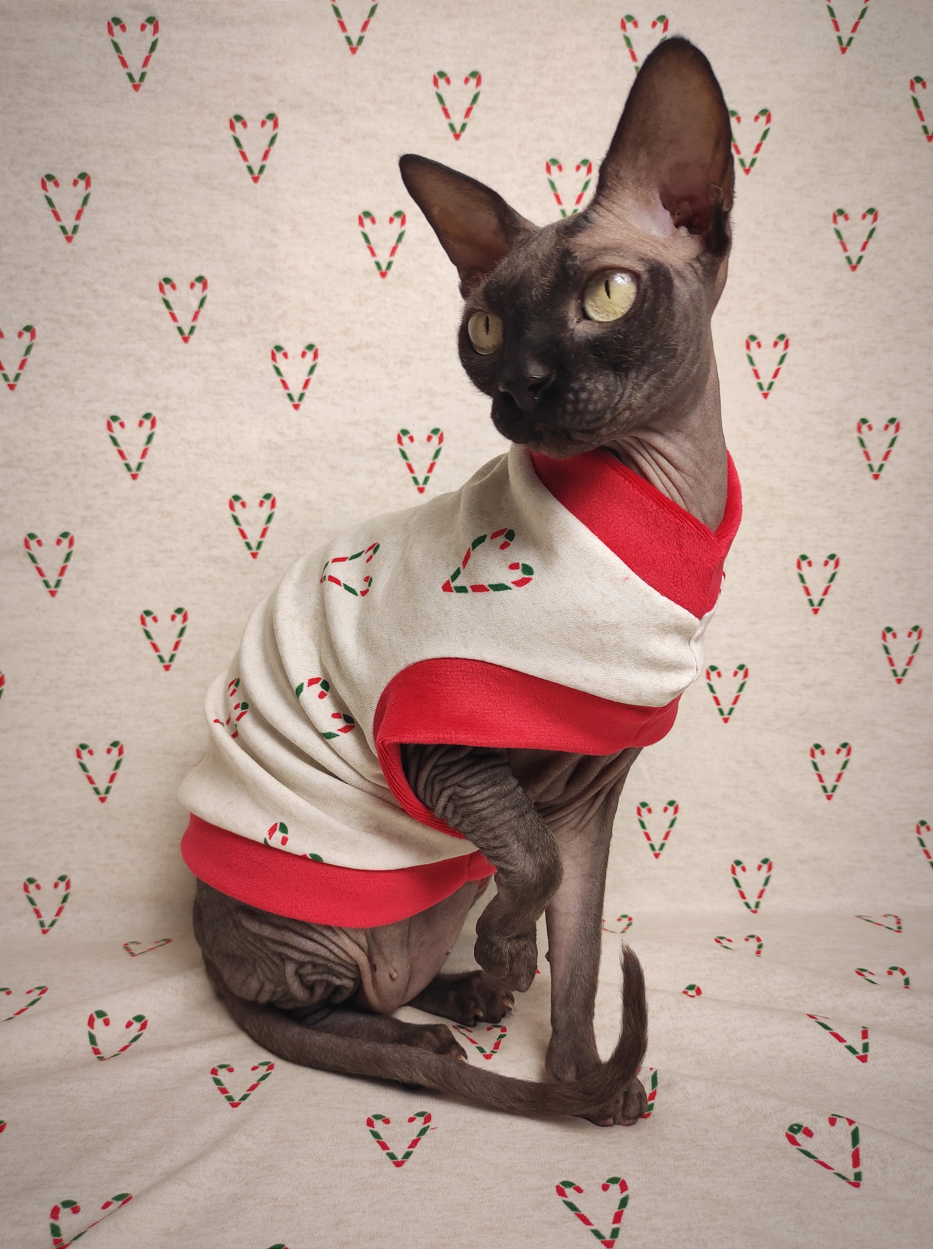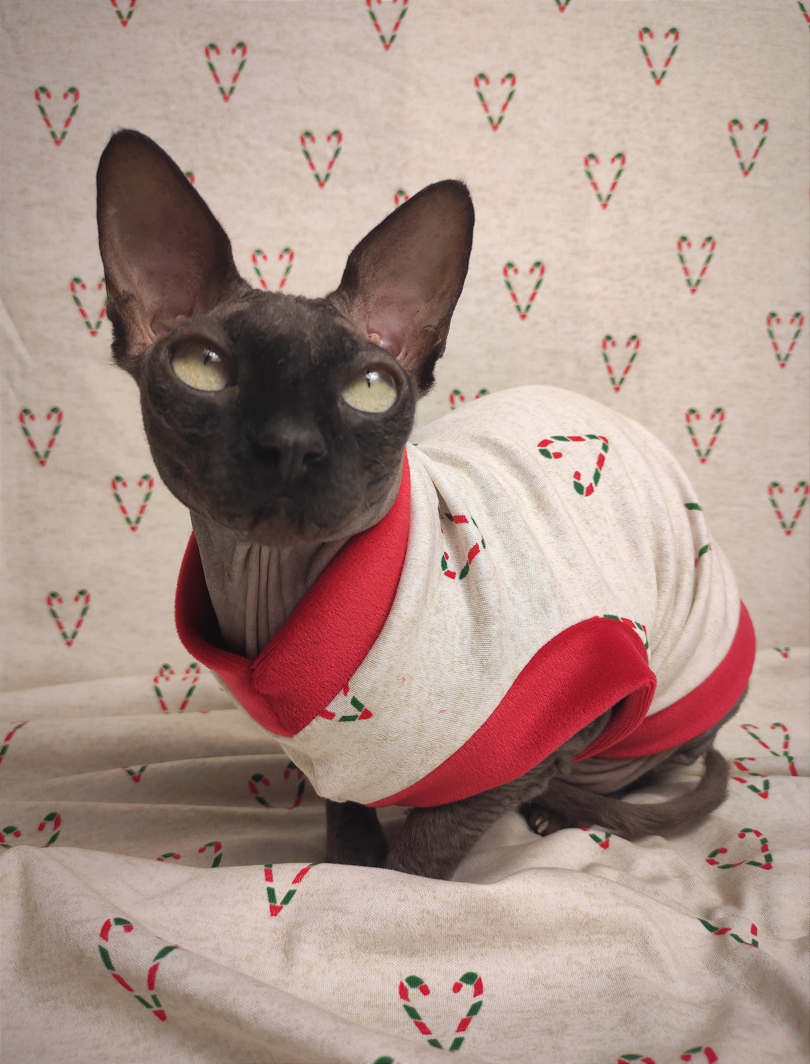REGULAR size is for most adult hairless cats age 1 to 18. BAMBINO size fits hairless kittens age 6 months to 1 year and smaller adult cats. ANKLE BITER size fits kittens 15 weeks to 6 month olds. LIL NIPPER size fits hairless kittens age 8 weeks to 15 week olds for when they are with the breeder or for the trip home. Custom orders are welcome for larger and smaller cats - pricing is the same - $27.50