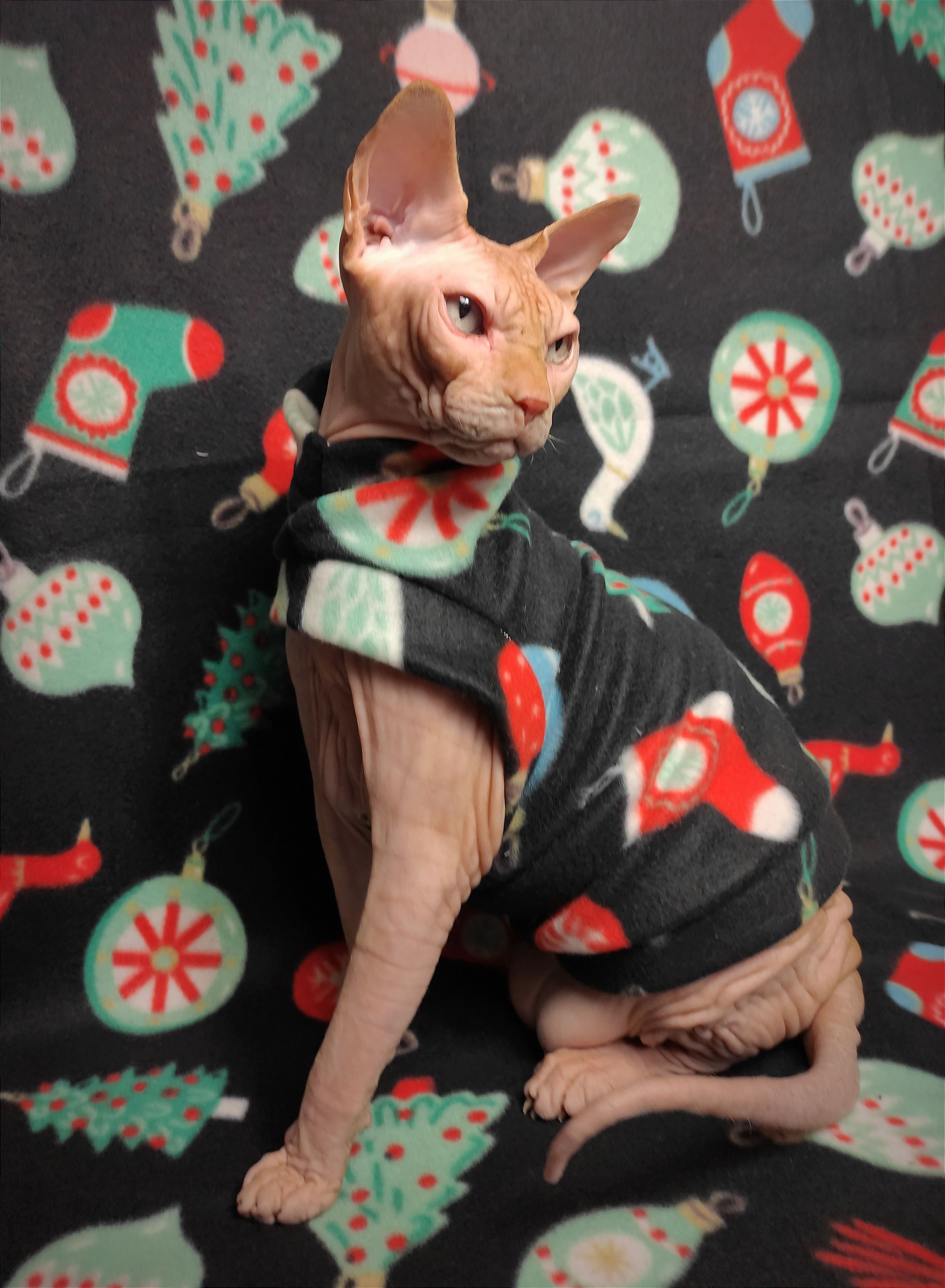 REGULAR size is for most adult hairless cats age 1 to 18. BAMBINO size fits hairless kittens age 6 months to 1 year and smaller adult cats. LIL NIPPER size fits hairless kittens age 8 weeks to 15 week olds for when they are with the breeder or for the trip home. Custom orders are welcome for larger and smaller cats - pricing is the same - $27.50