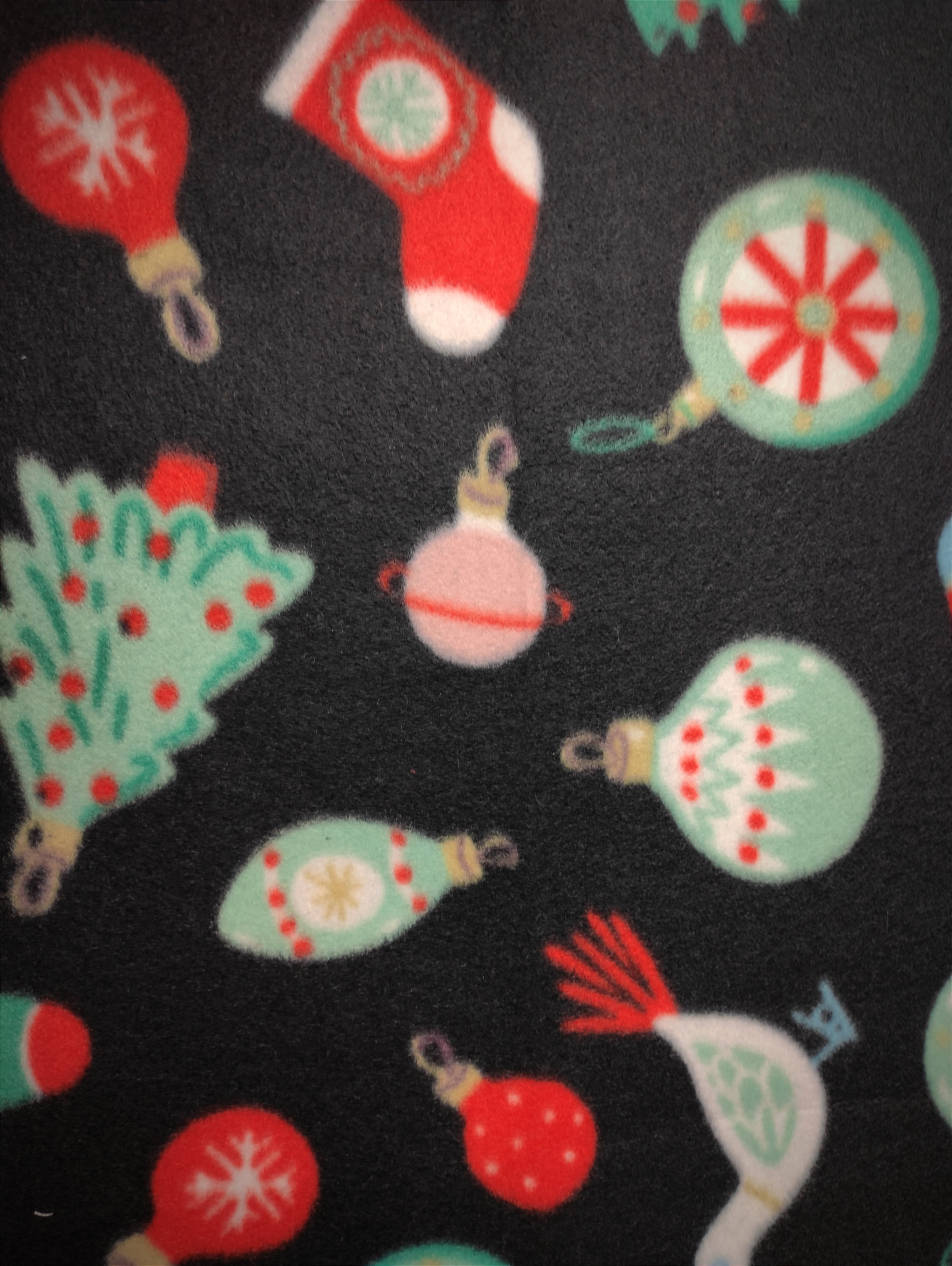 This is a very soft medium weight stretchy luxe fleece with Christmas tree ornaments on black background.
