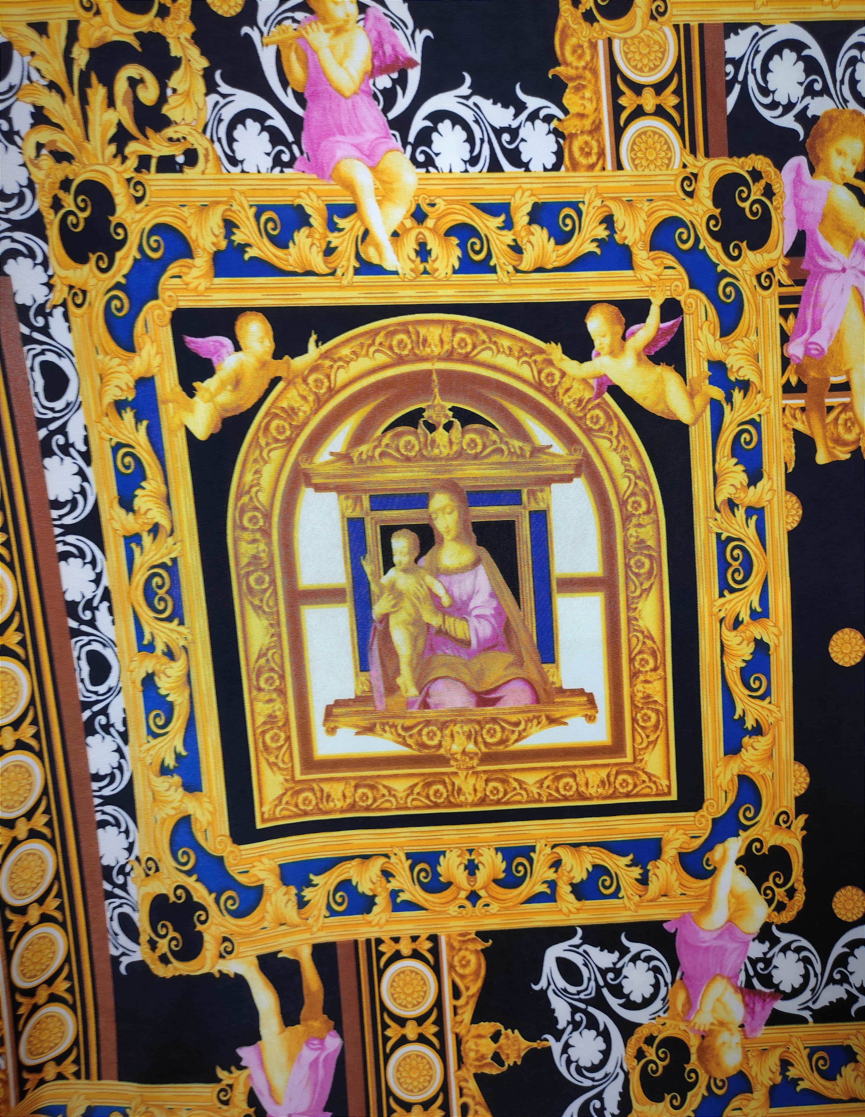 This is an amazing stretchy lightweight poly/ spandex fabric printed with gorgeous Madonna and Child motif adorned with black velvet trim.😻 Regular Size limited to only 8, Bambino Size is limited to only 7, Ankle Biter Size is limited to 2. Lil Nipper Size is limited to 2. No more will be made when they are gone.