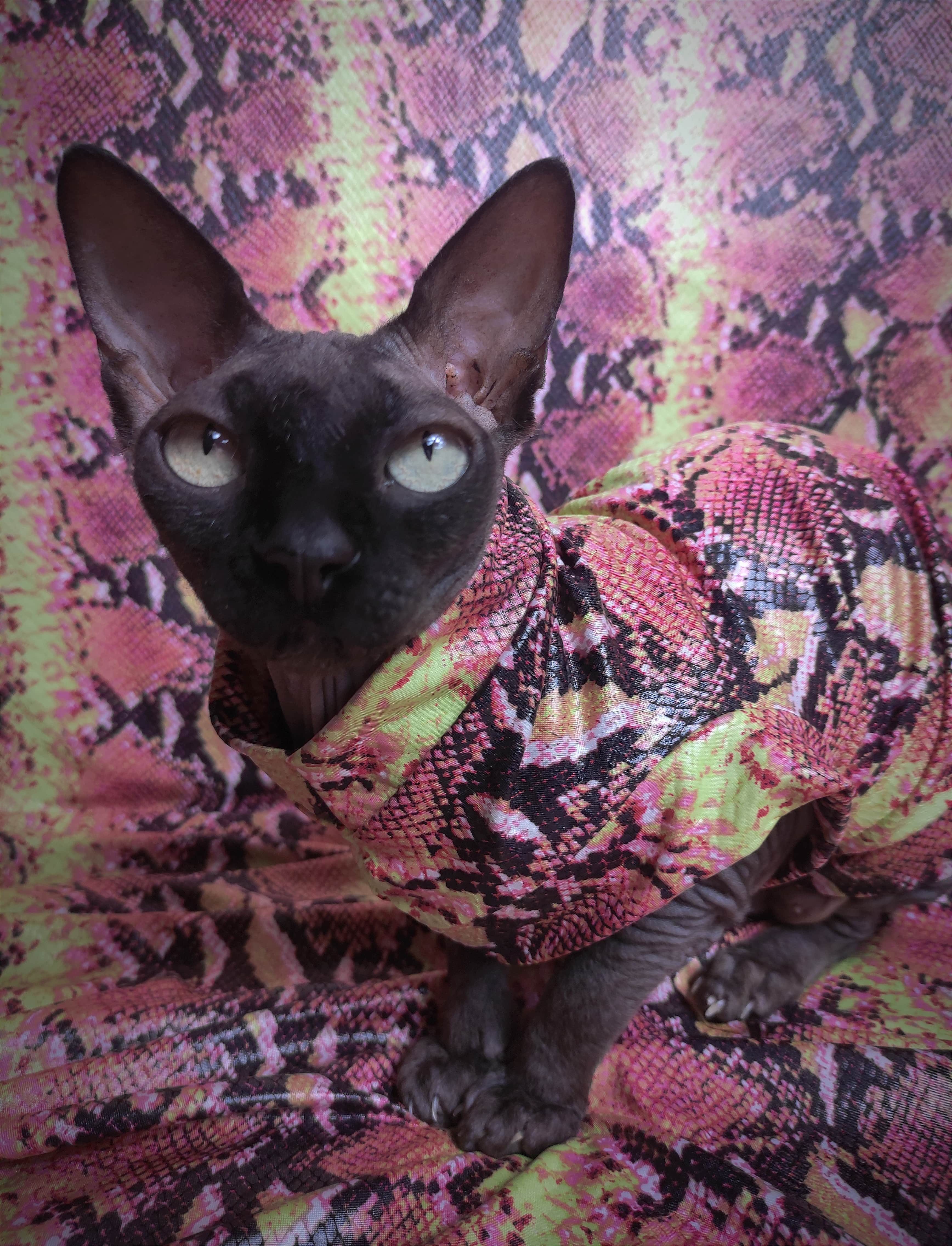 REGULAR size is for most adult hairless cats age 1 to 18. BAMBINO size fits hairless kittens age 6 months to 1 year and smaller adult cats. ANKLE BITER size fits kittens 15 weeks to 6 month olds. LIL NIPPER size fits hairless kittens age 8 weeks to 15 week olds for when they are with the breeder or for the trip home. Custom orders are welcome for larger and smaller cats - pricing is the same - $27.50