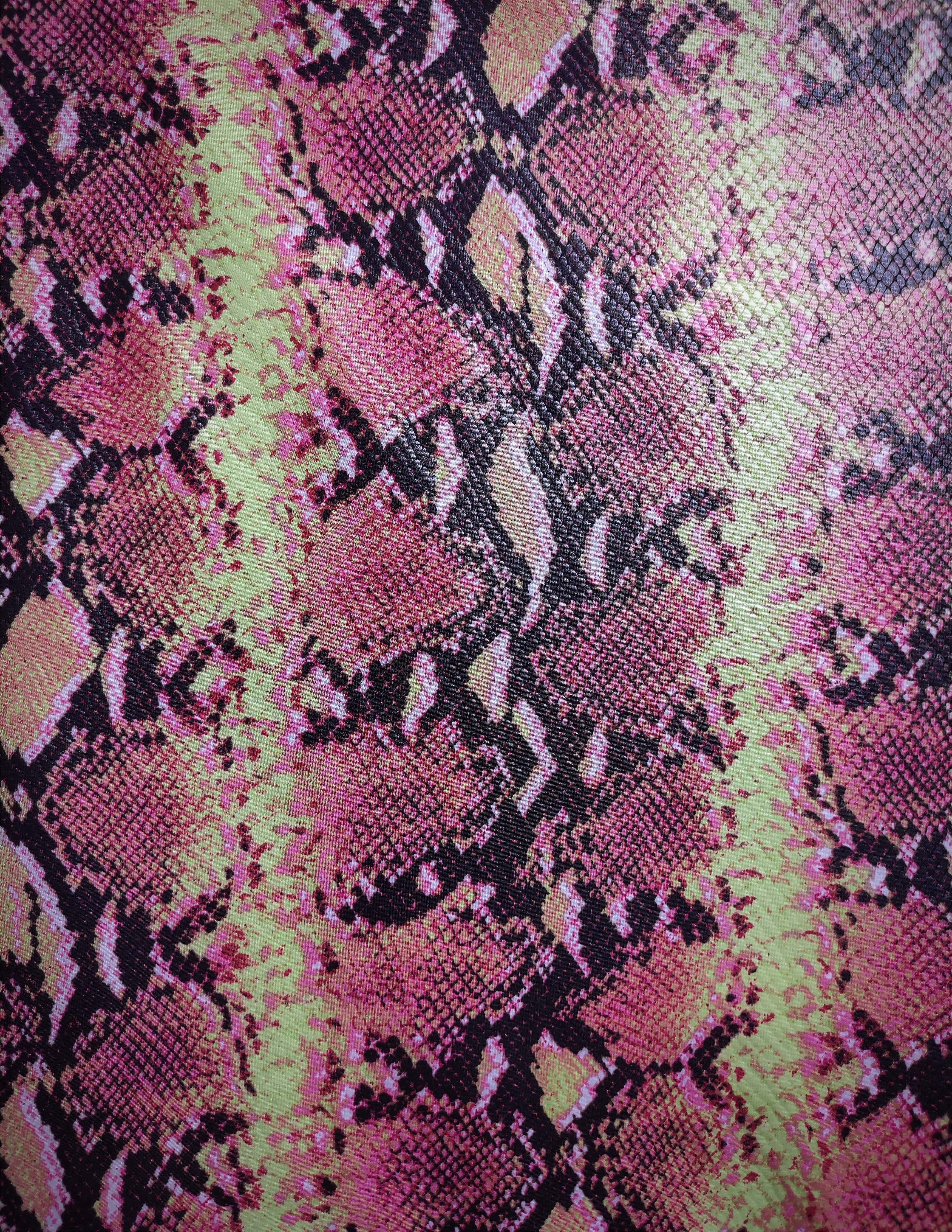 This is a stretchy polyester fabric with printed pink yellow snakeskin and the scales printed with spot gloss. This fabric has minimal stretch 😻 Regular Size limited to only 7. Bambino Size is limited to only 8. Ankle Biter Size is limited to 2, Lil Nipper Size is limited to 2. No more will be made when they are gone.