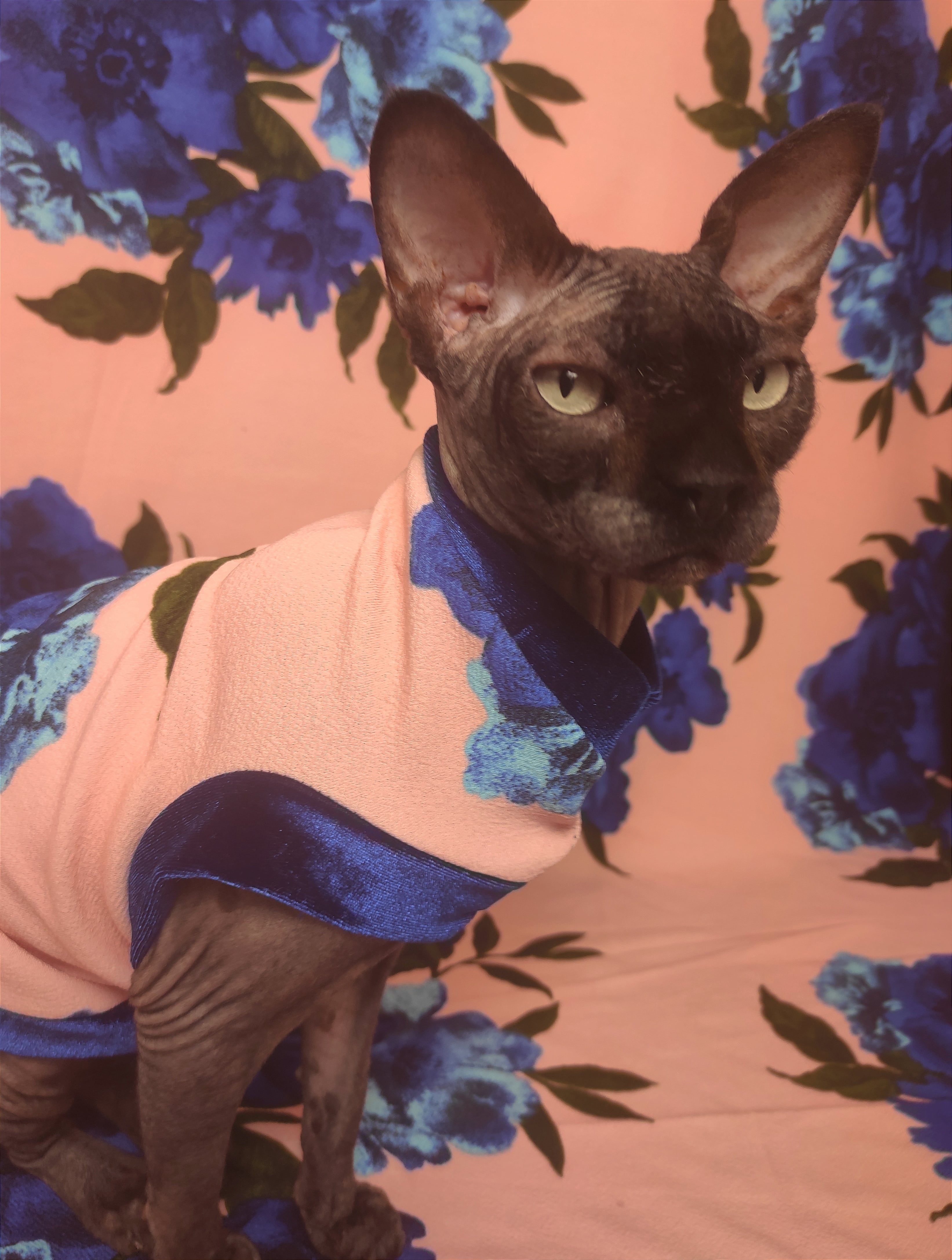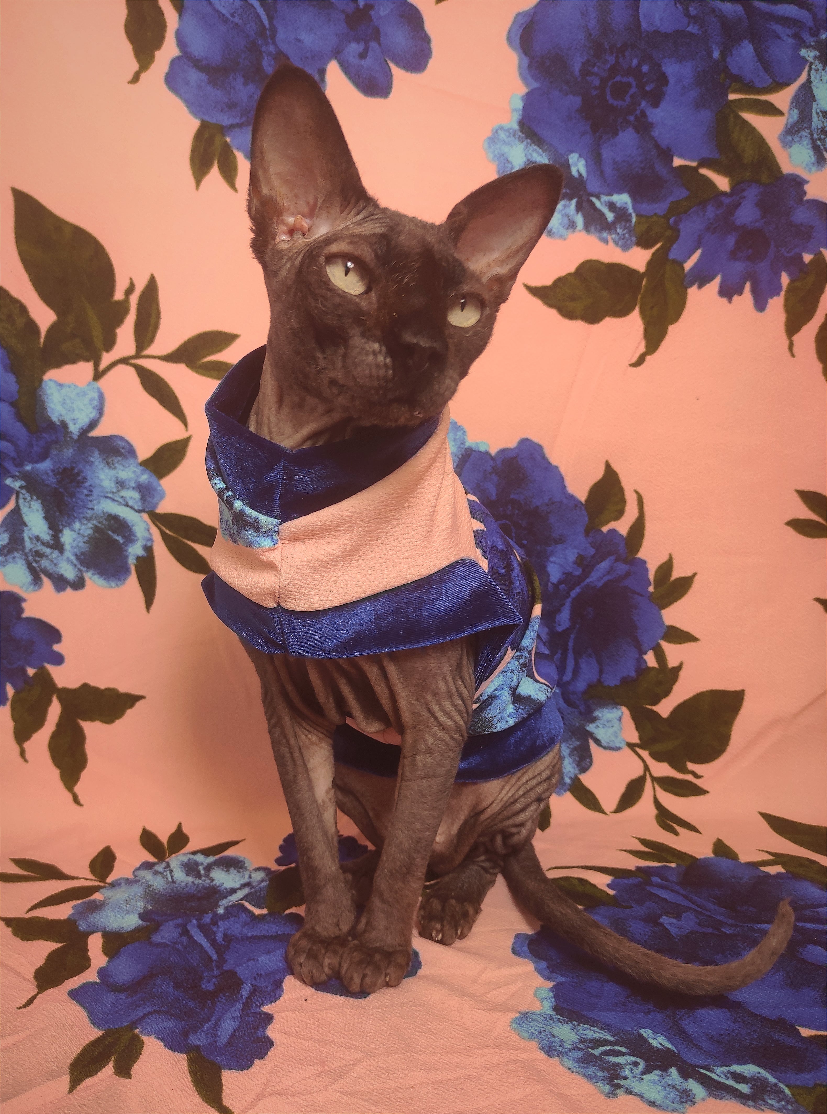 This is an amazing lightweight poly blend fabric with blue roses on peach background, adorned with royal blue velvet. 😻 Regular Size limited to only 8, Bambino Size is limited to only 7, Ankle Biter Size is limited to 2. Lil Nipper Size is limited to 2. No more will be made when they are gone.