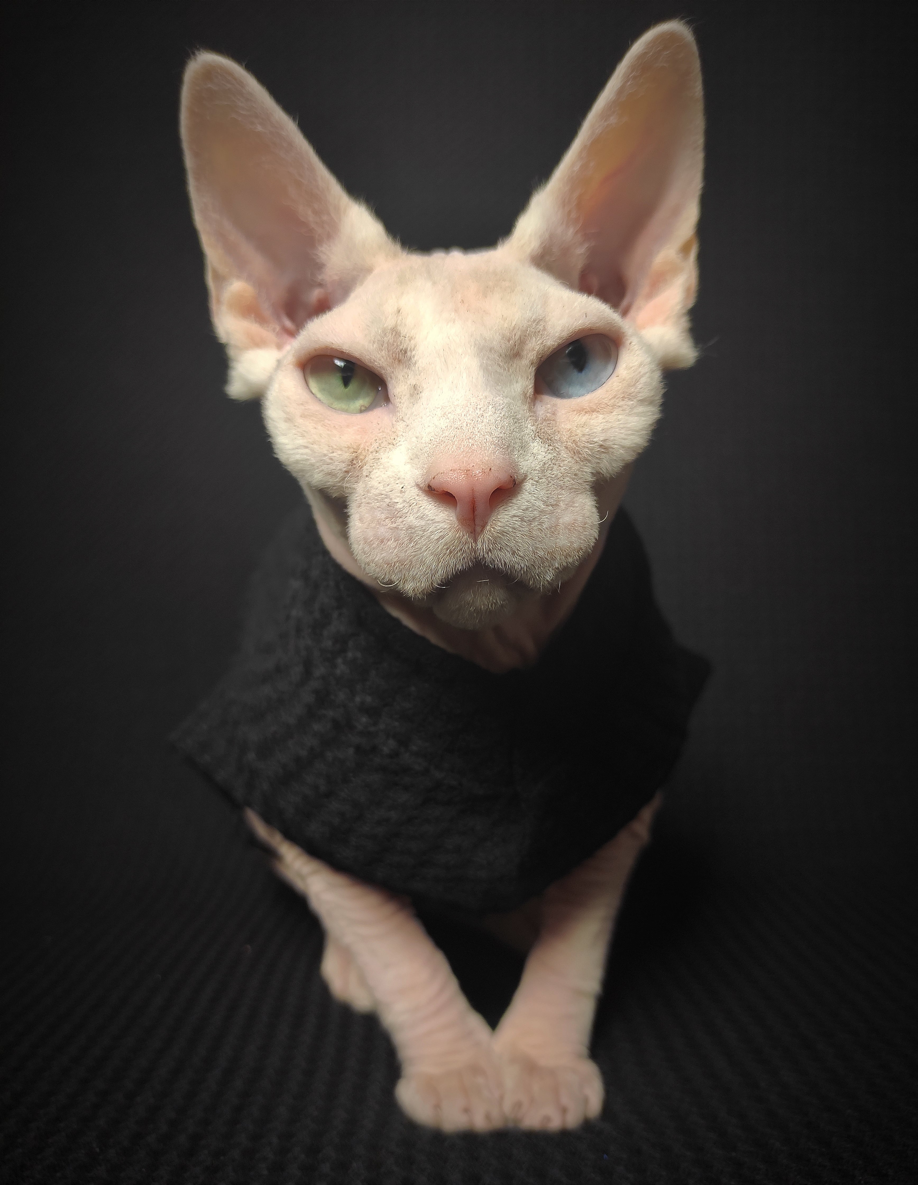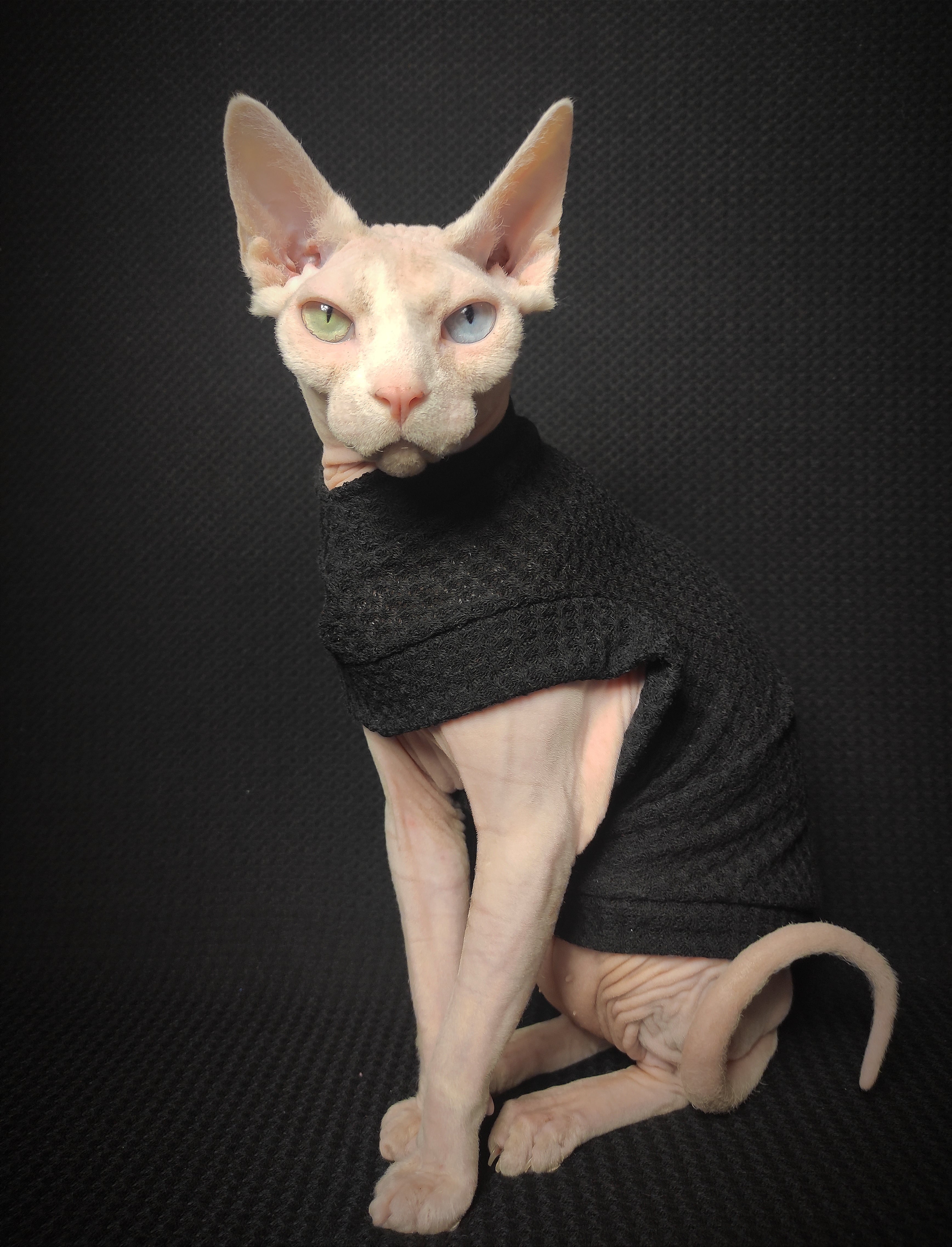 REGULAR size is for most adult hairless cats age 1 to 18. BAMBINO size fits hairless kittens age 6 months to 1 year and smaller adult cats. ANKLE BITER size fits hairless kittens 15 week to 6 month olds. LIL NIPPER size fits hairless kittens age 8 weeks to 15 week olds for when they are with the breeder or for the trip home. Custom orders are welcome for larger and smaller cats - pricing is the same - $27.50