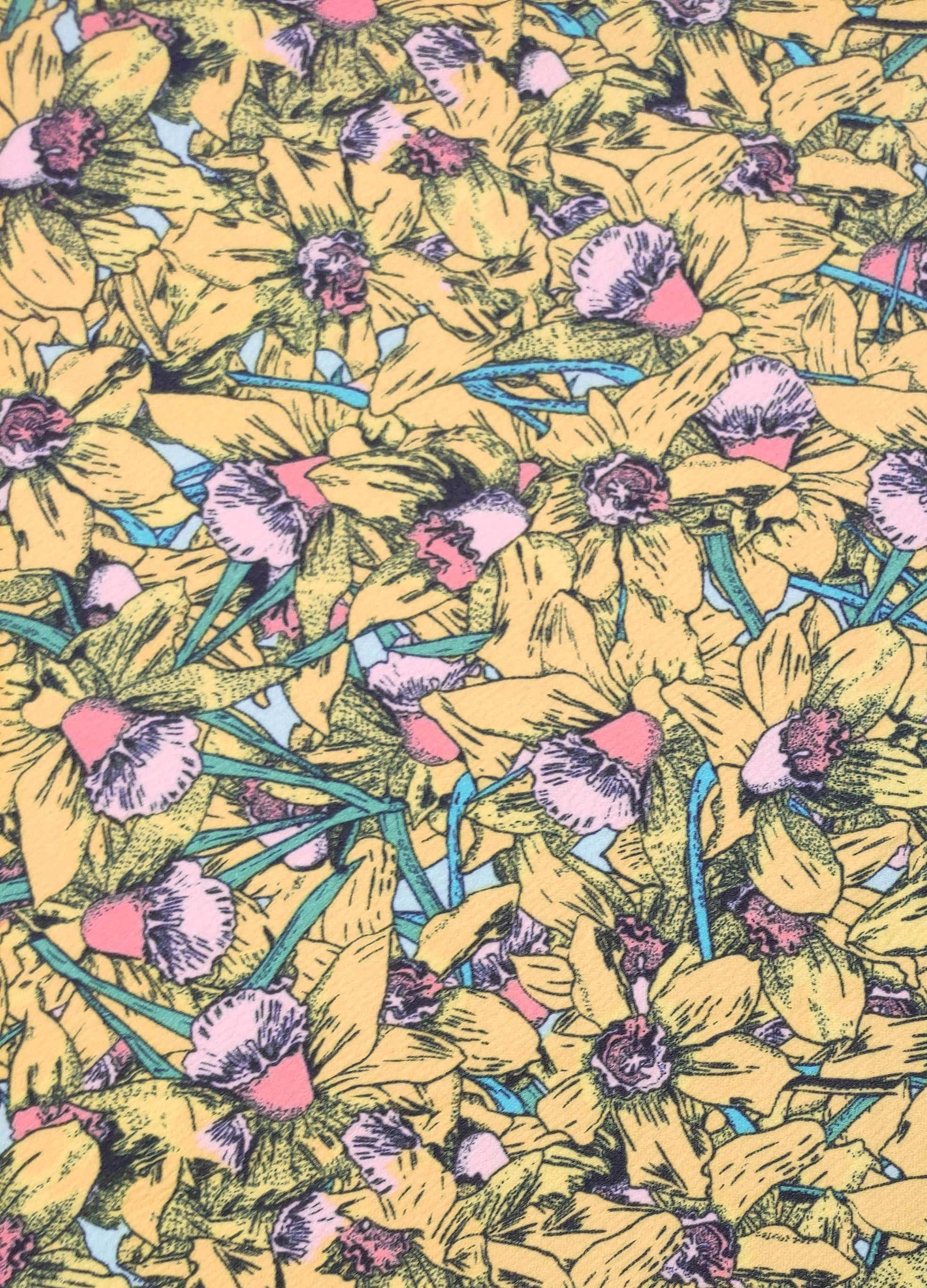 This is an amazing stretchy midweight polyester spandex textured fabric printed with daffodils , with a comfy black velvet trim. 😻 Regular Size limited to only 8, Bambino Size is limited to only 7, Ankle Biter Size is limited to 2. Lil Nipper Size is limited to 2. No more will be made when they are gone.