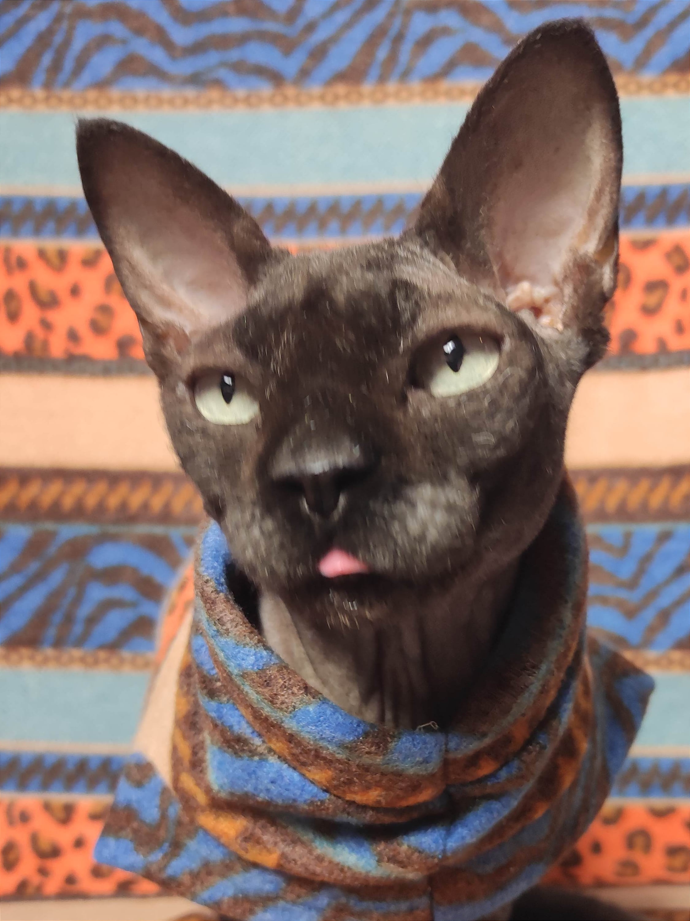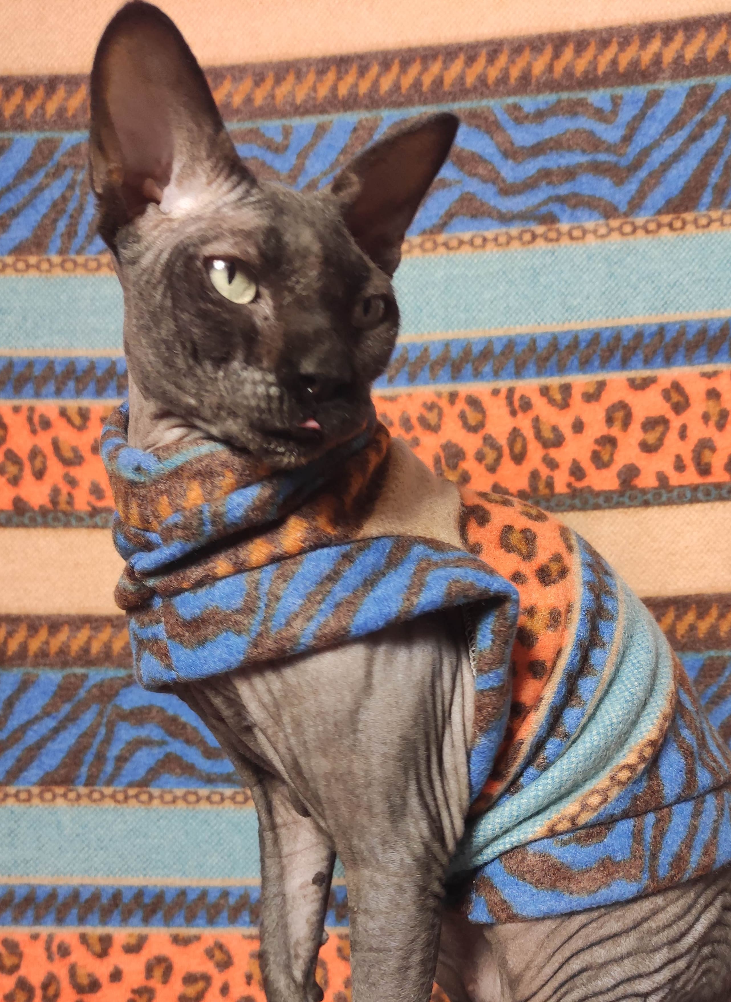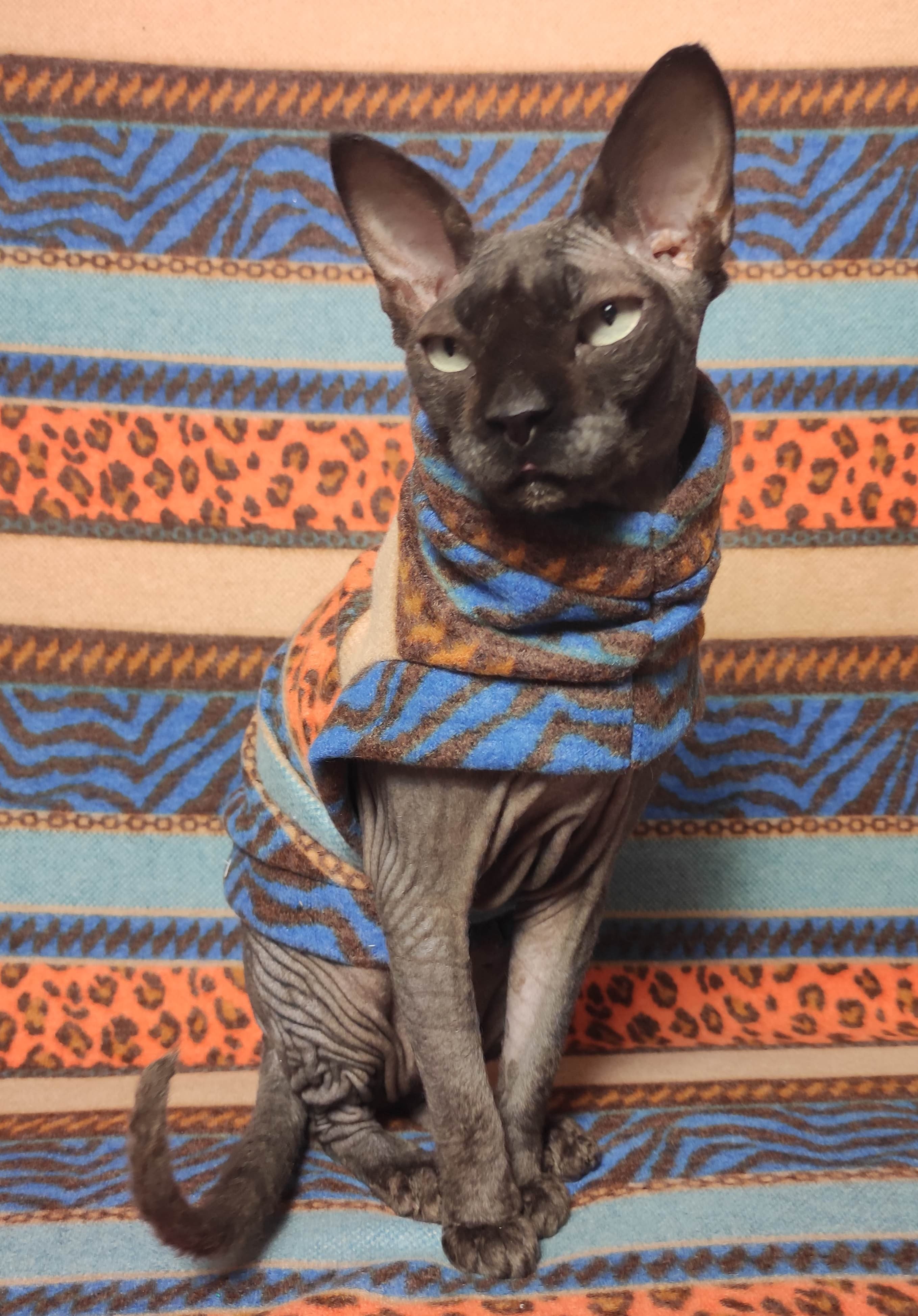 REGULAR size is for most adult hairless cats age 1 to 18. BAMBINO size fits hairless kittens age 6 months to 1 year and smaller adult cats. ANKLE BITER size fits kittens 15 weeks to 6 month olds. LIL NIPPER size fits hairless kittens age 8 weeks to 15 week olds for when they are with the breeder or for the trip home. Custom orders are welcome for larger and smaller cats - pricing is the same - $27.50