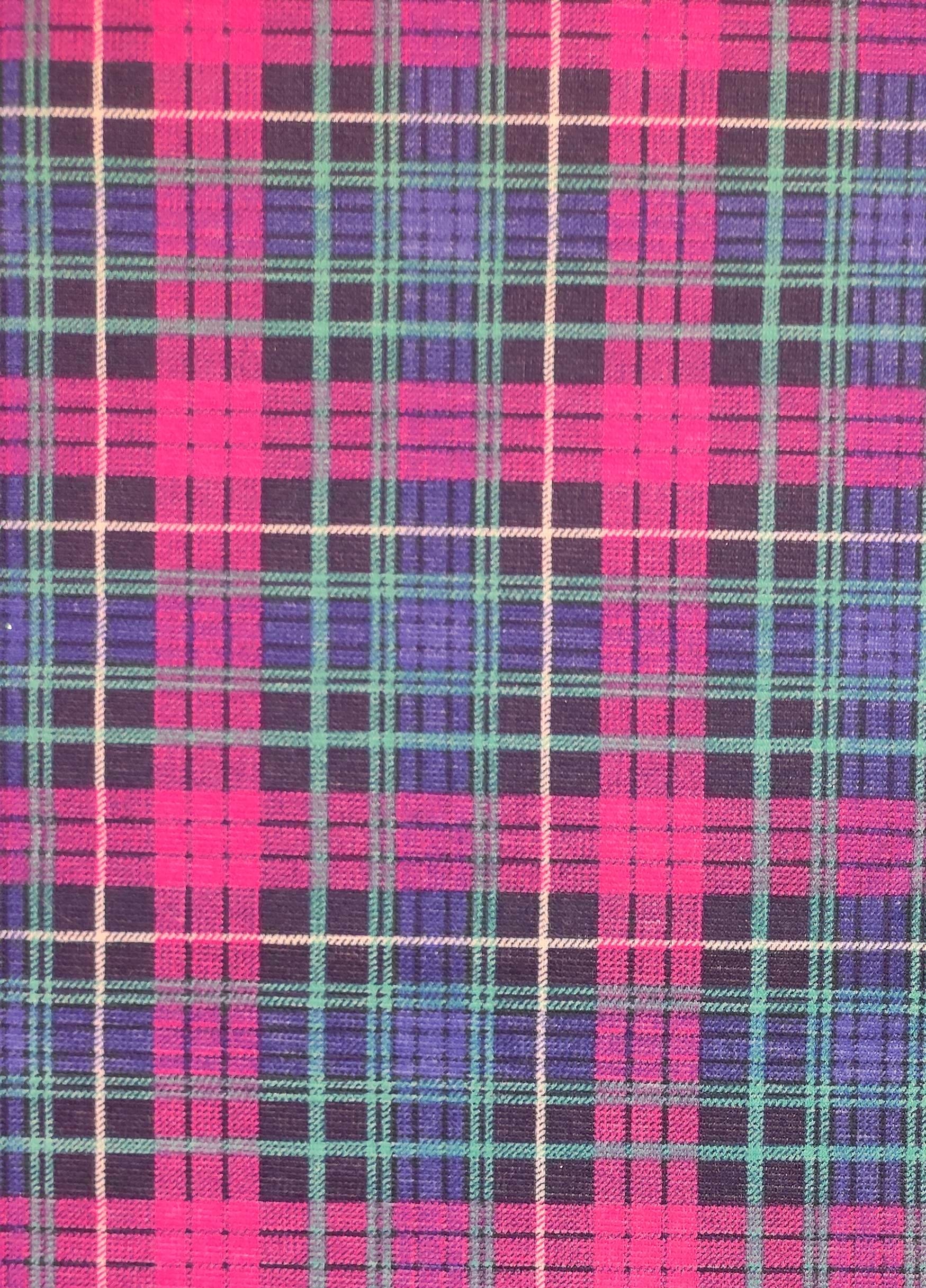 This is a stretchy lightweight fabric printed with bold plaid pattern in pink, purple teal and black. Regular Size limited to only 7. Bambino Size limited to only 8. Ankle Biter Size limited to only 2. Lil Nipper size limited to only 2. No more will be made when they are gone.