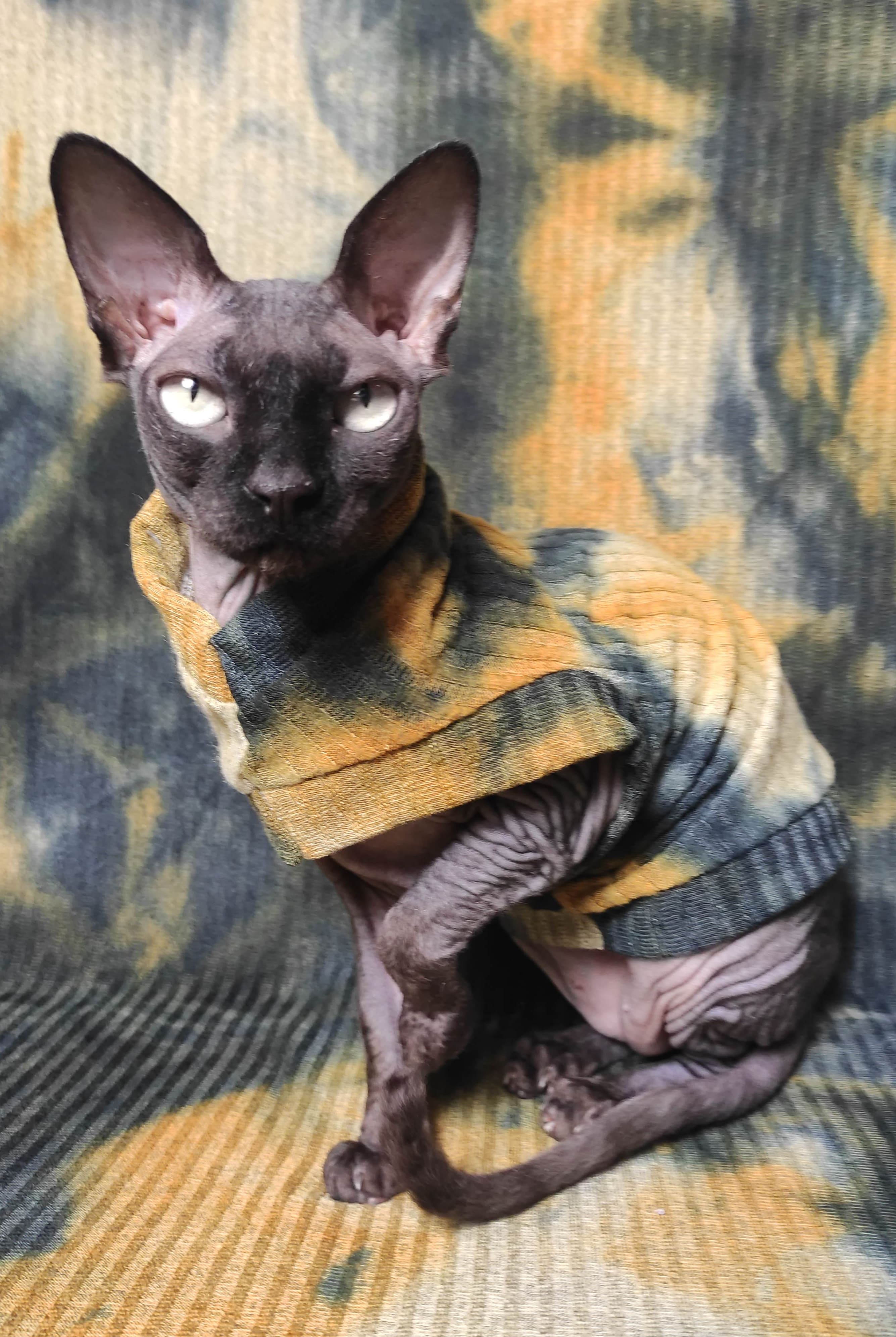 REGULAR size is for most adult hairless cats age 1 to 18. BAMBINO size fits hairless kittens age 6 months to 1 year and smaller adult cats. ANKLE BITER size fits kittens 15 weeks to 6 month olds. LIL NIPPER size fits hairless kittens age 8 weeks to 15 week olds for when they are with the breeder or for the trip home. Custom orders are welcome for larger and smaller cats - pricing is the same - $27.50