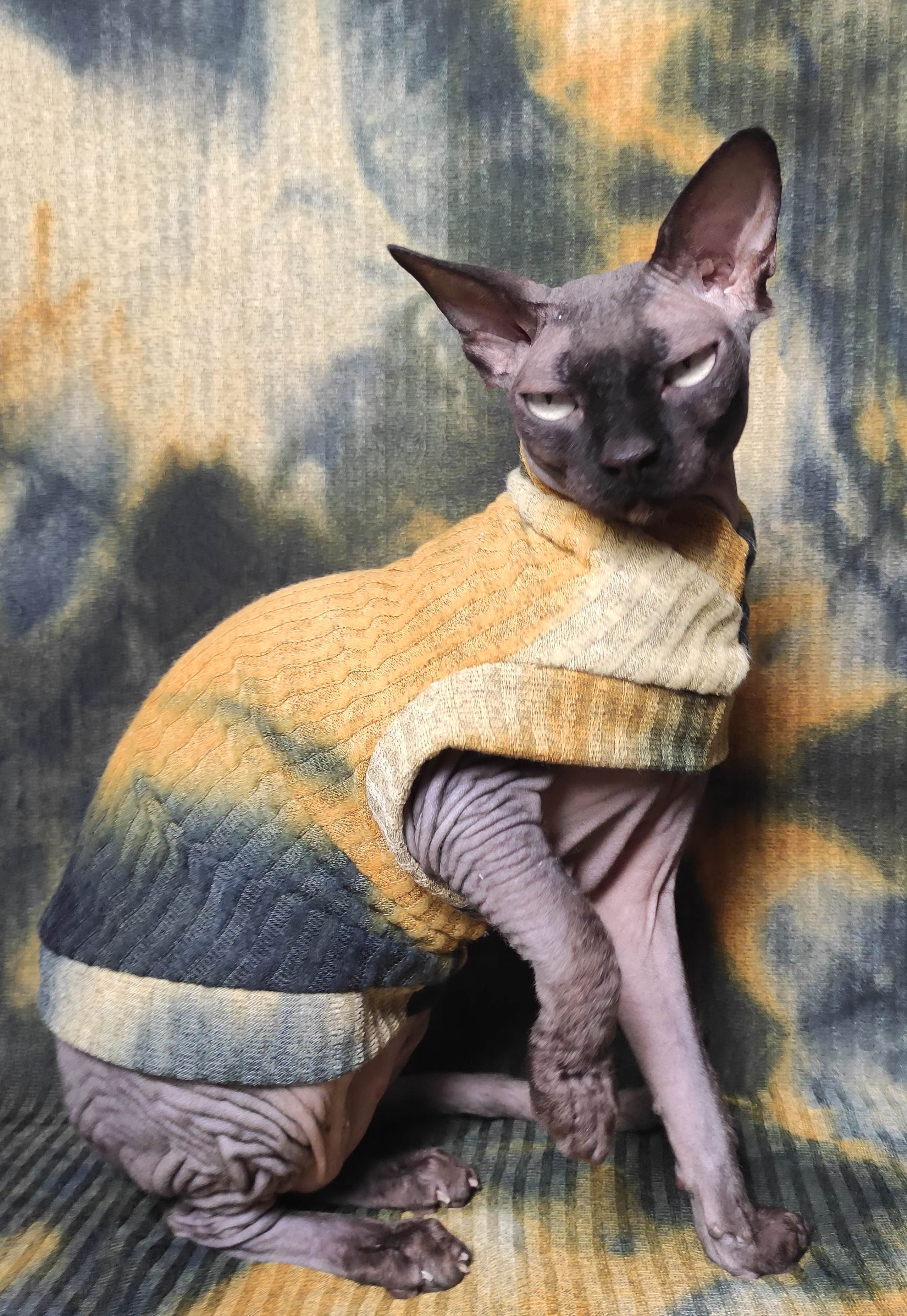 These sweaters fit like no other sweaters. Our original pattern has one hole for both front legs rather than individual holes. The unique design makes it easy to put on and take off, while allowing for improved mobility of your cat. No annoying Velcro anywhere. No awkward walking. All sweaters are machine washable and dryer safe unless specifically mentioned.