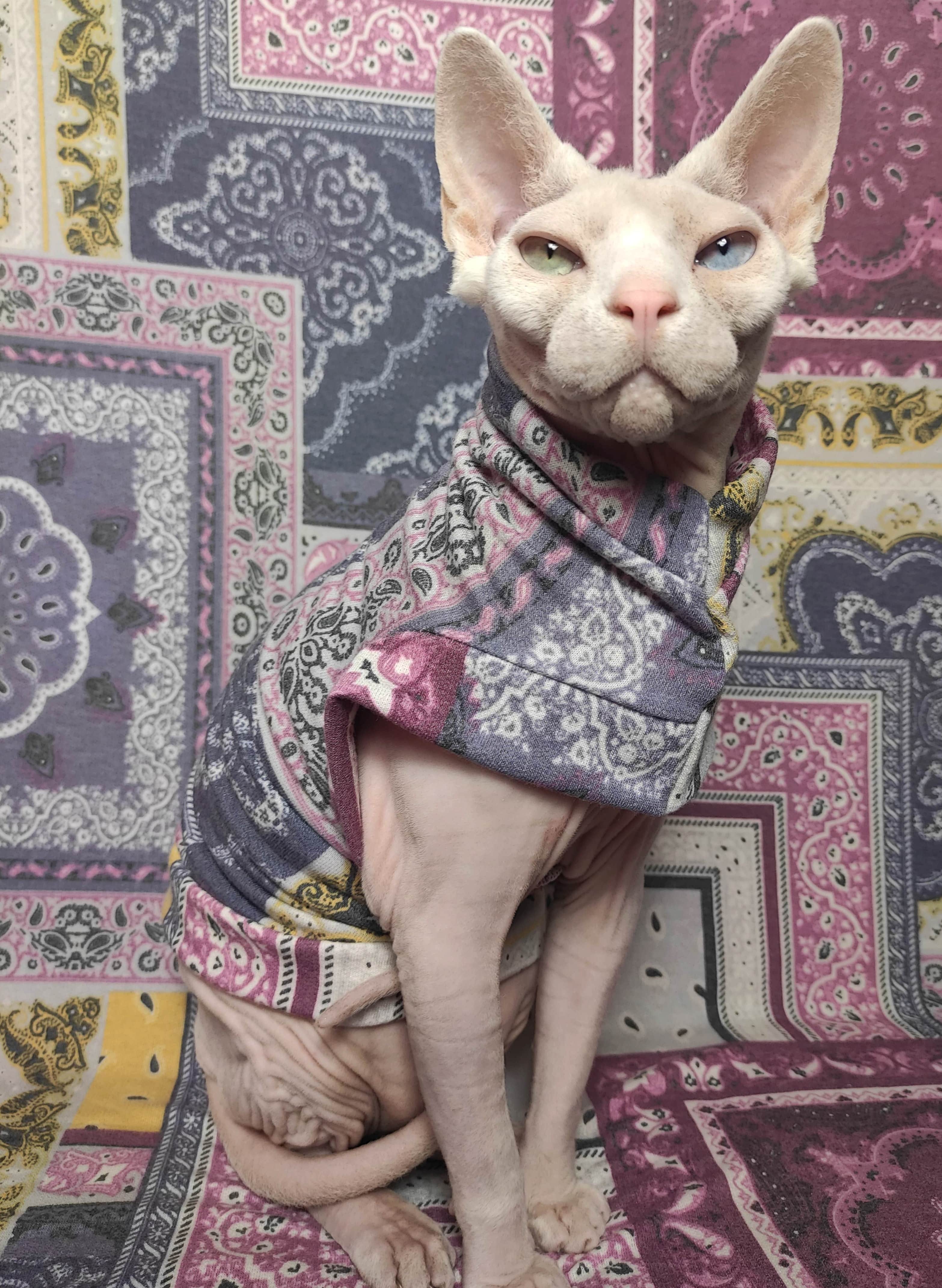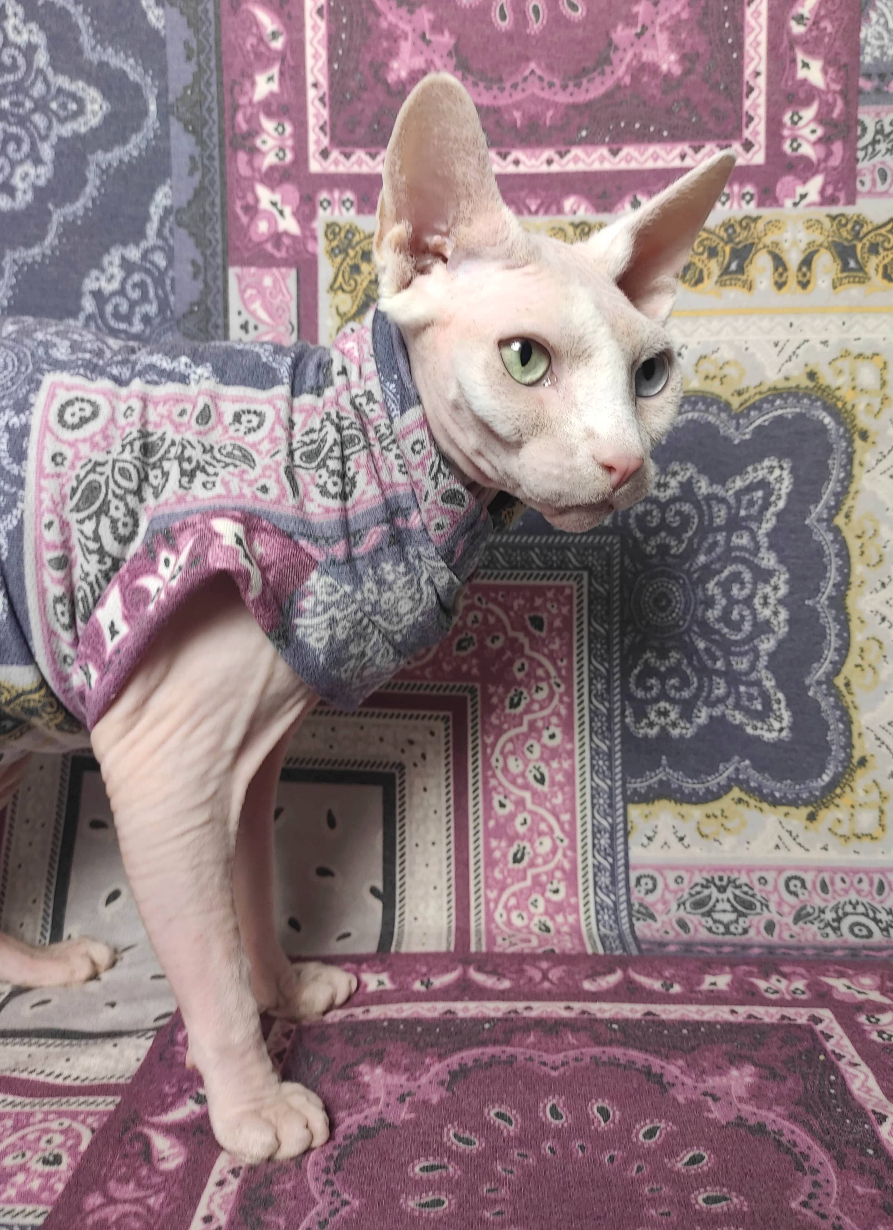 REGULAR size is for most adult hairless cats age 1 to 18. BAMBINO size fits hairless kittens age 6 months to 1 year and smaller adult cats. ANKLE BITER size fits kittens 15 weeks to 6 month olds. LIL NIPPER size fits hairless kittens age 8 weeks to 15 week olds for when they are with the breeder or for the trip home. Custom orders are welcome for larger and smaller cats - pricing is the same - $27.50
