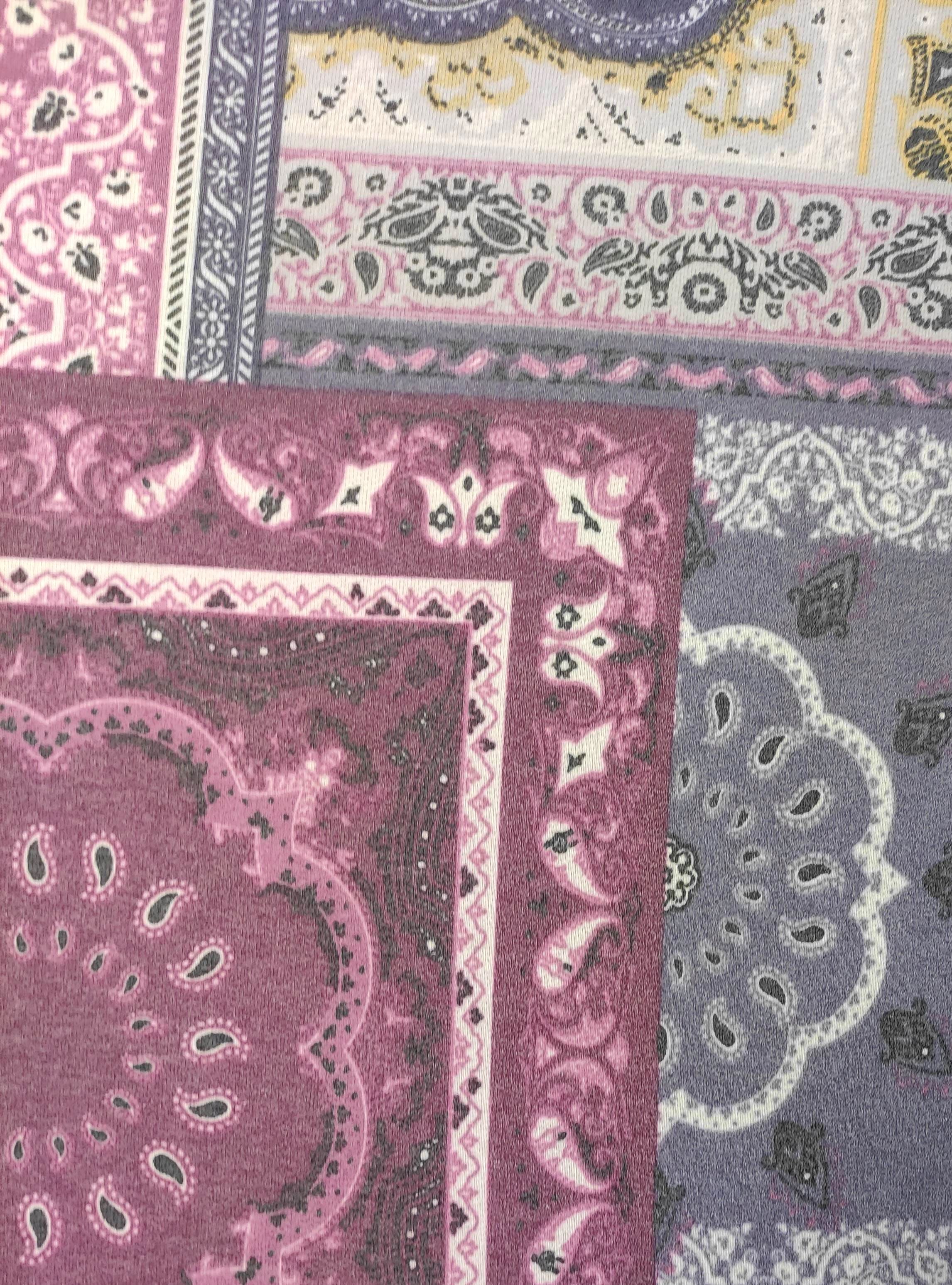 This is a lightweight stretchy fabric with looped interior, with printed bandana/ paisley pattern in Spring colors. Regular Size limited to only 8, Bambino Size is limited to only 10, Ankle Biter Size is limited to 2, Lil Nipper Size is limited to 2. No more will be made when they are gone.