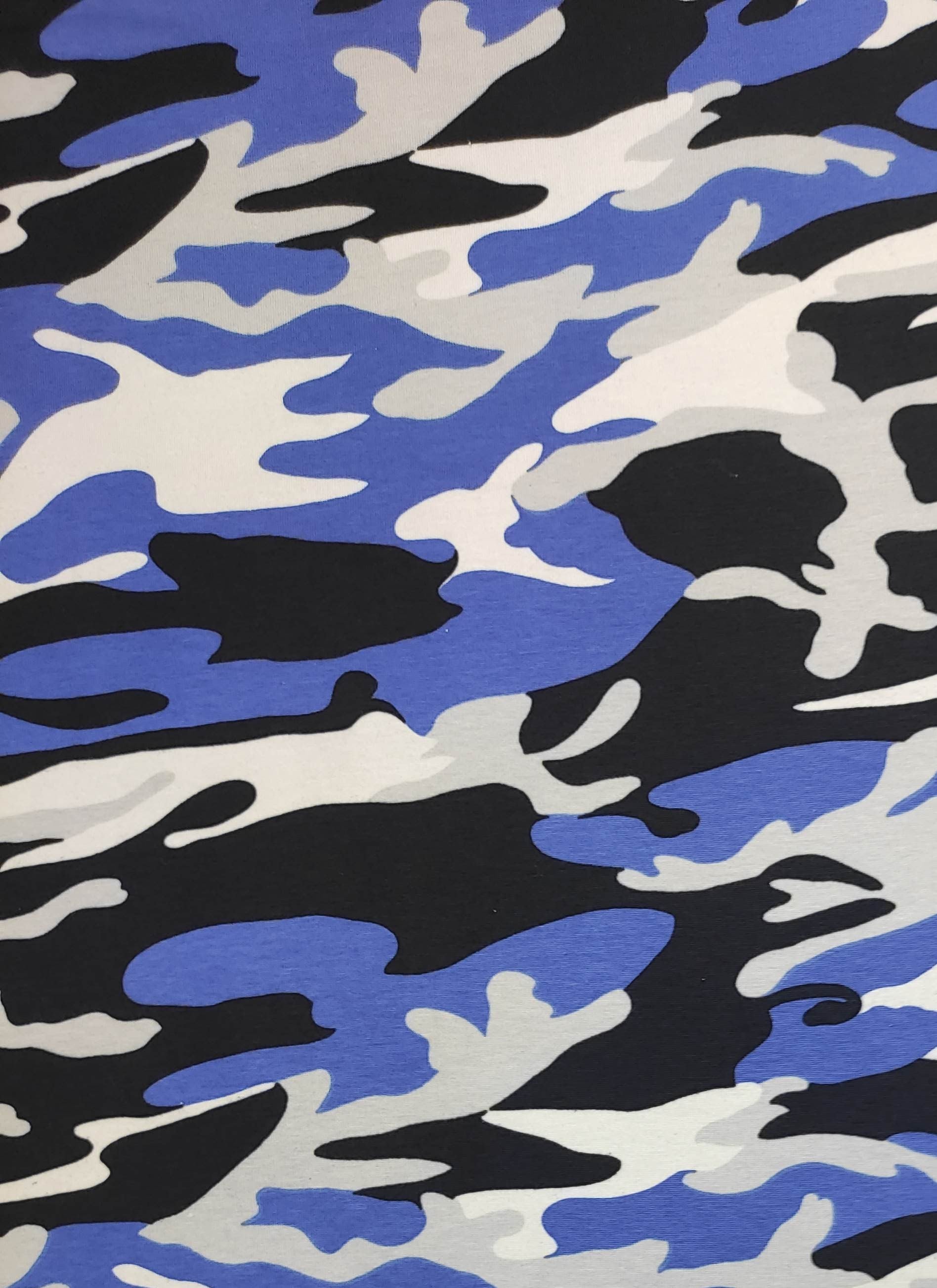 This is a soft stretchy cotton spandex with printed blue, black and white camouflage fabric with black velvet trim. Regular Size limited to only 8. Bambino Size is limited to only 7. Ankle Biter Size is limited to 2, Lil Nipper Size is limited to 2. No more will be made when they are gone.