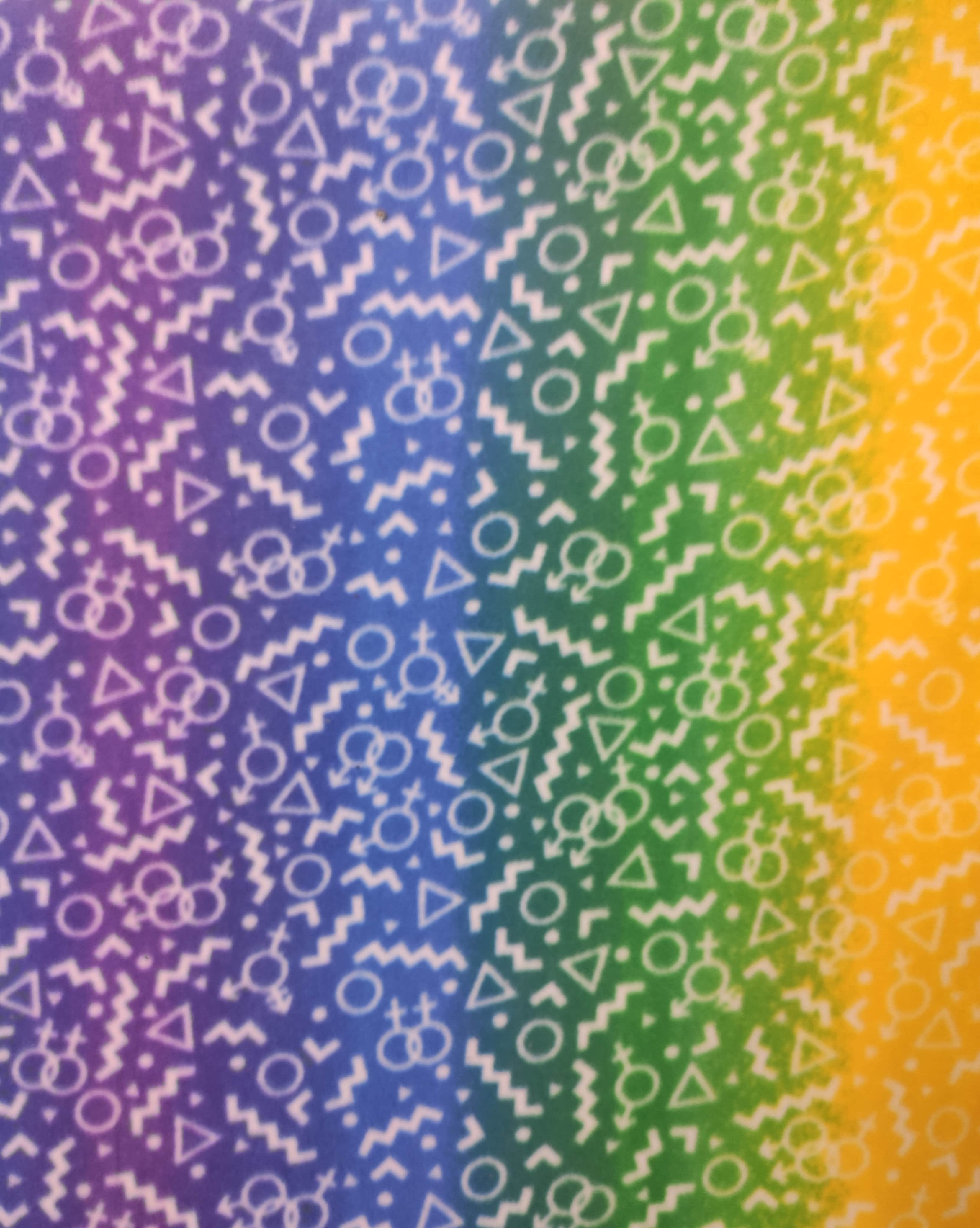 This is a soft luxe medium weight stretchy rainbow fleece with inclusive symbols throughout 😻