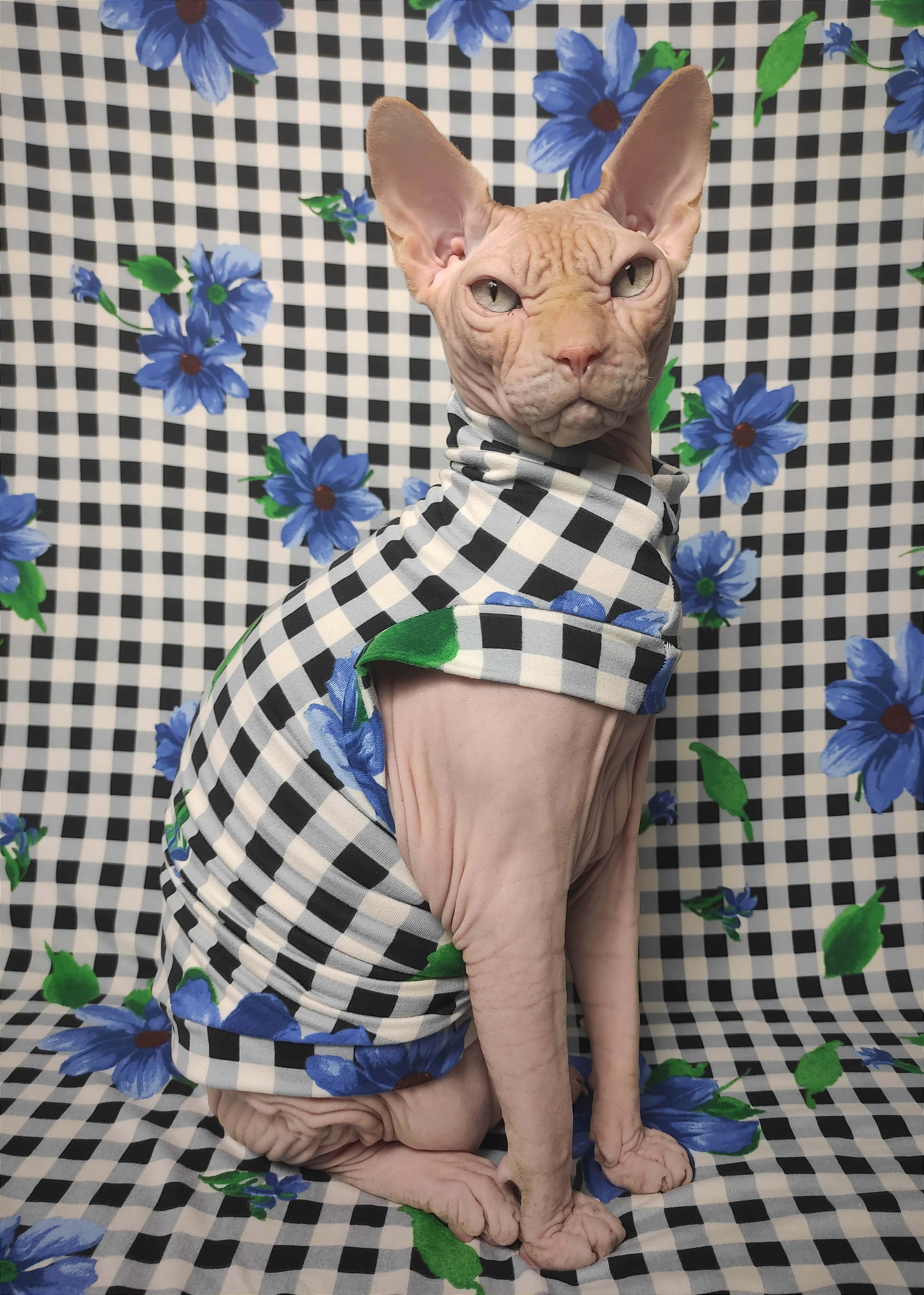 This sleepwear is a beautiful stretchy cotton blend fabric with blue flowers on black and white buffalo check background. Made with special seams that minimize the seem profile. Swag Sleepwear has a slimmer fit, larger armholes, and smaller trim to provide extra snuggly comfort for sleeping or catnapping! Regular Size limited to only 7. Bambino Size is limited to only 8, Ankle Biter Size is limited to 2, Lil Nipper Size is limited to 2. No more will be made when they are gone.